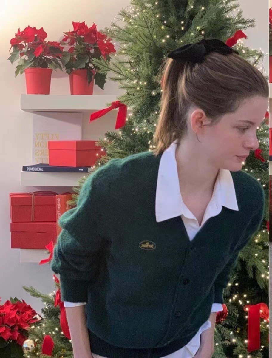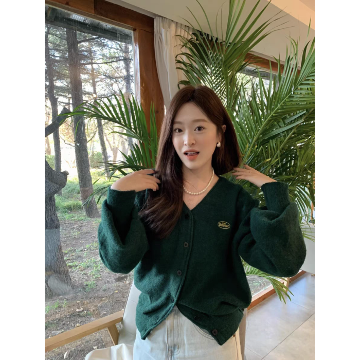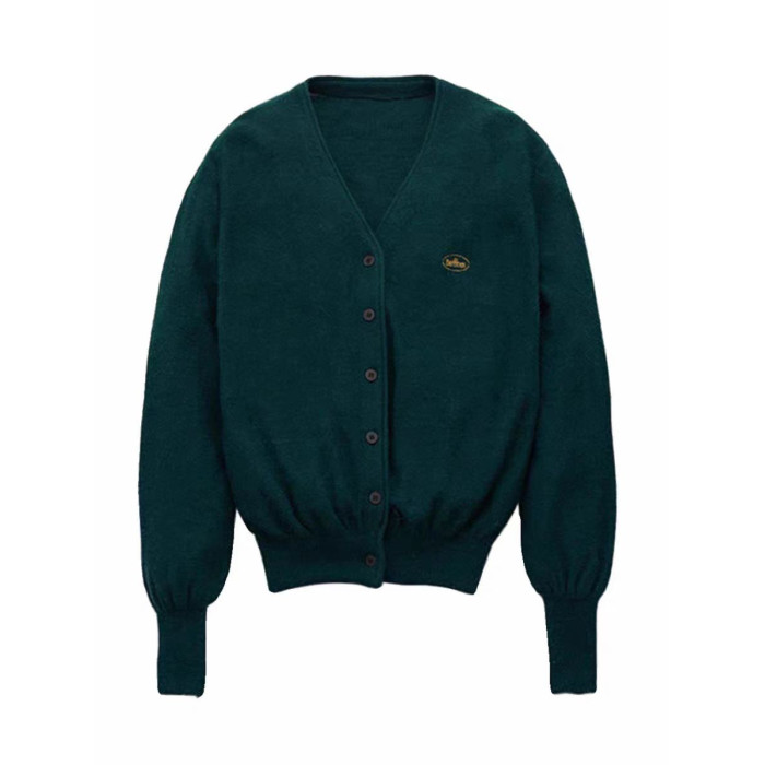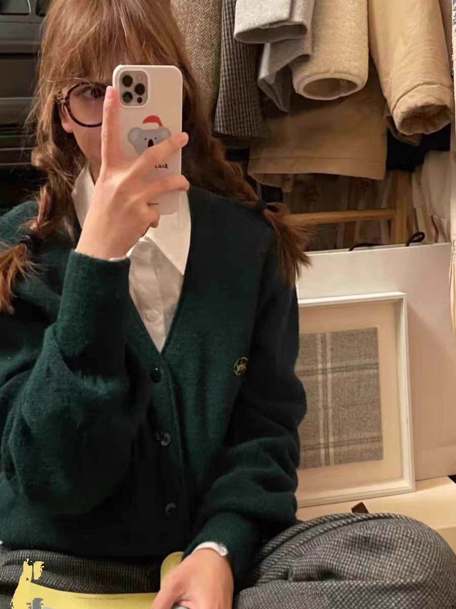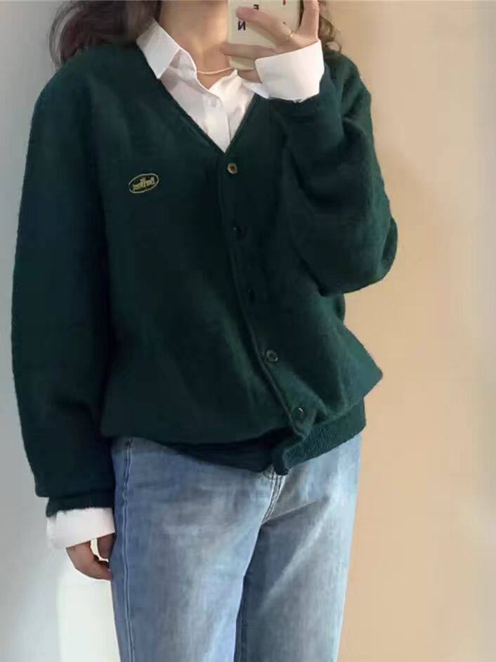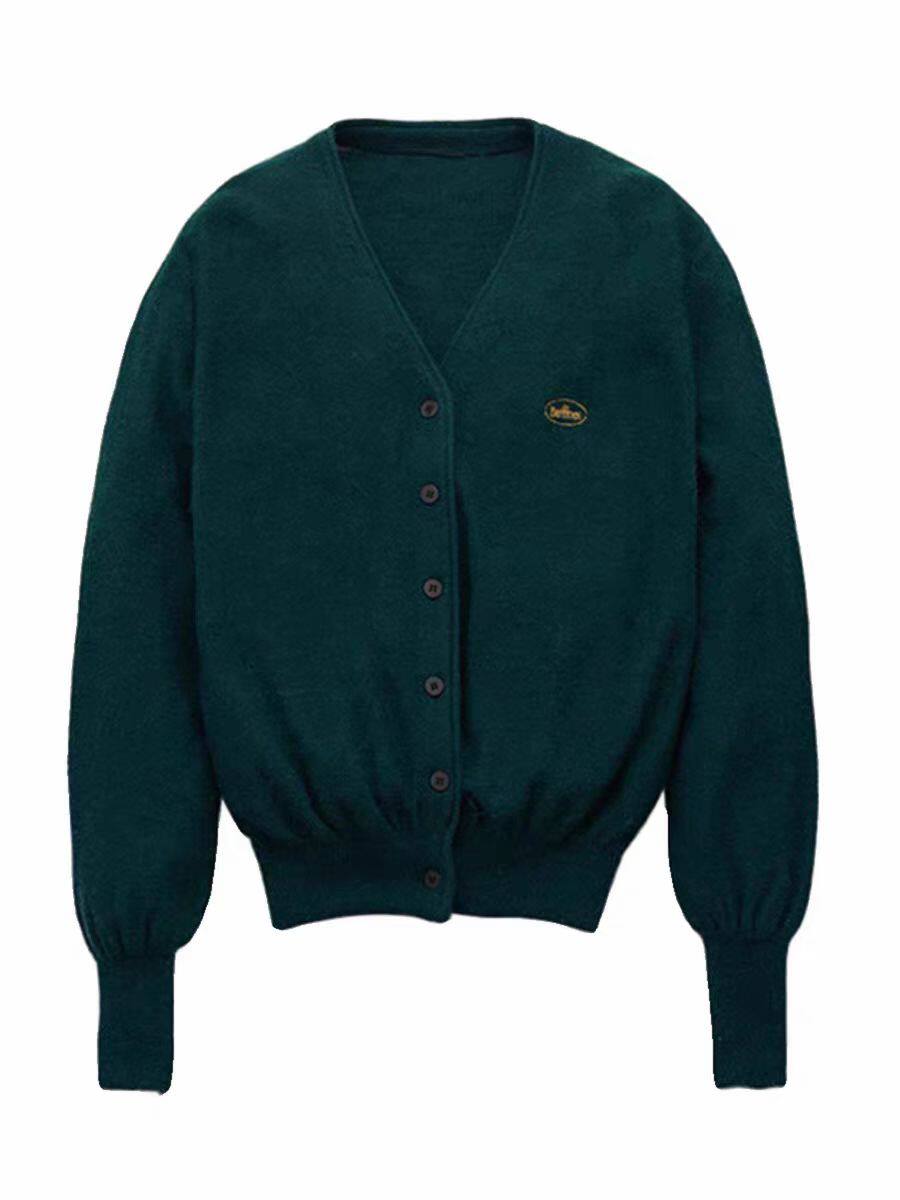 Brandy Girl復古聖誕綠V領長袖針織開衫紐釦外套BM字母刺綉毛衣女