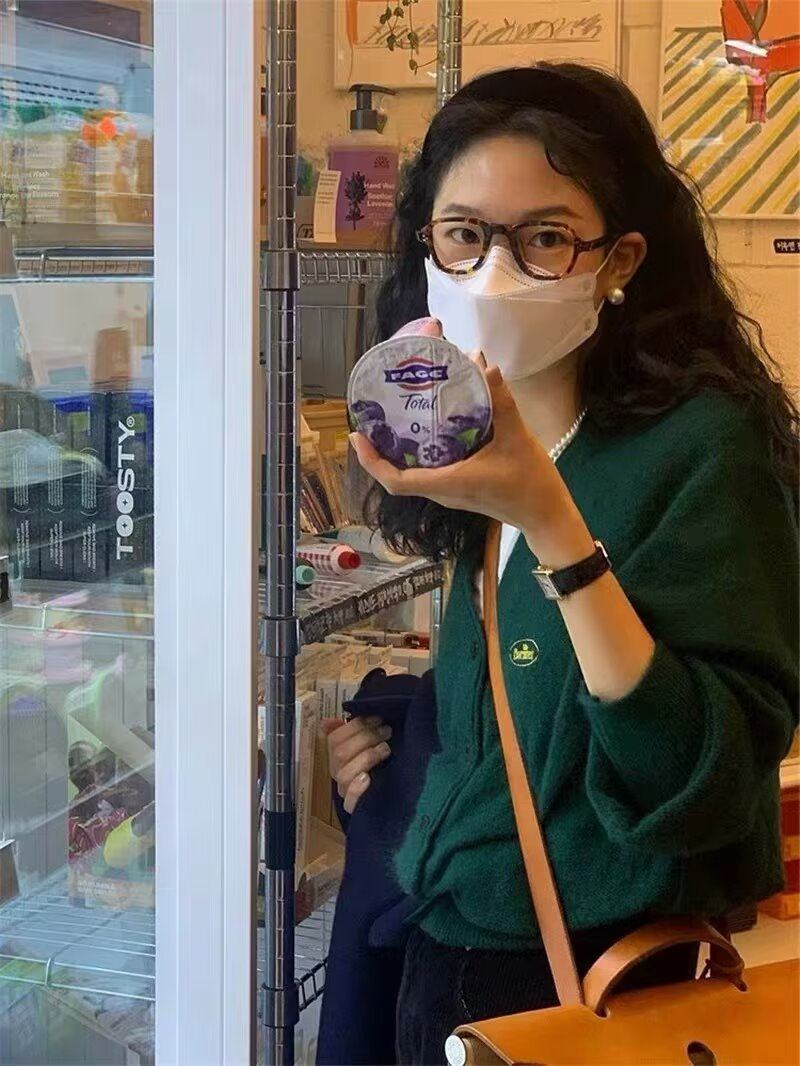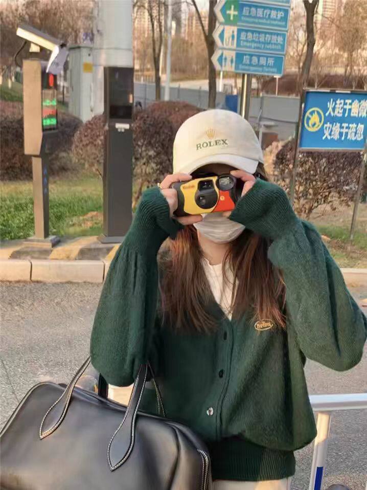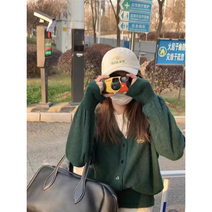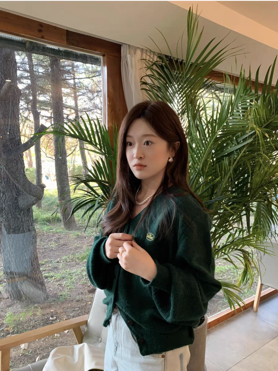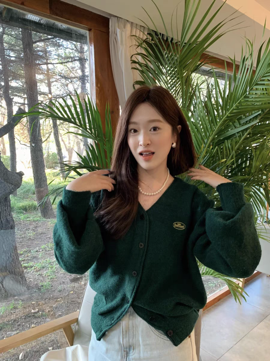 Brandy Girl復古聖誕綠V領長袖針織開衫紐釦外套BM字母刺綉毛衣女