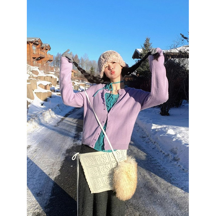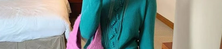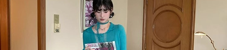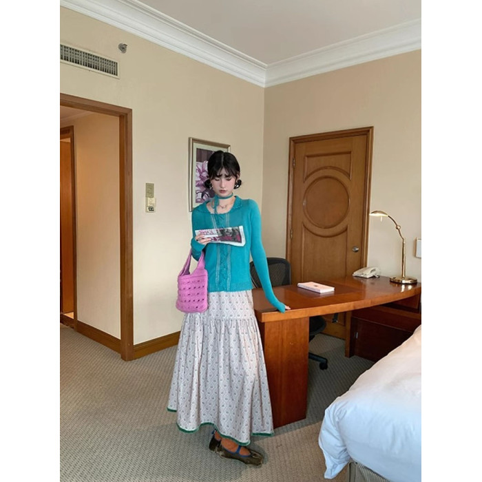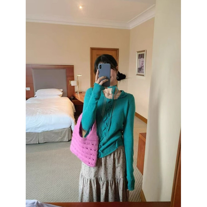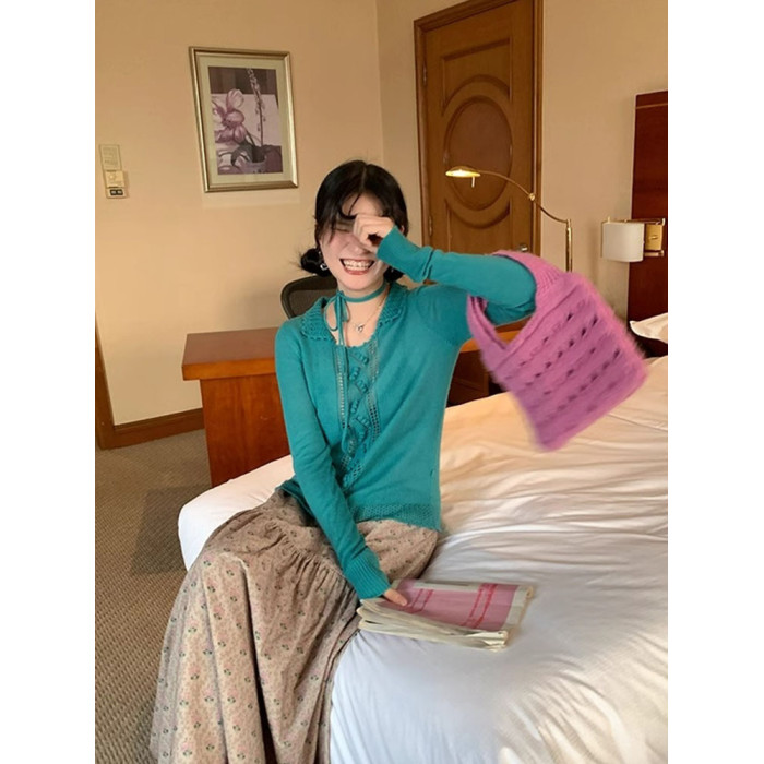 聖誕綠色花邊翻領毛衣女春季法式復古孔雀藍鏤空套頭針織上衣