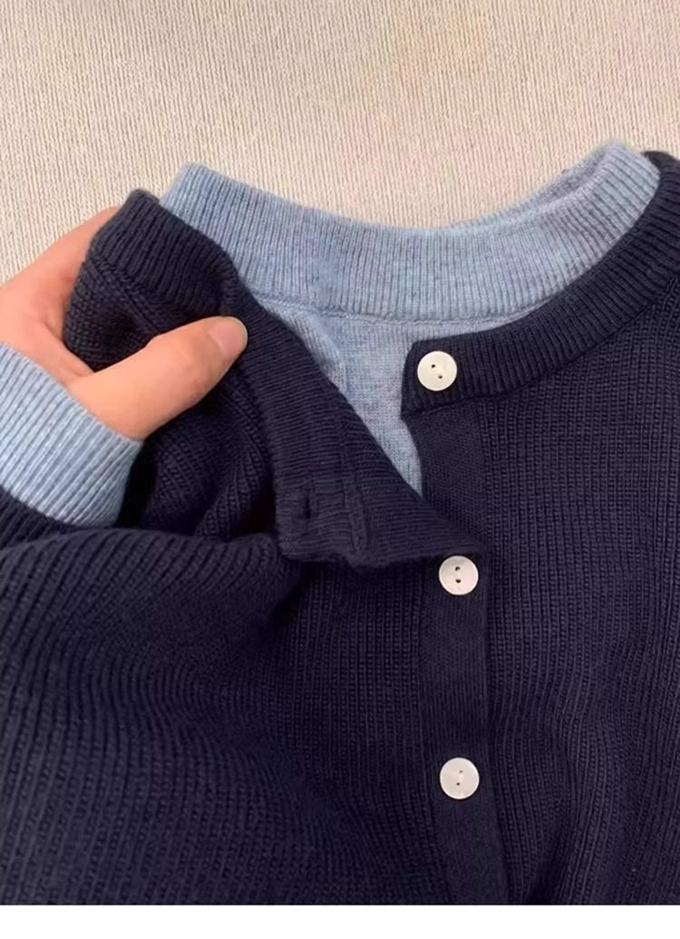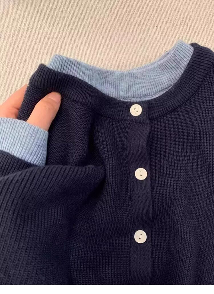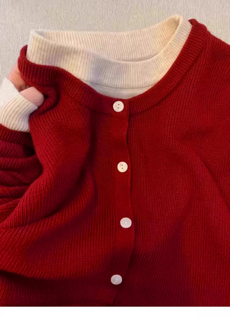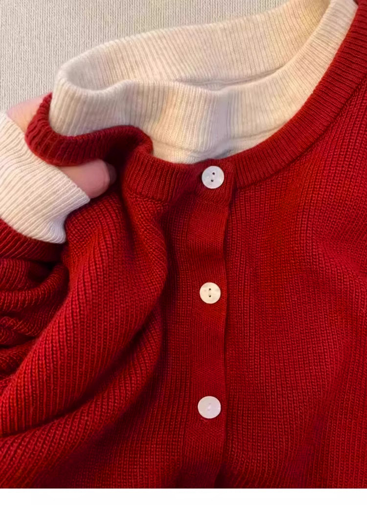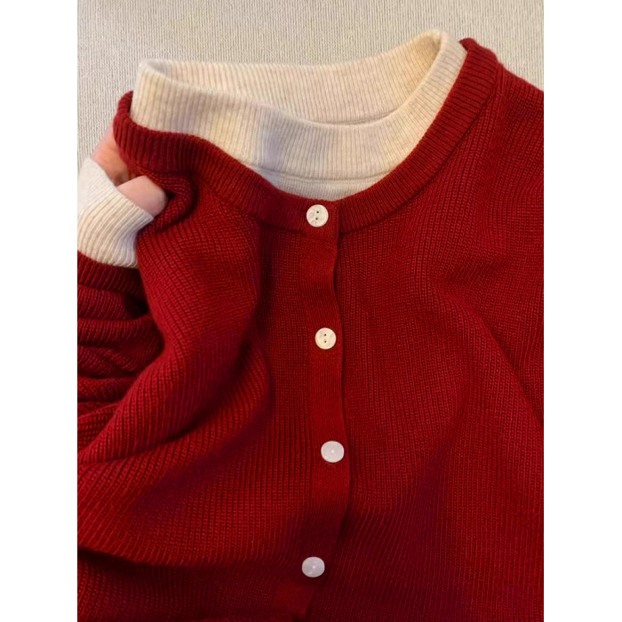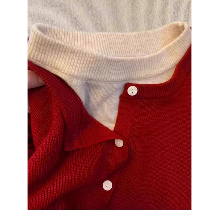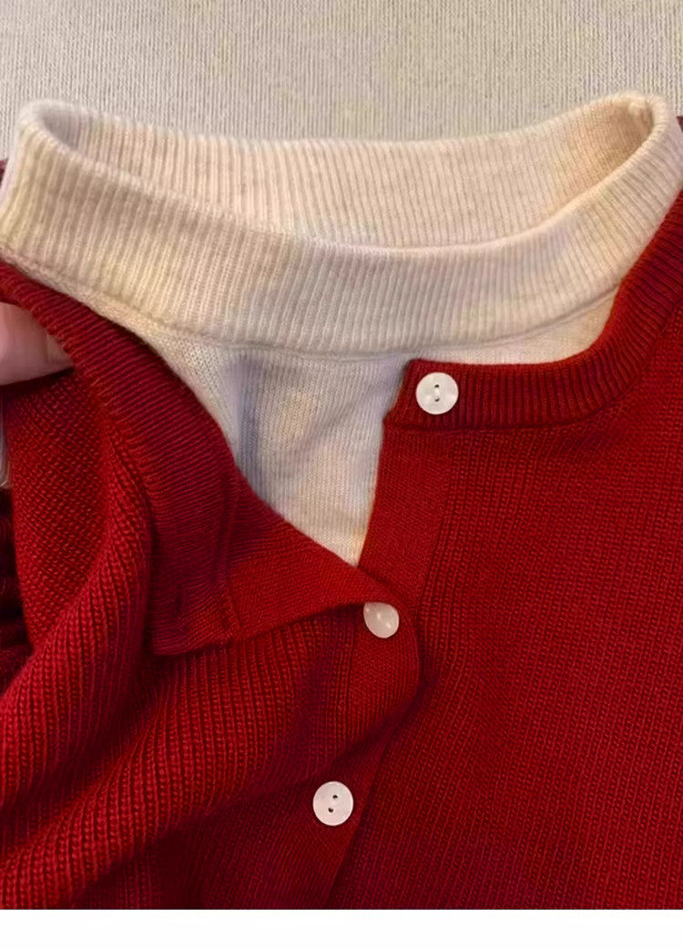 新年紅色高級感假兩件聖誕紅針織衫女秋冬慵懶風圓領打底內搭毛衣