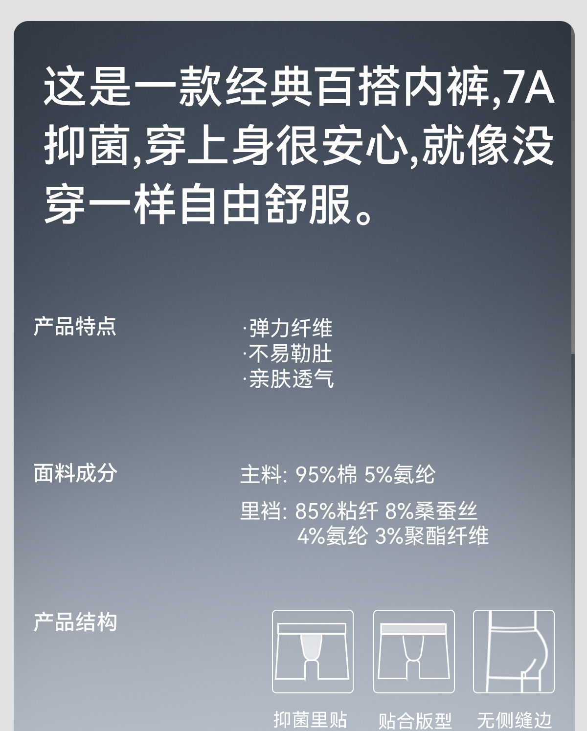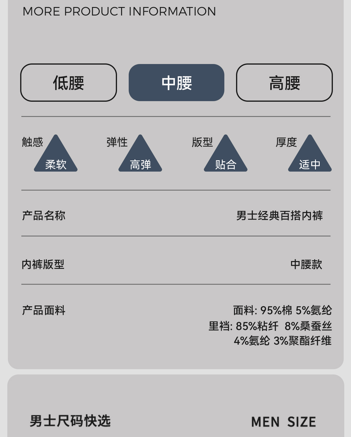 | 襠部材質成分 | 粘膠纖維(粘纖)85% 桑蠶絲8% 聚氨酯彈性纖維(氨綸)4% 聚酯纖維3% |