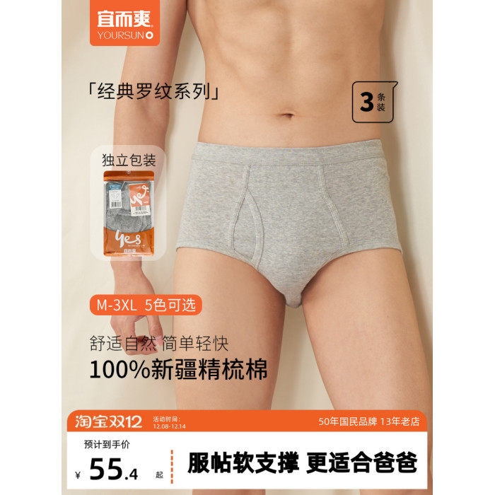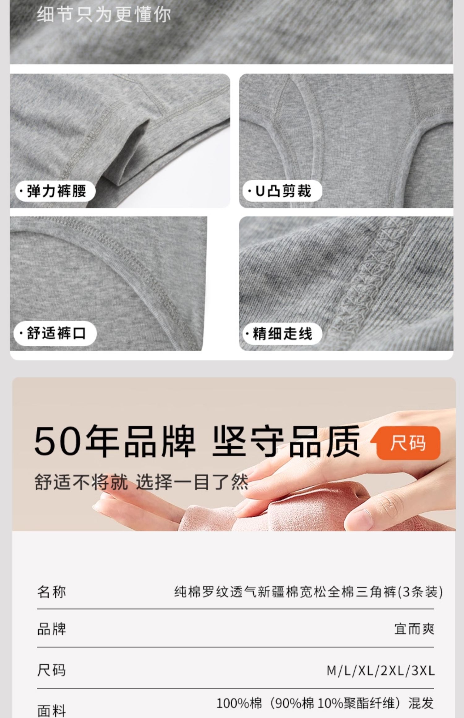 [3條]宜而爽羅紋純棉內褲男100%棉寬松高腰三角褲中老年爸爸褲衩