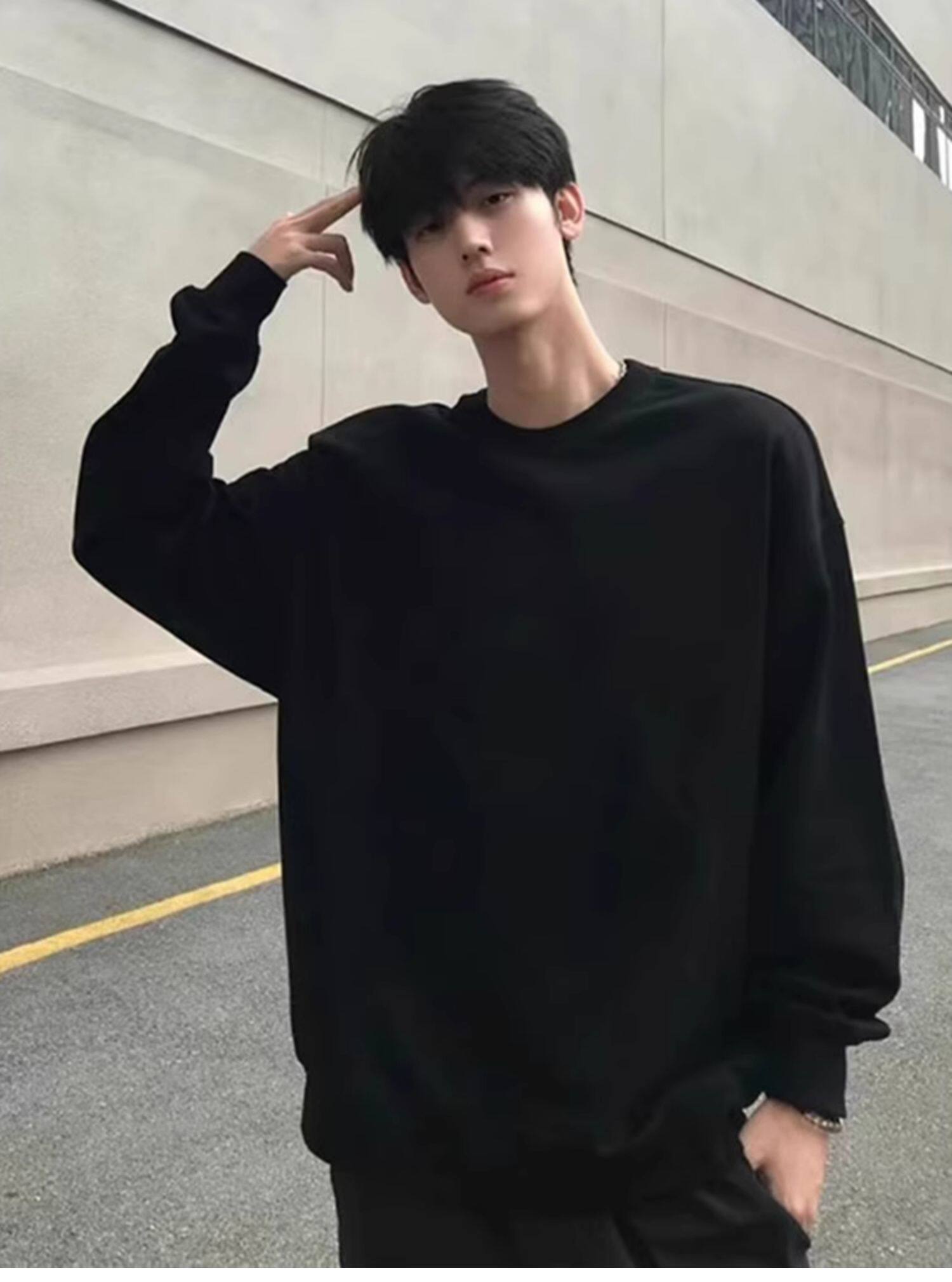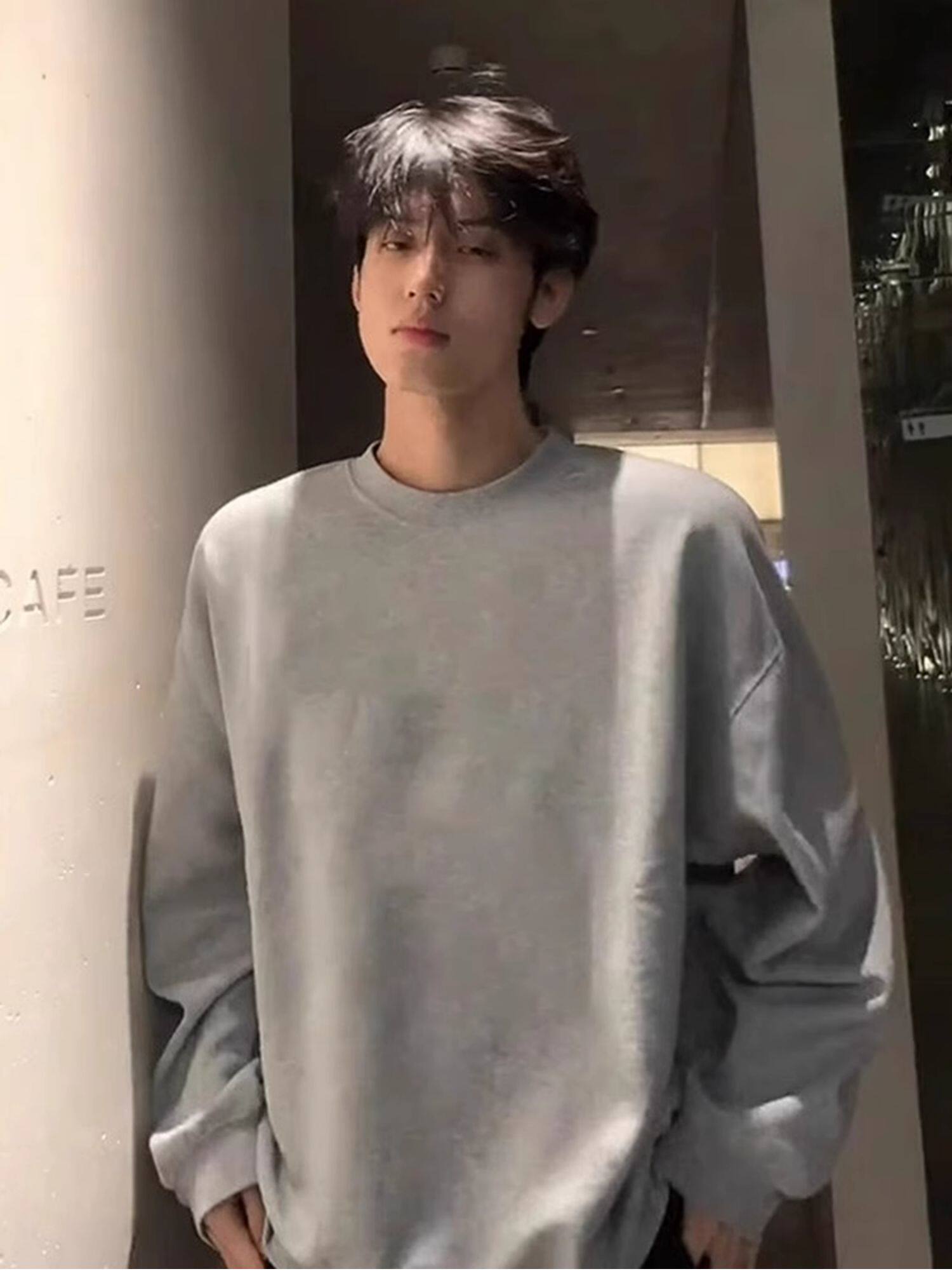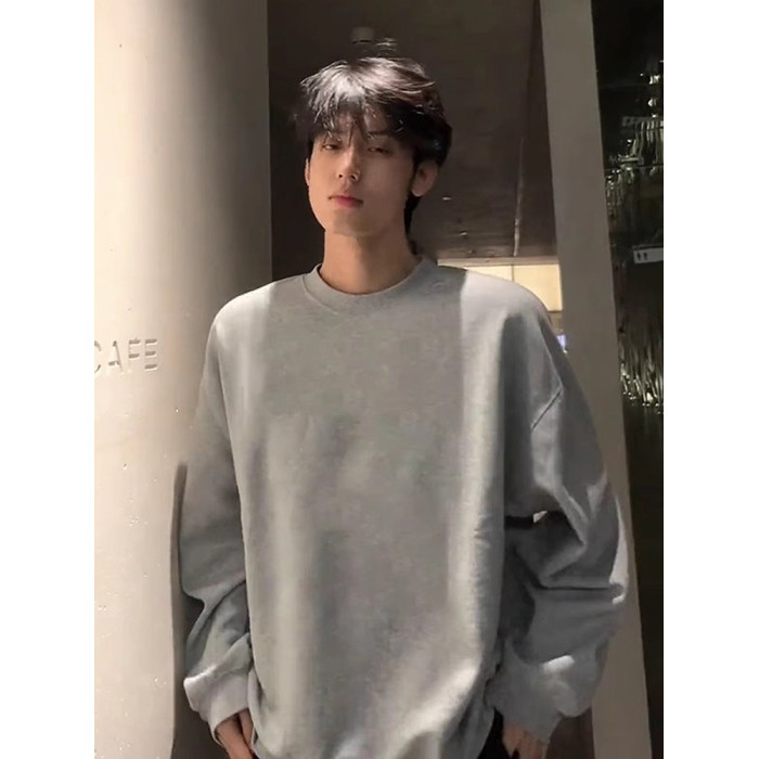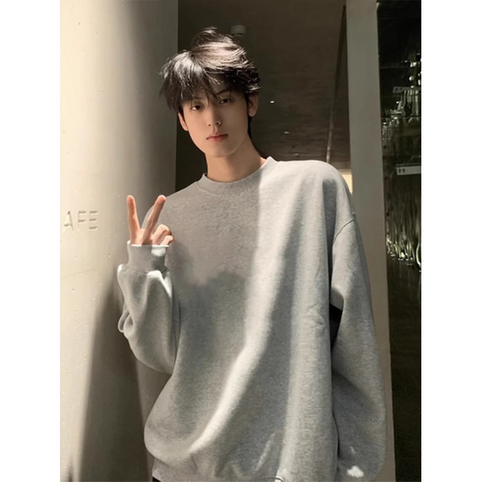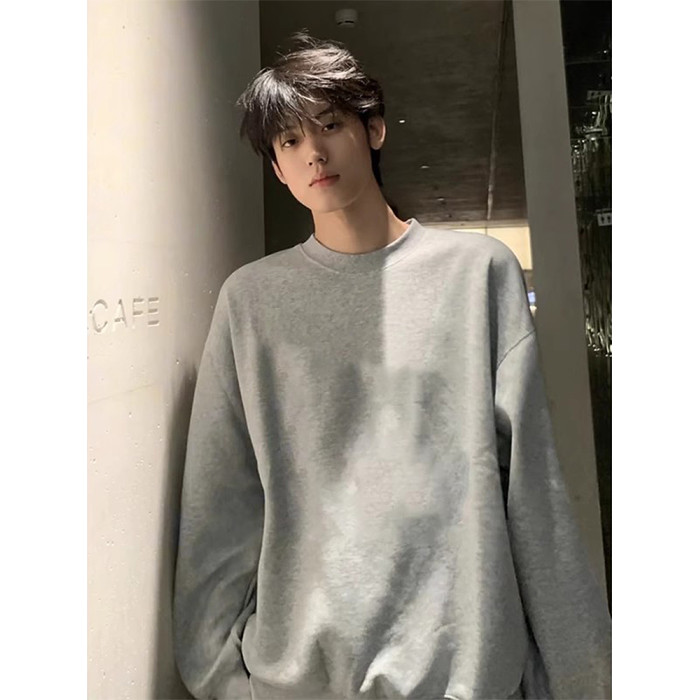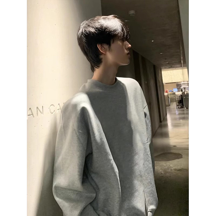 淺花灰色美式復古衛衣男款秋冬小領口長袖t恤重磅加絨內搭打底衫