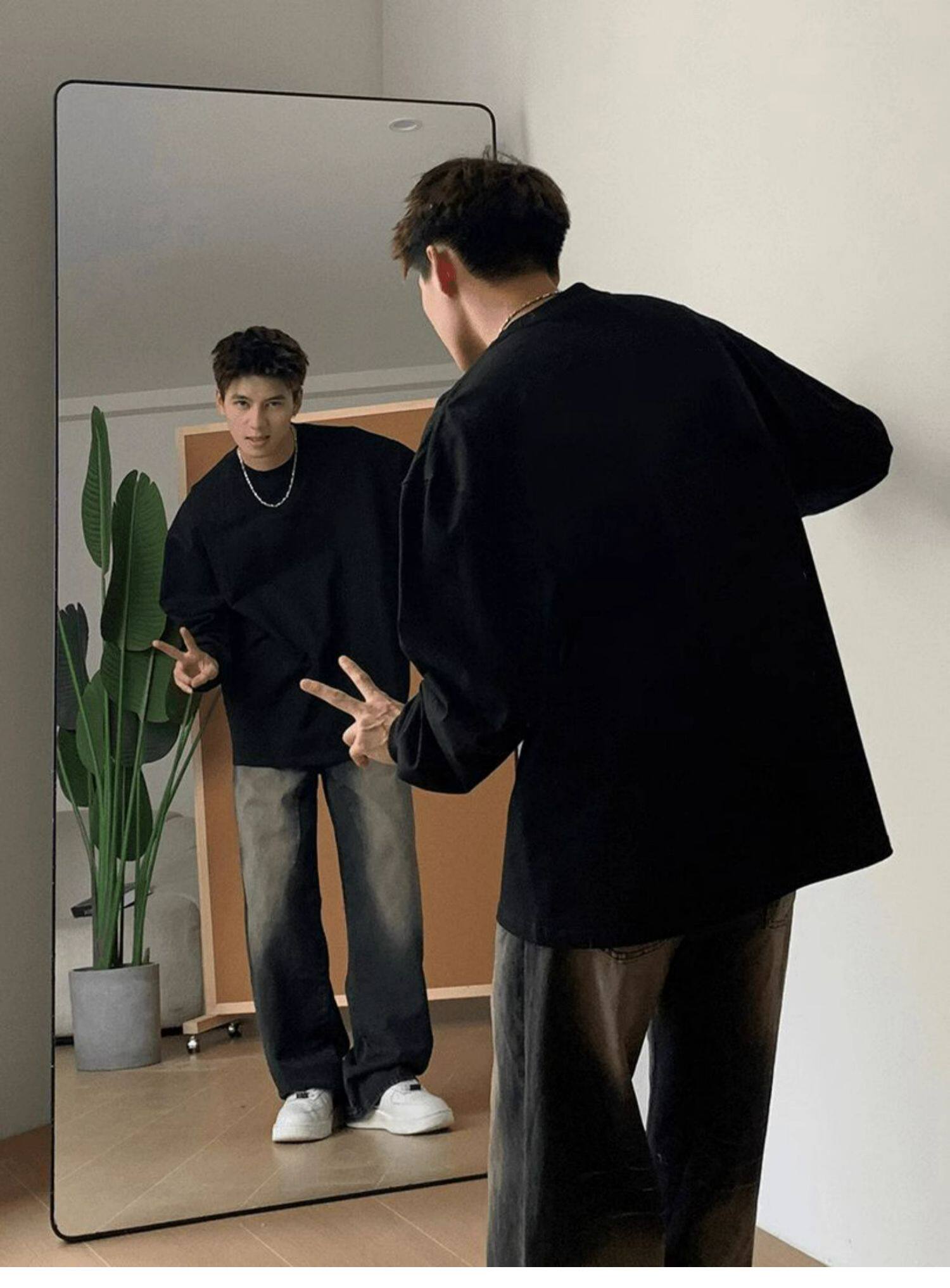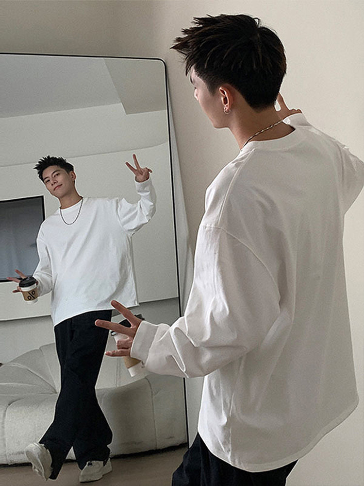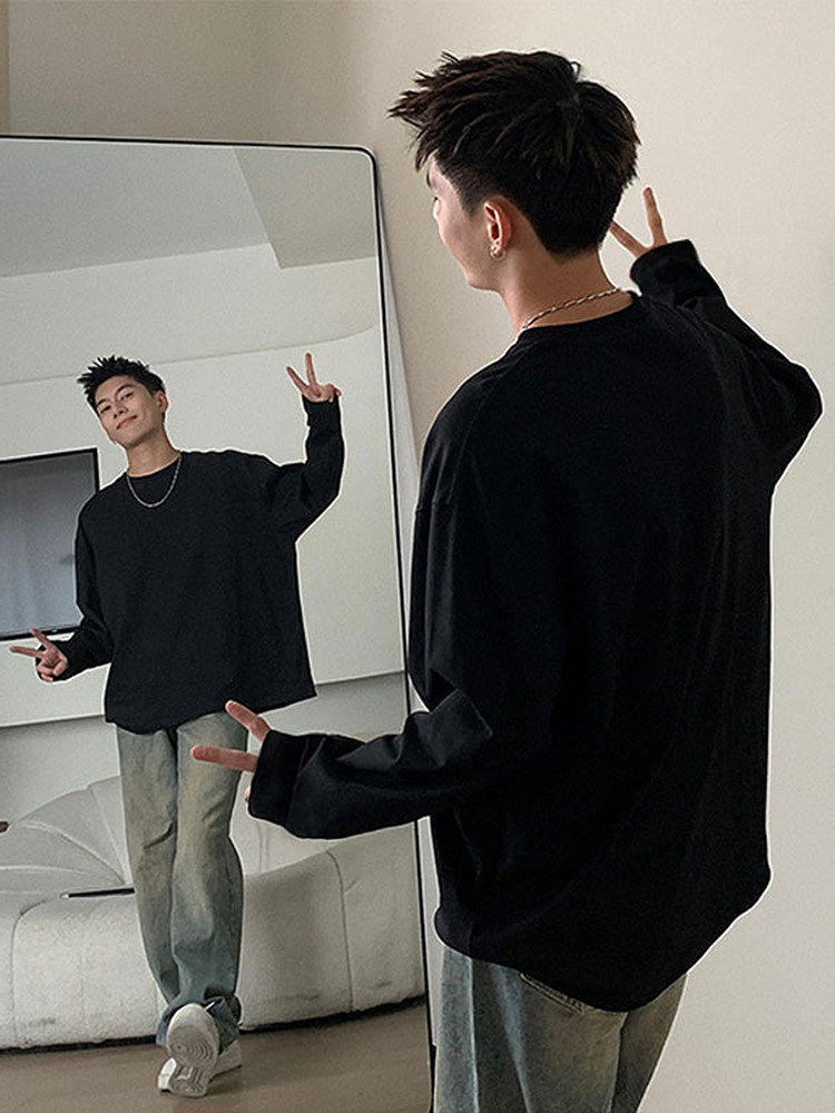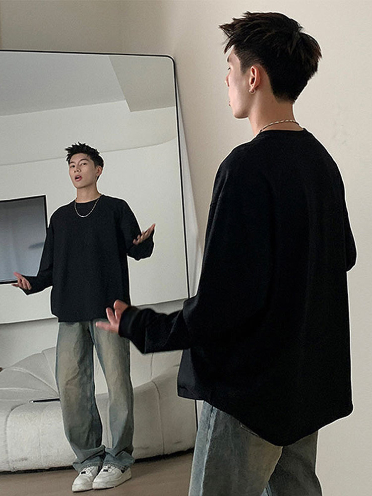 淺花灰色美式復古衛衣男款秋冬小領口長袖t恤重磅加絨內搭打底衫