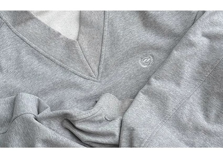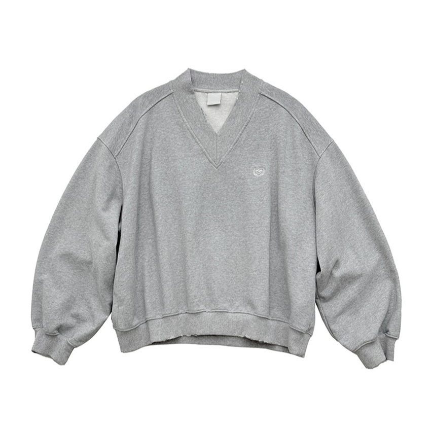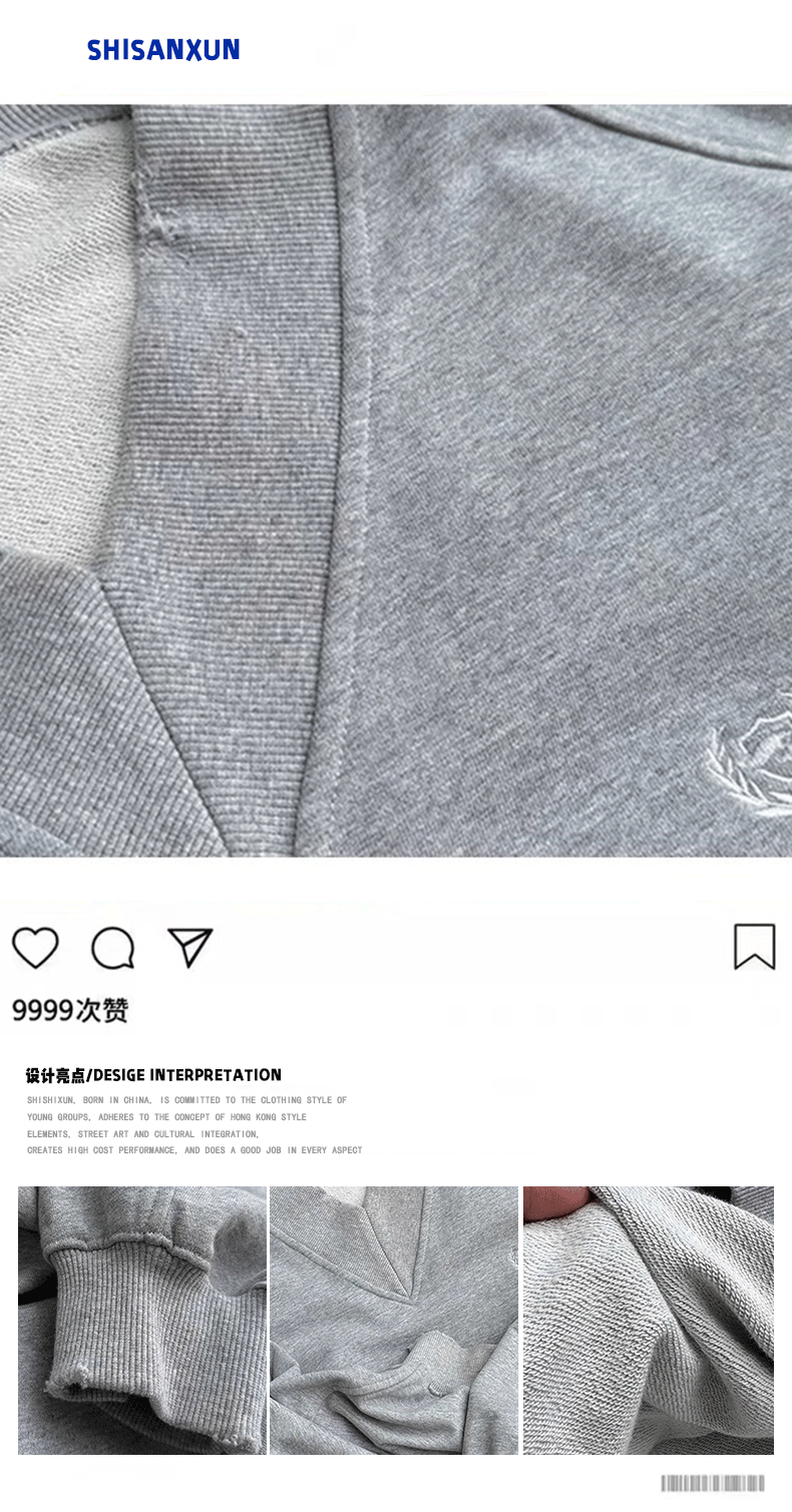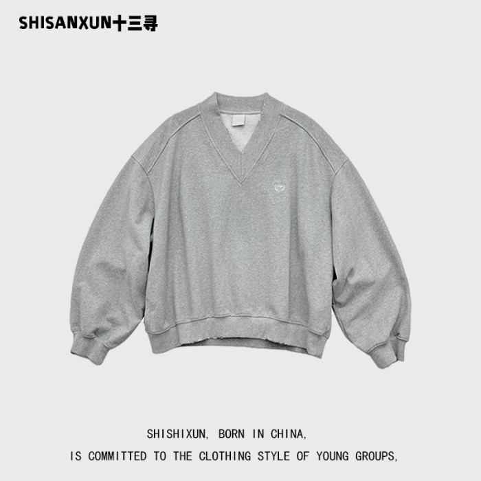 SHISANXUN秋季復古學院領短寬衛衣破損做舊大V領運動街頭套頭上衣