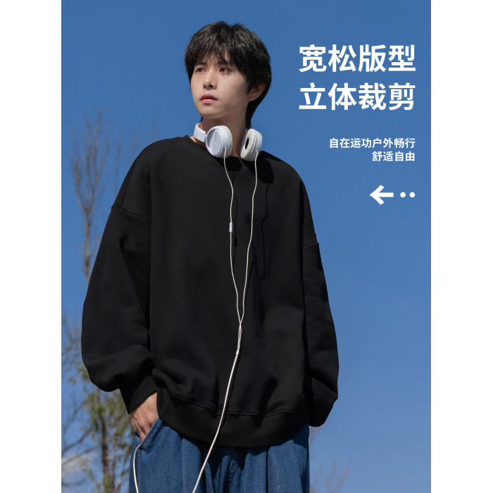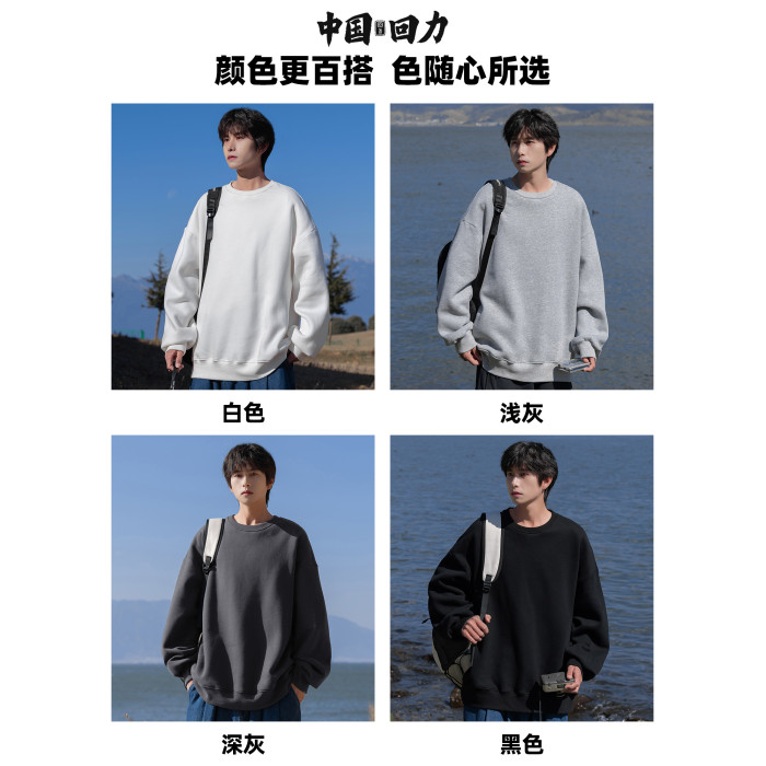 迴力白色加絨圓領衛衣男士春秋冬季青少年重磅長袖打底衫男生上衣