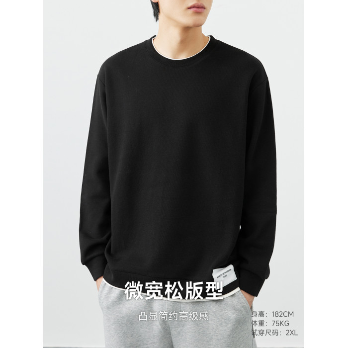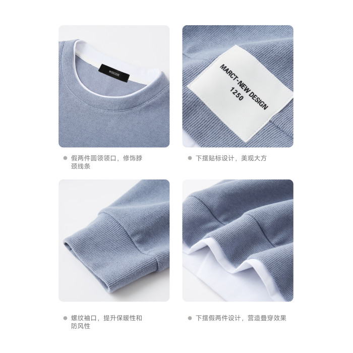WOOG2005加絨加厚純色假兩件圓領男士衛衣2025秋冬季新款休閒上衣