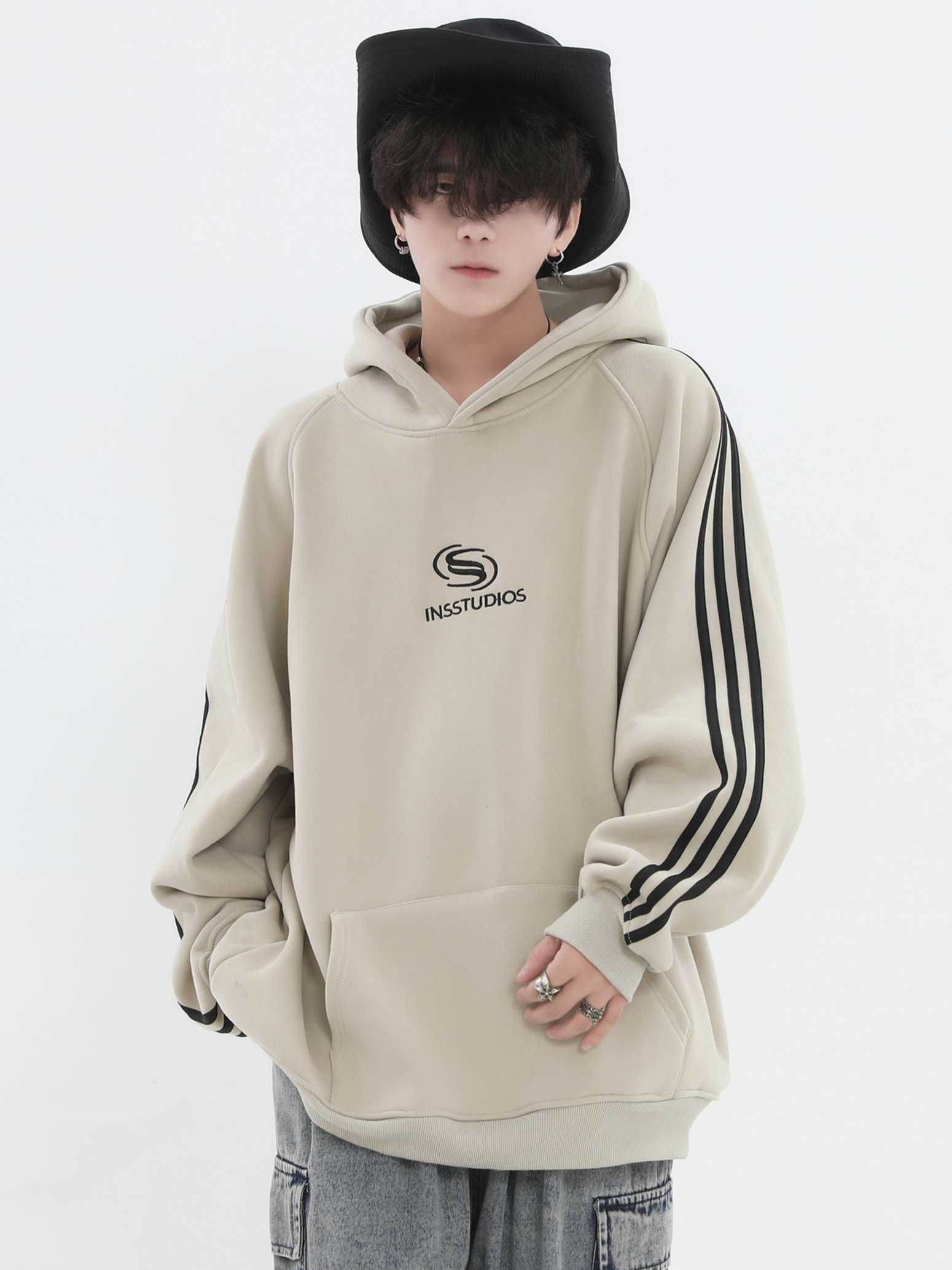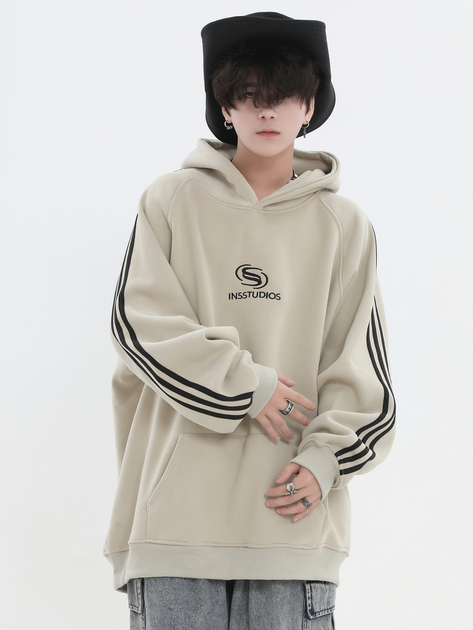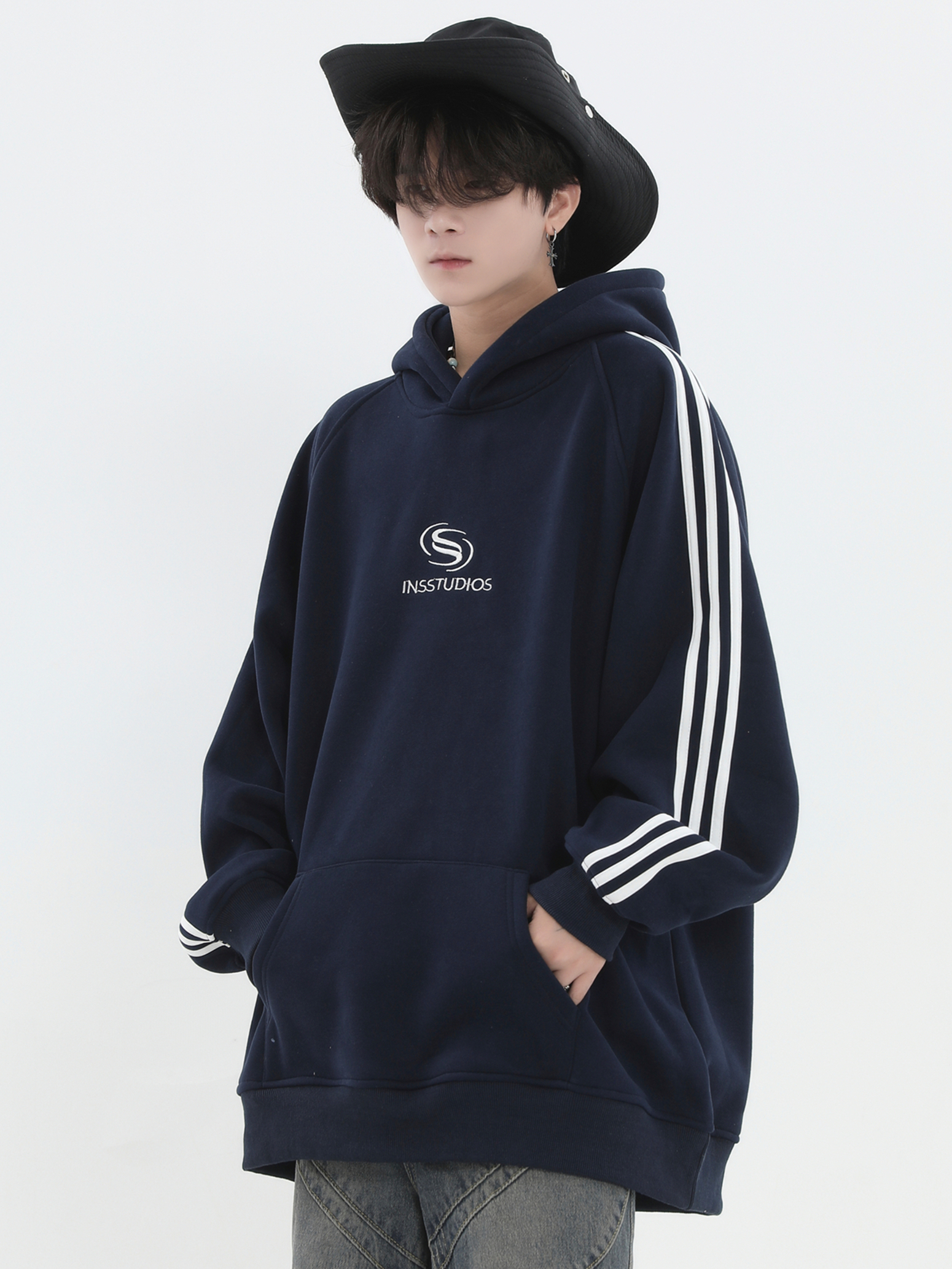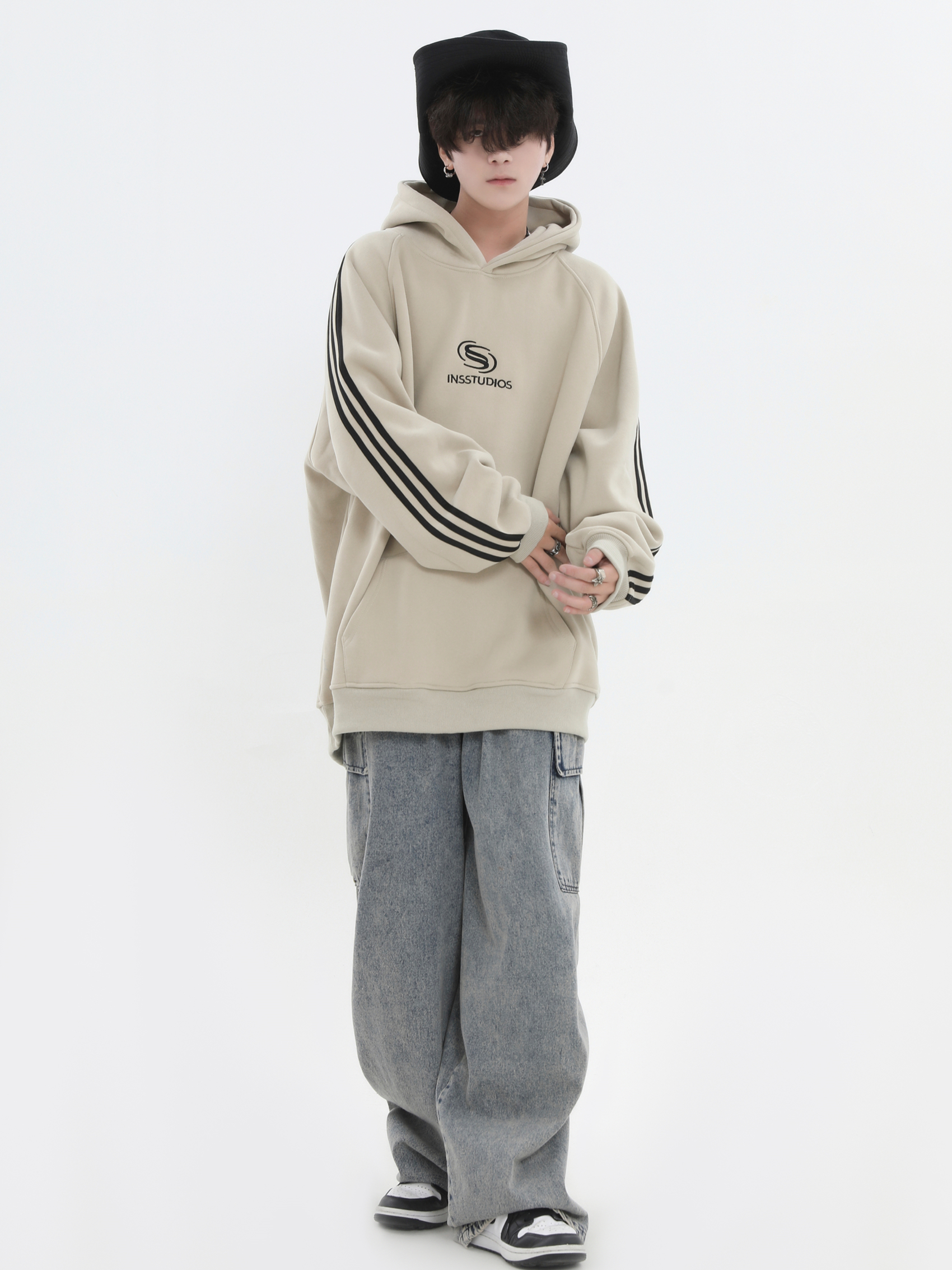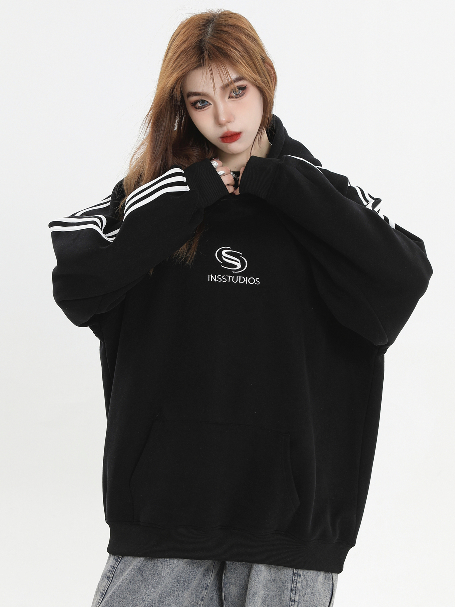INSstudios 國潮牌情侶美式小三條杠條紋衛衣重磅加絨連帽衫