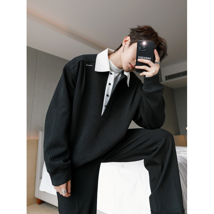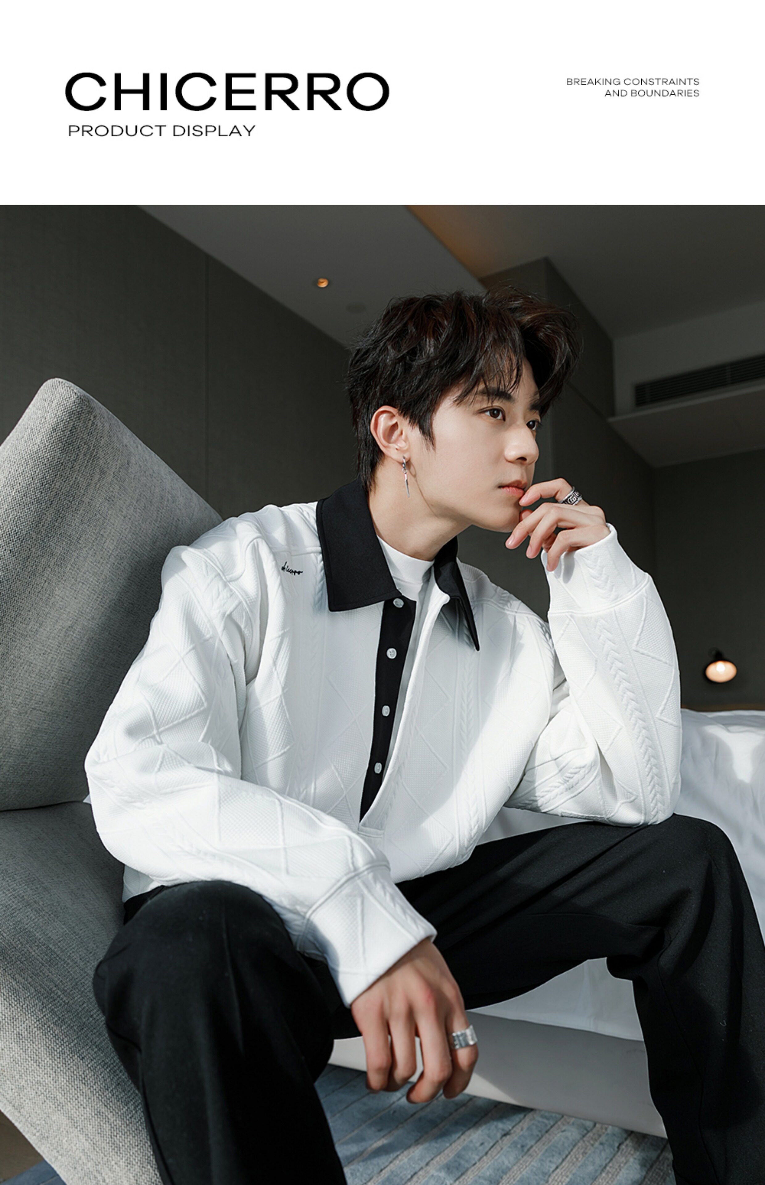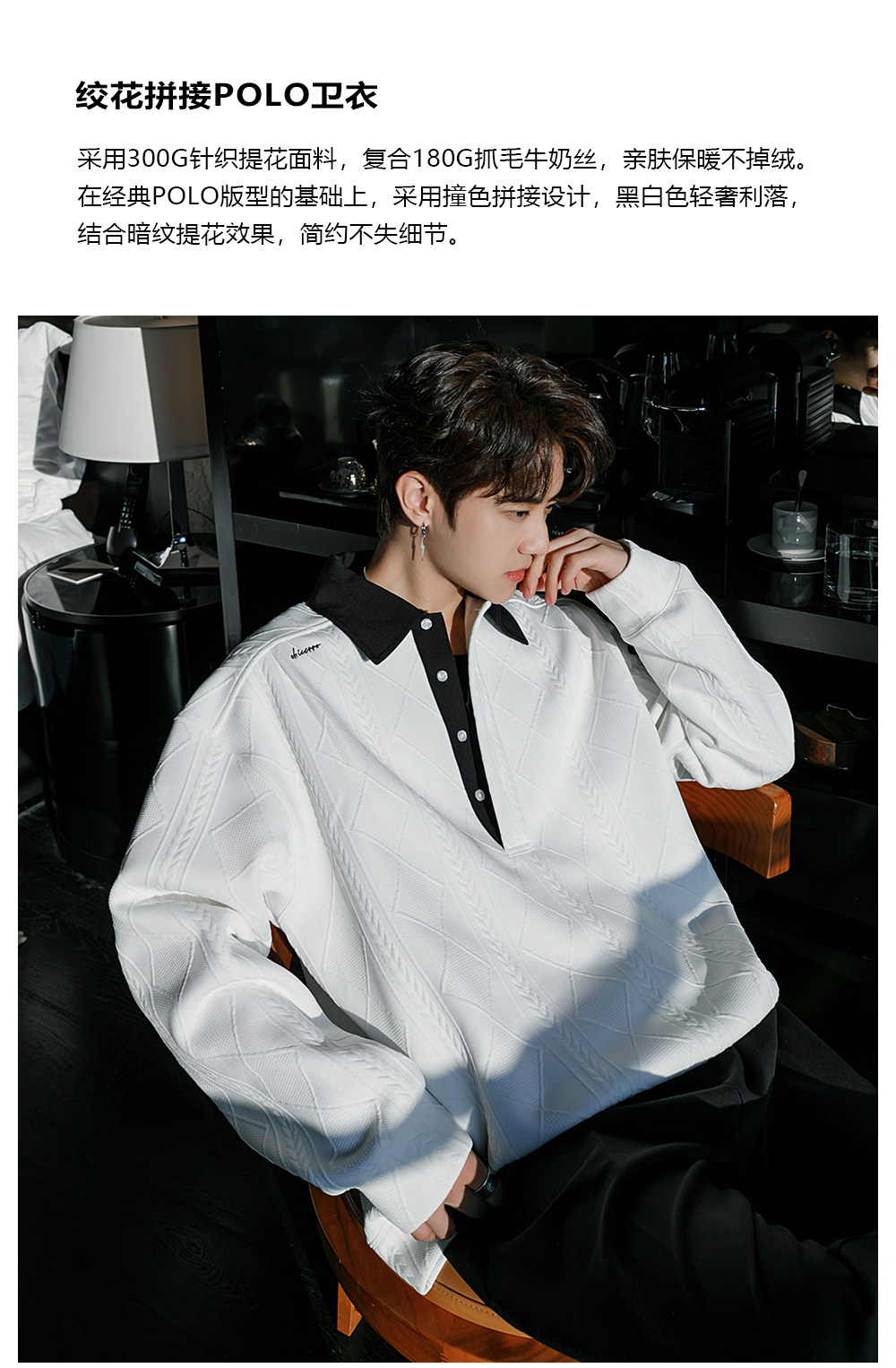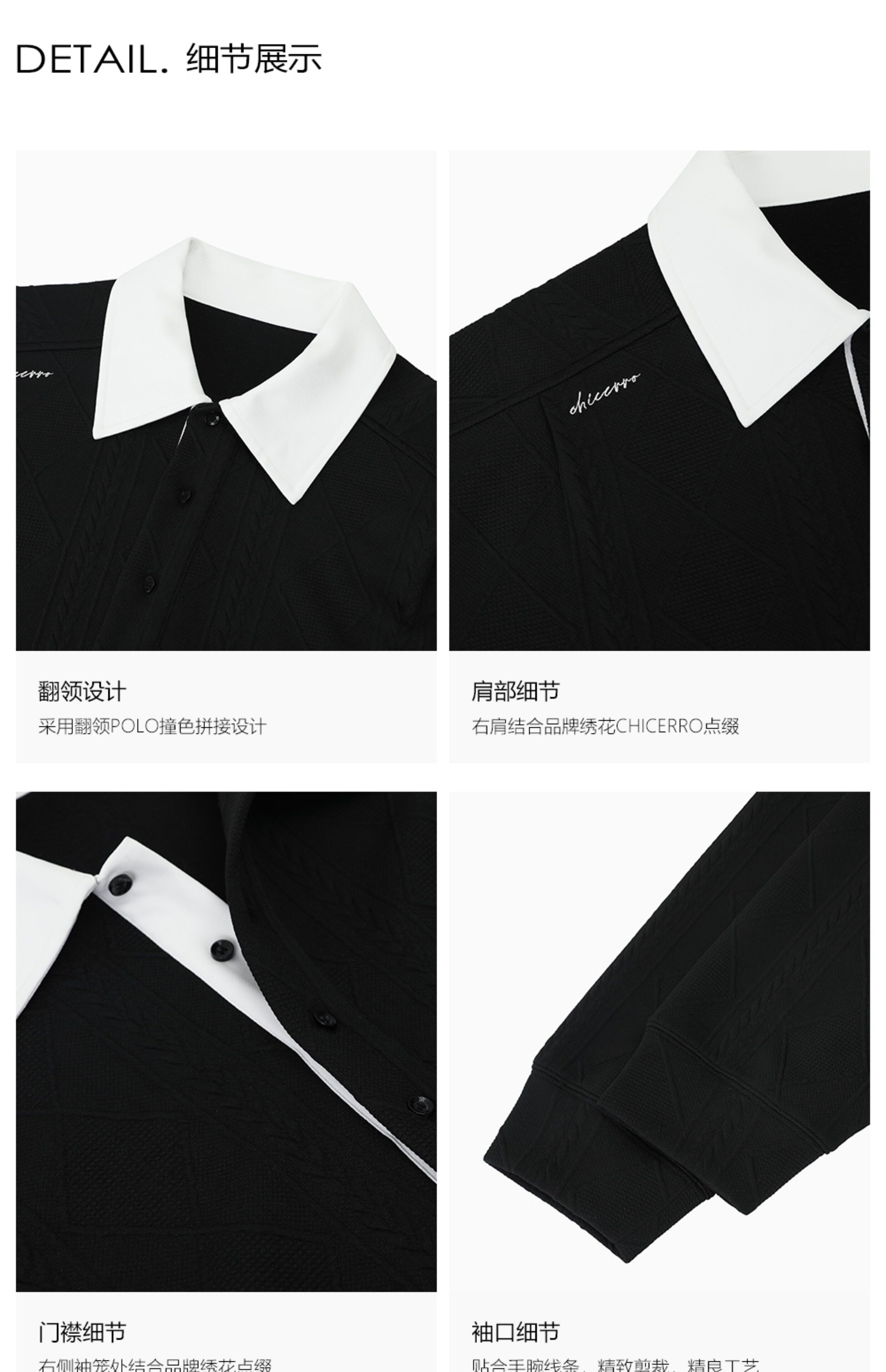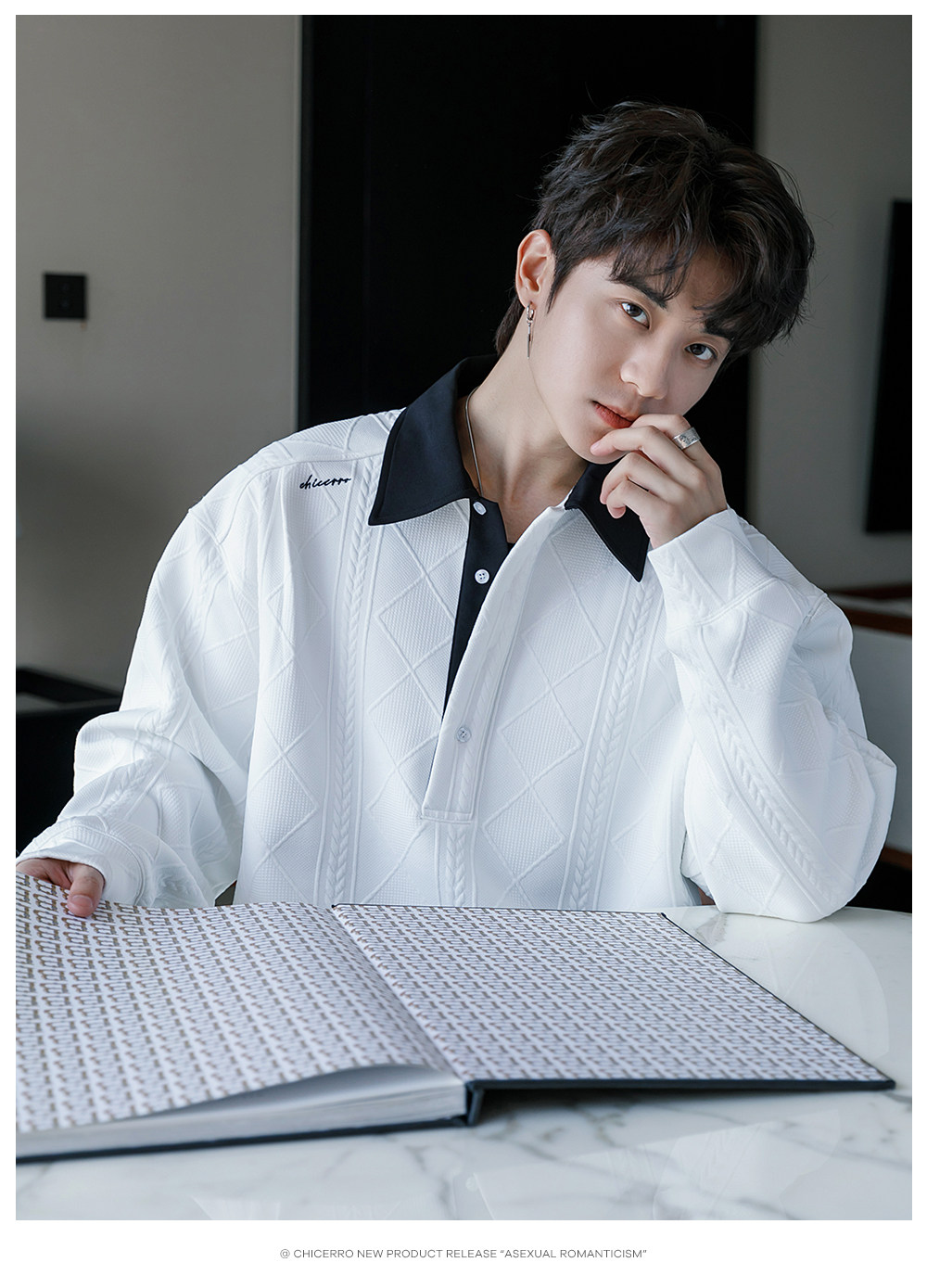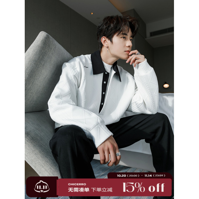 CHICERRO西西裡男裝春季重磅針織少年感polo領撞色暗紋套頭衛衣潮