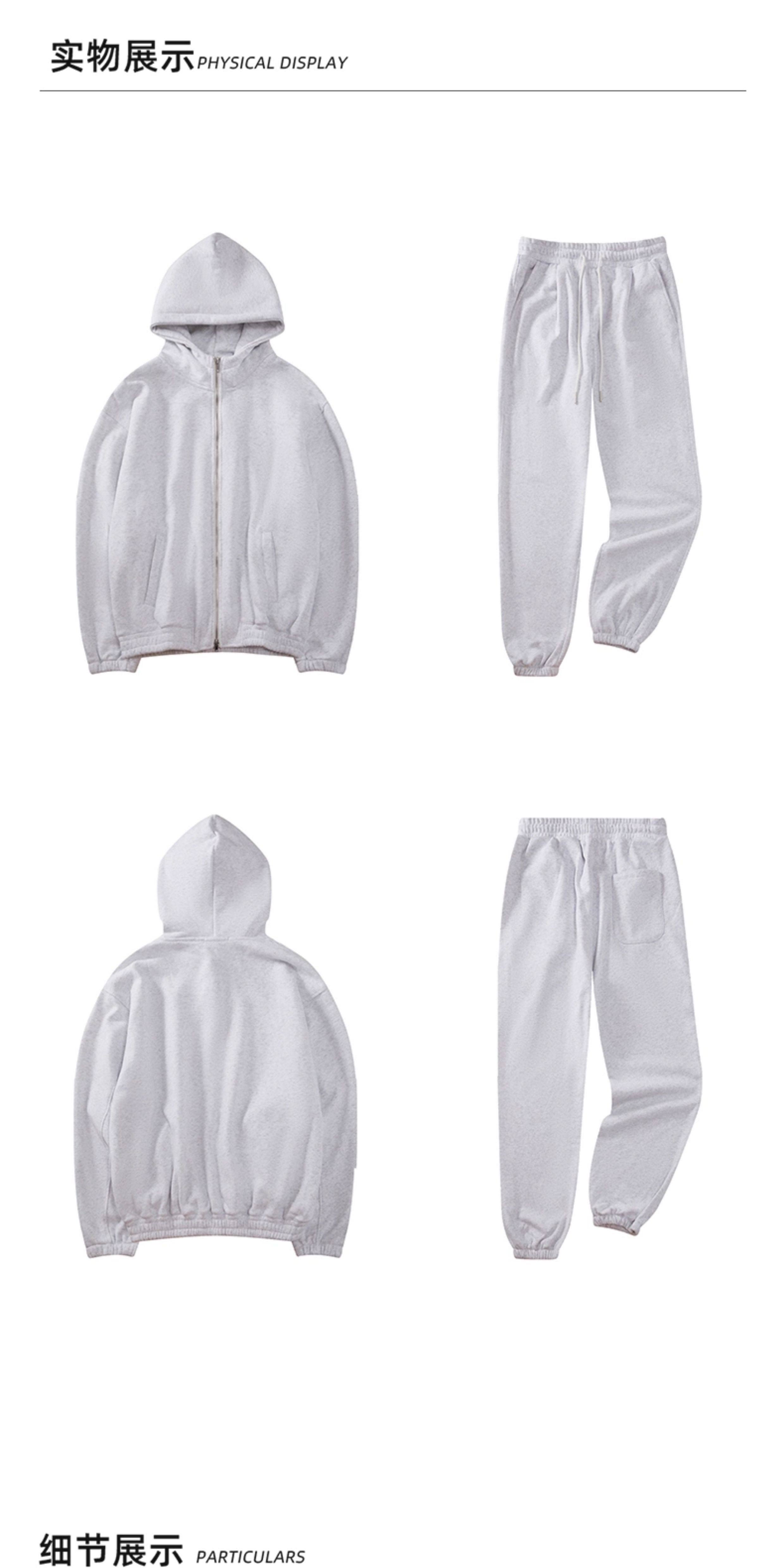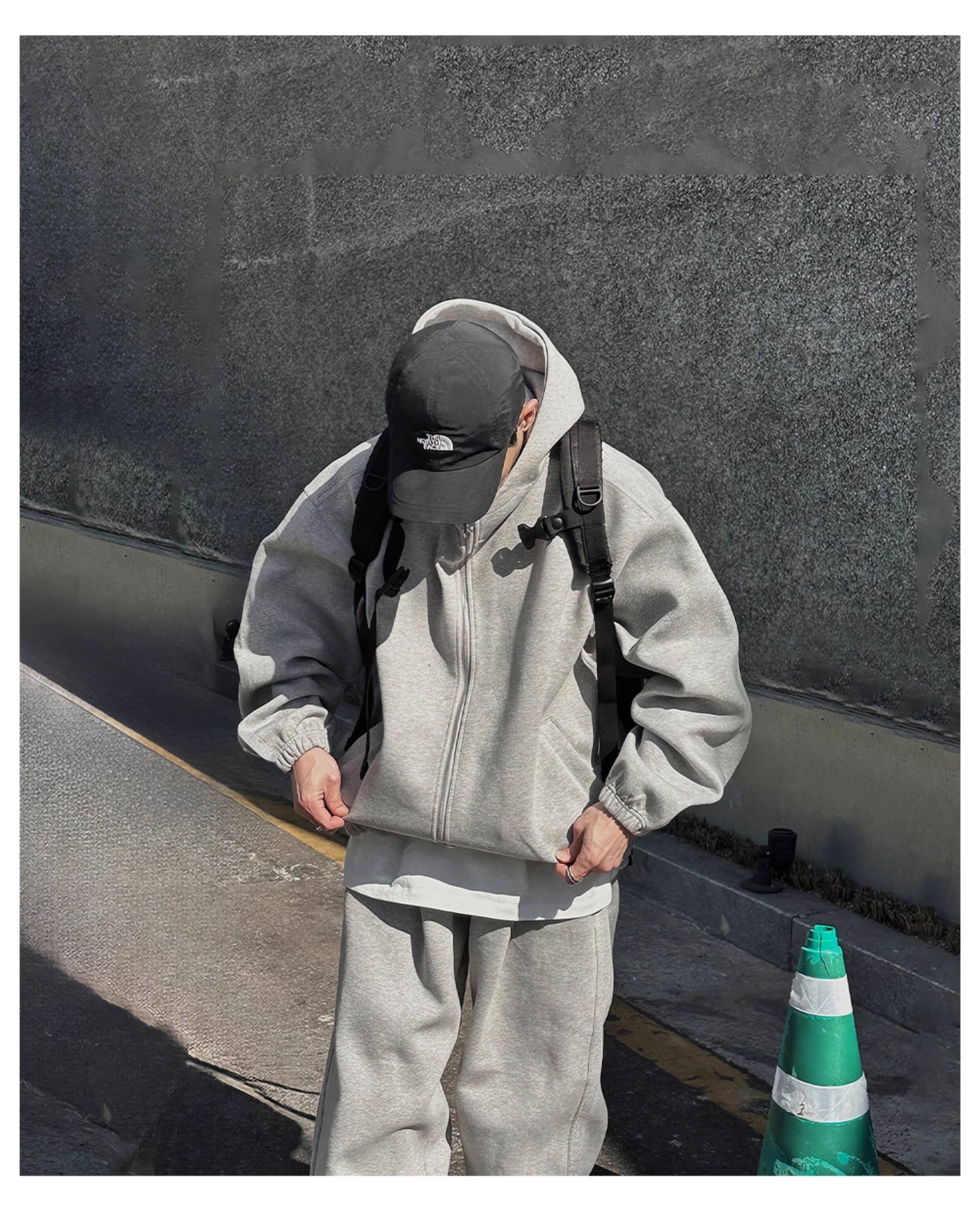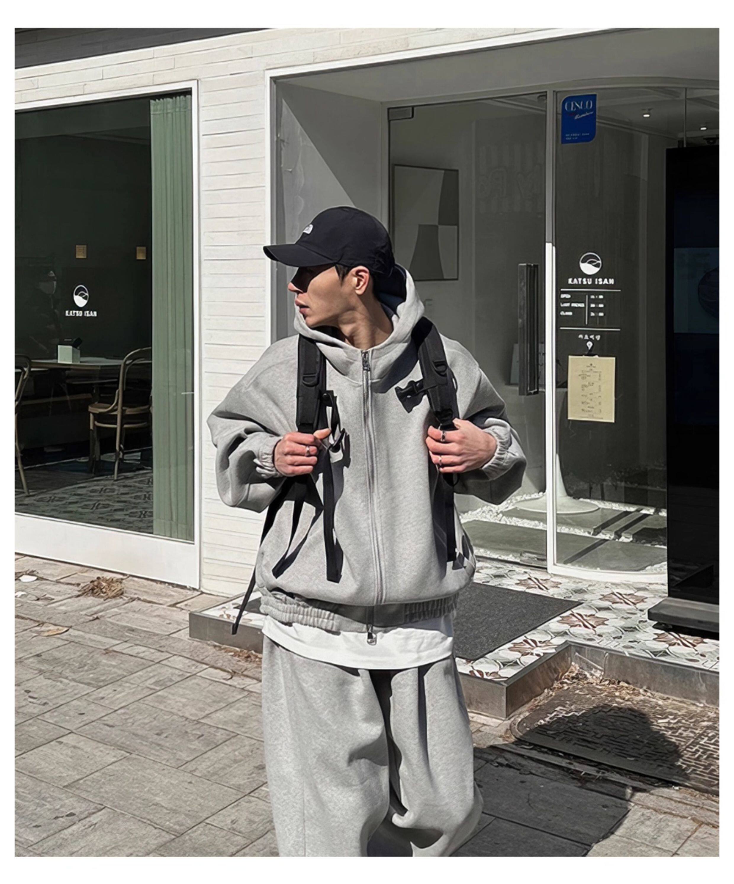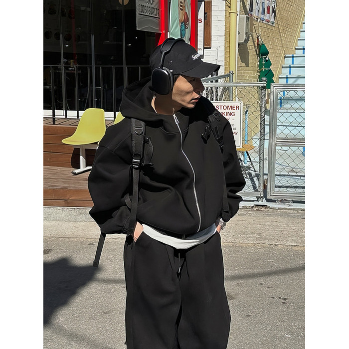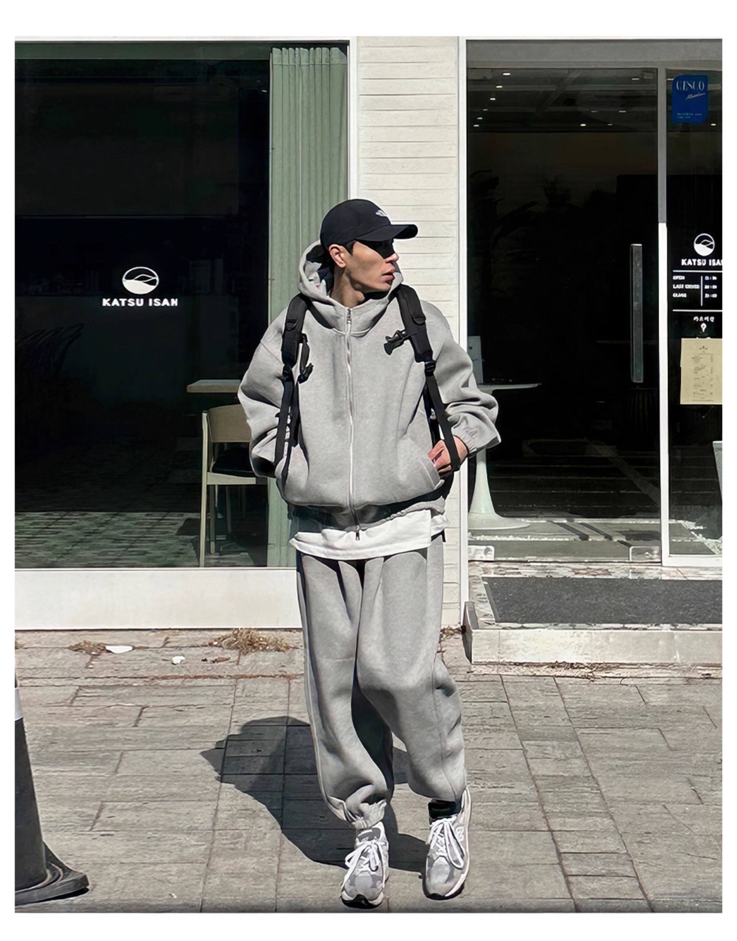 加絨連帽衛衣套裝男士春秋季美式重磅拉鍊外套寬松休閒運動風衛褲