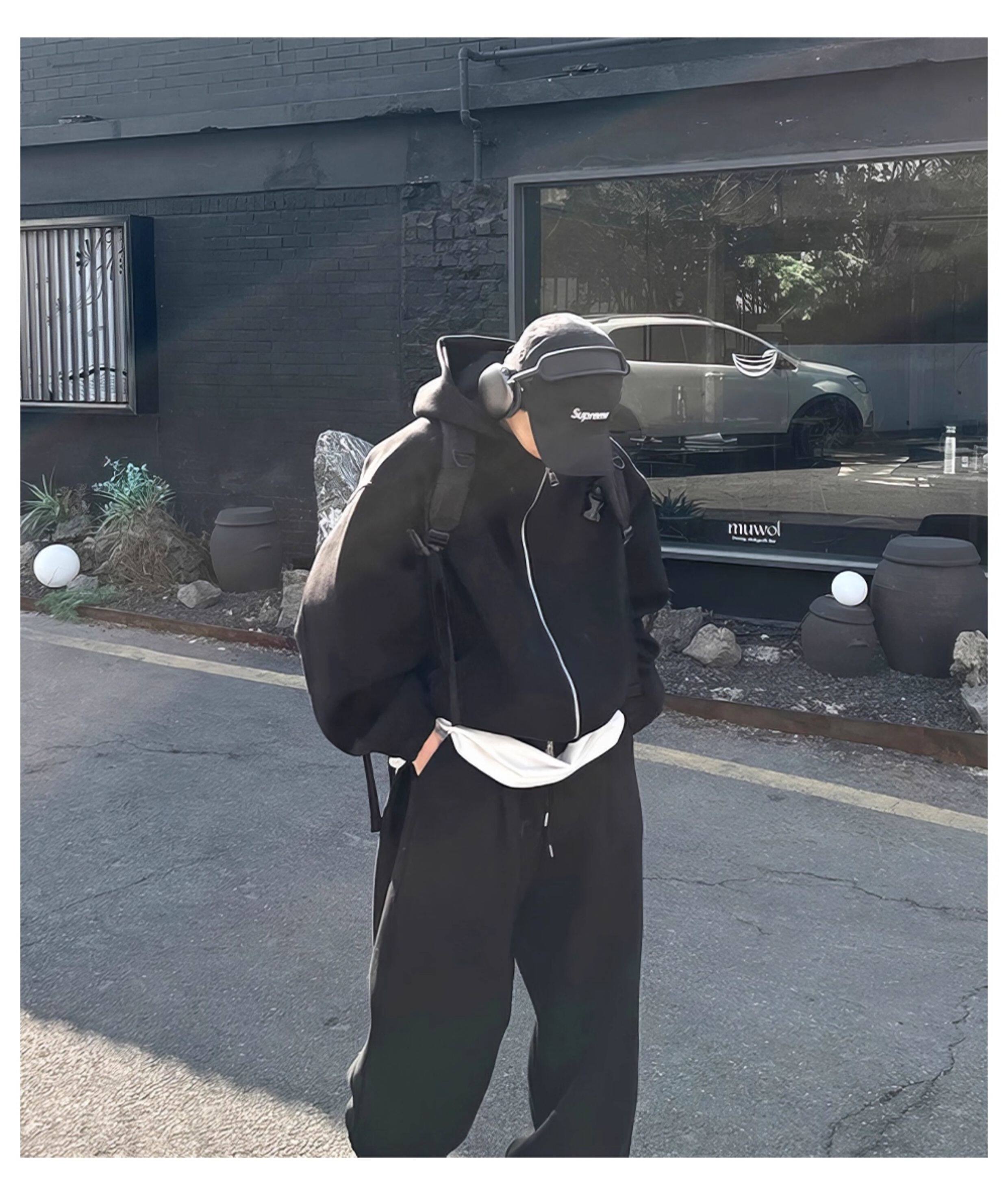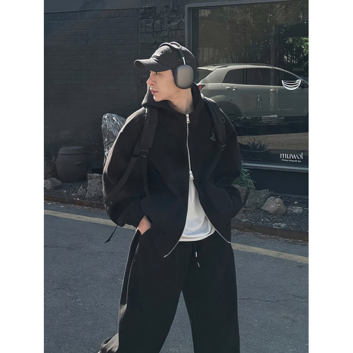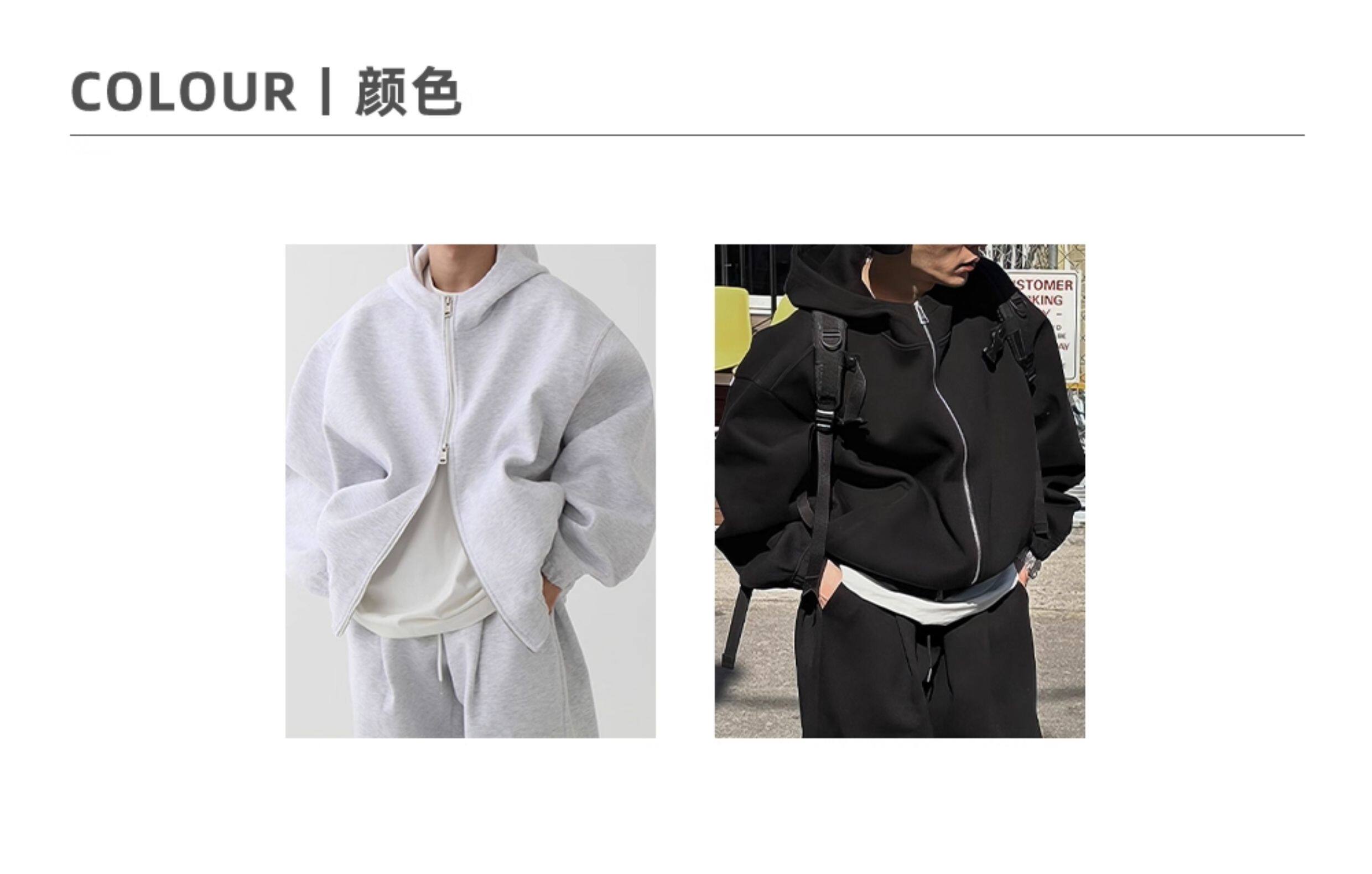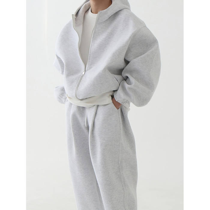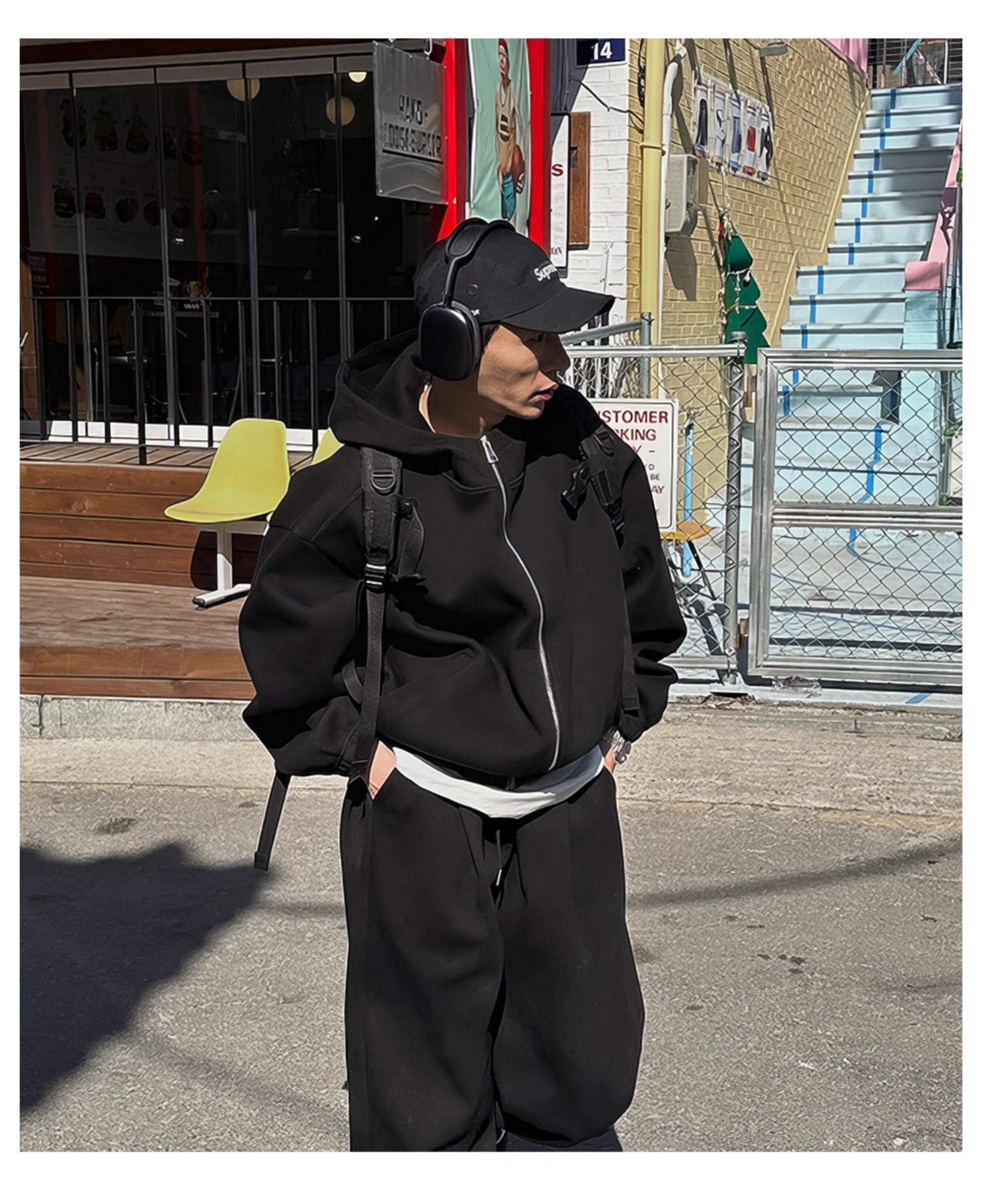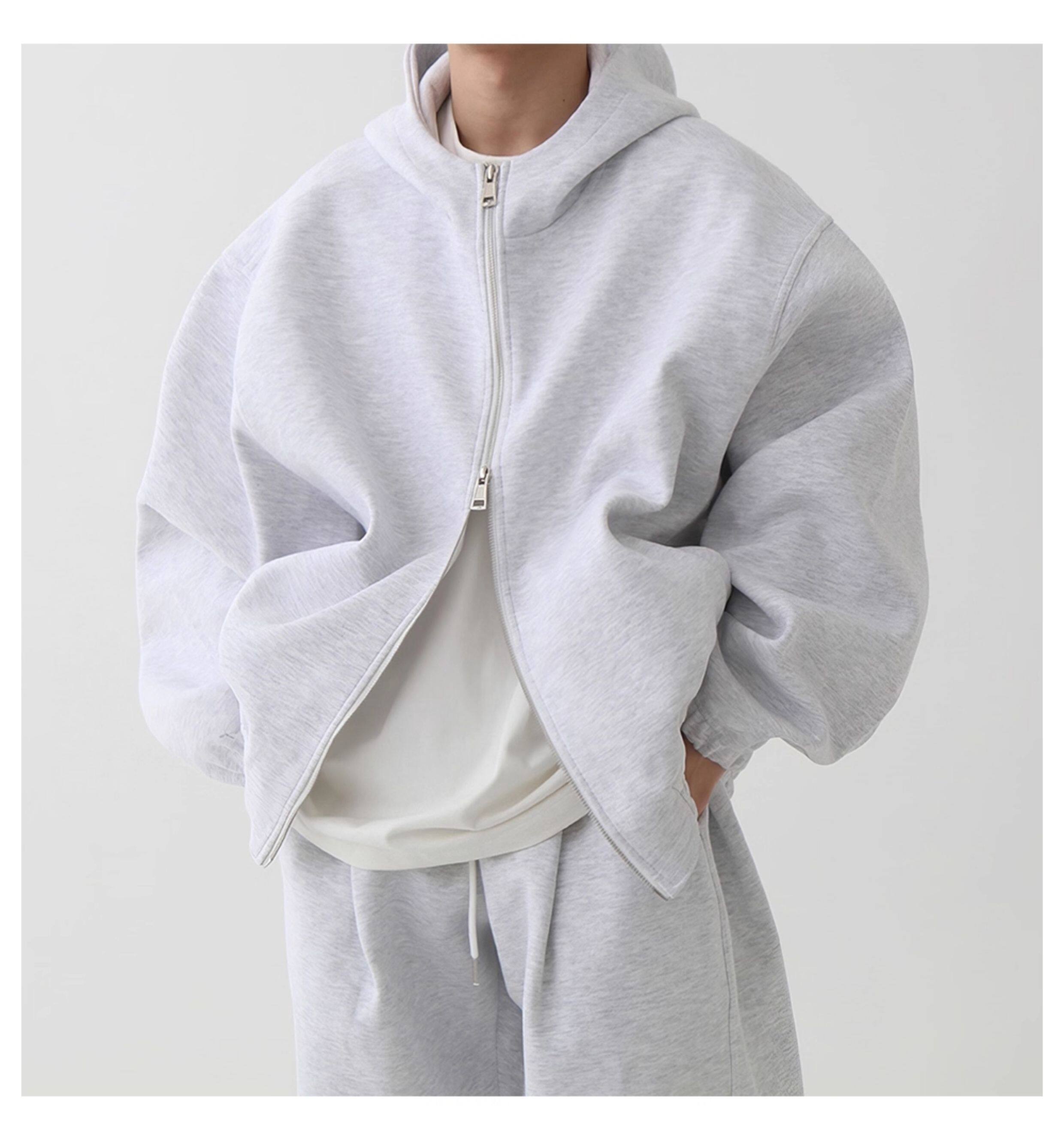 加絨連帽衛衣套裝男士春秋季美式重磅拉鍊外套寬松休閒運動風衛褲