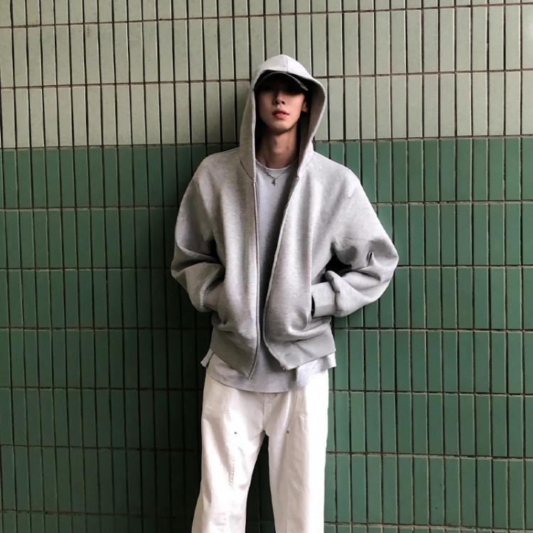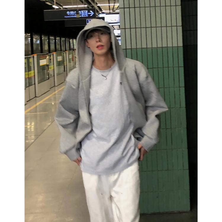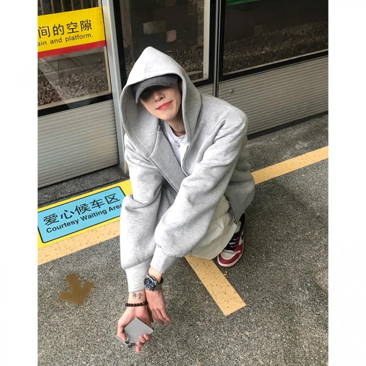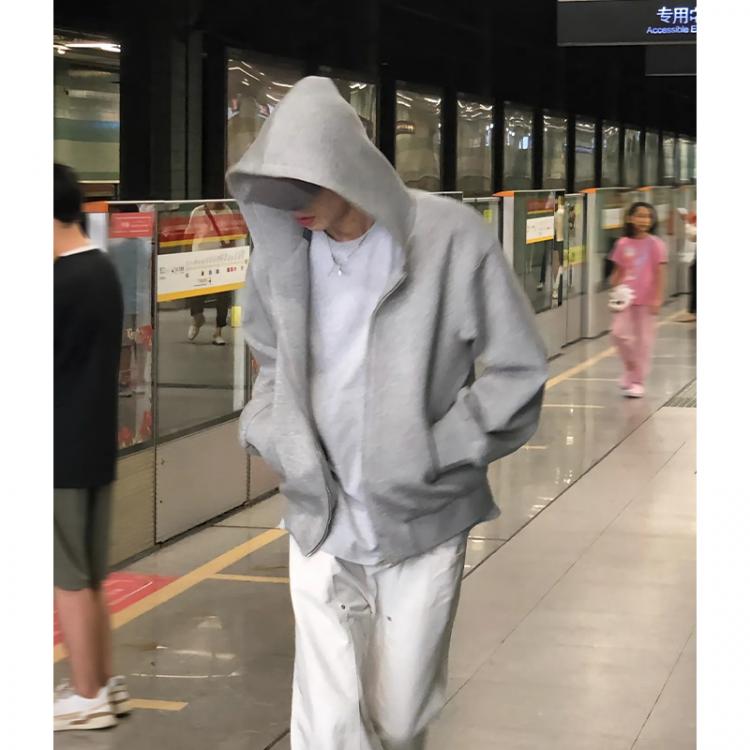 灰色美式復古重磅連帽衛衣開衫男春秋款潮牌高級感痞帥短款外套
