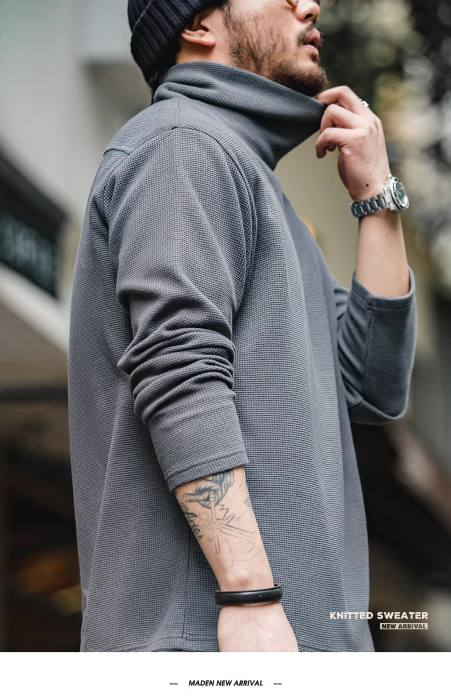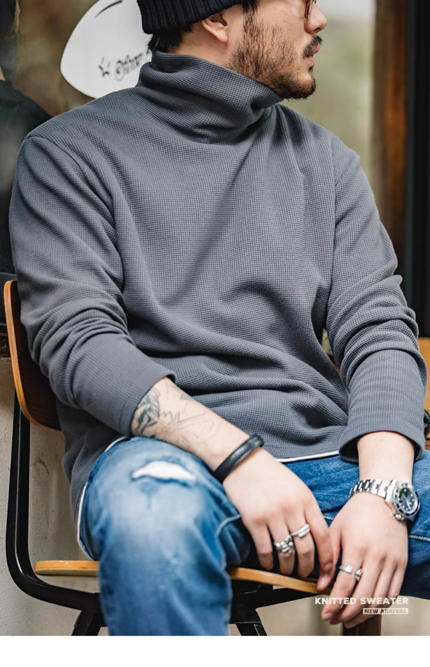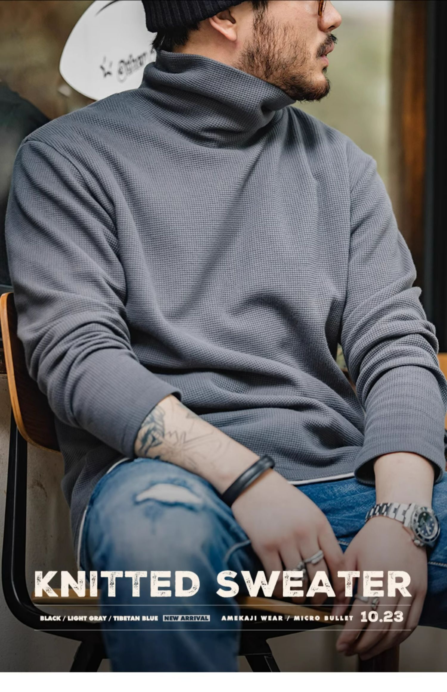 馬登工裝 美式休閒灰色衛衣華夫格高領保暖內搭長袖T恤打底衫男秋