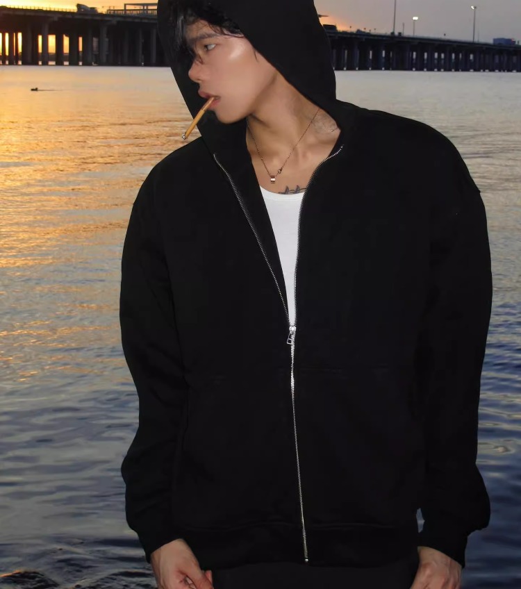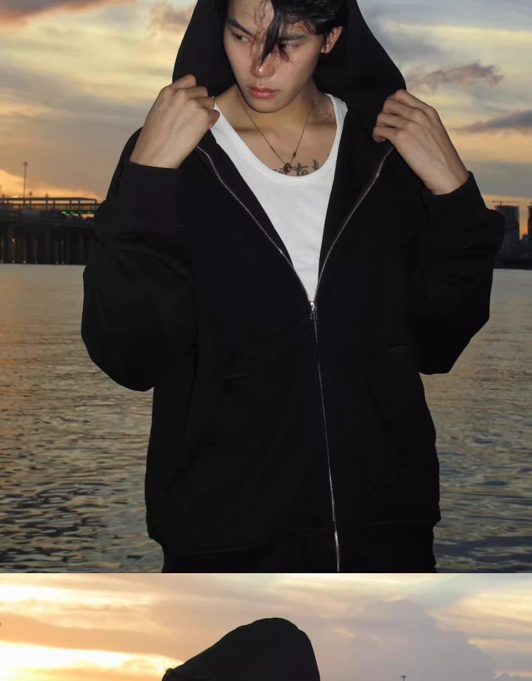 cleanfit黑色開衫連帽衛衣男款春秋季美式重磅拉鍊短款慵懶風外套