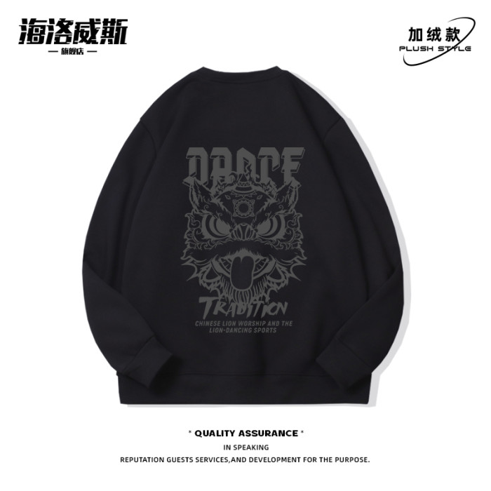 醒獅頭國潮紅色衛衣男加絨加厚秋冬新款寬鬆本命年圓領打底衫