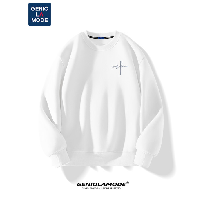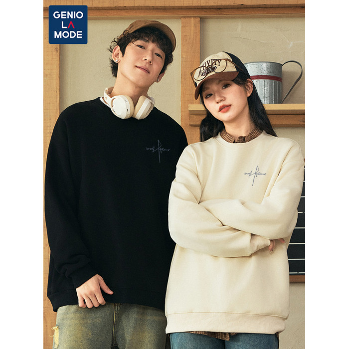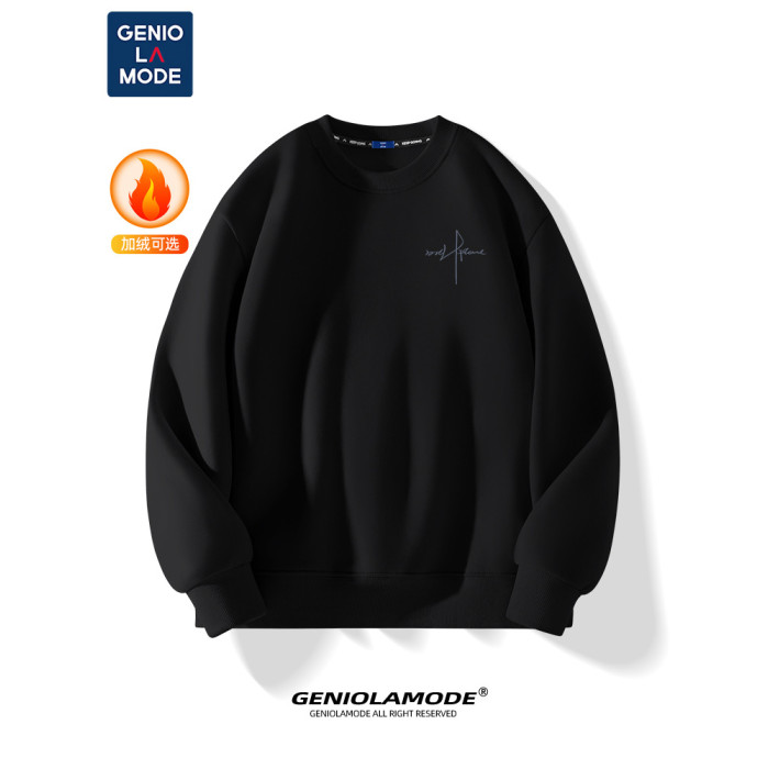 GENIOLAMODE男士圓領衛衣秋冬季寬松無帽加絨上衣黑色高級套頭衫