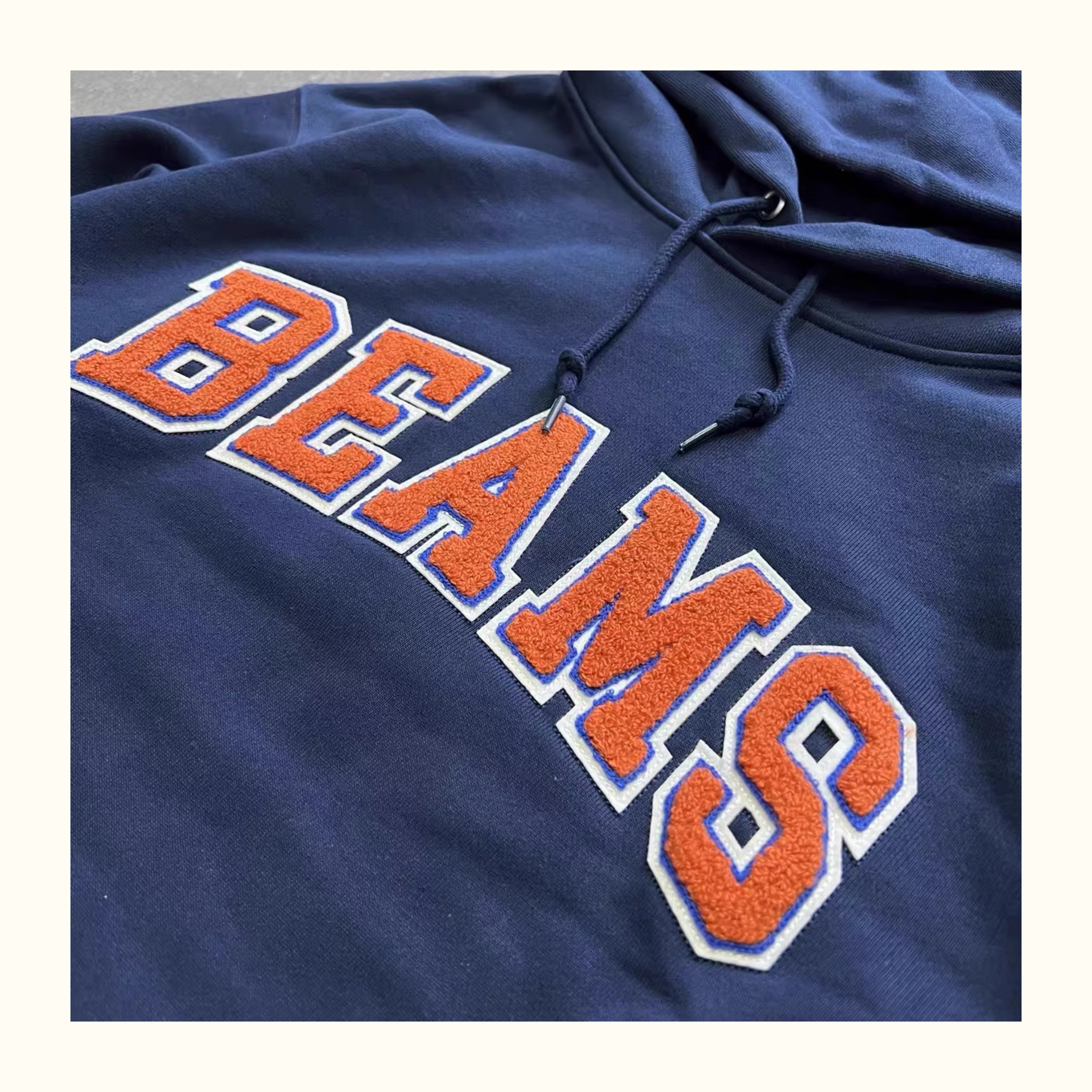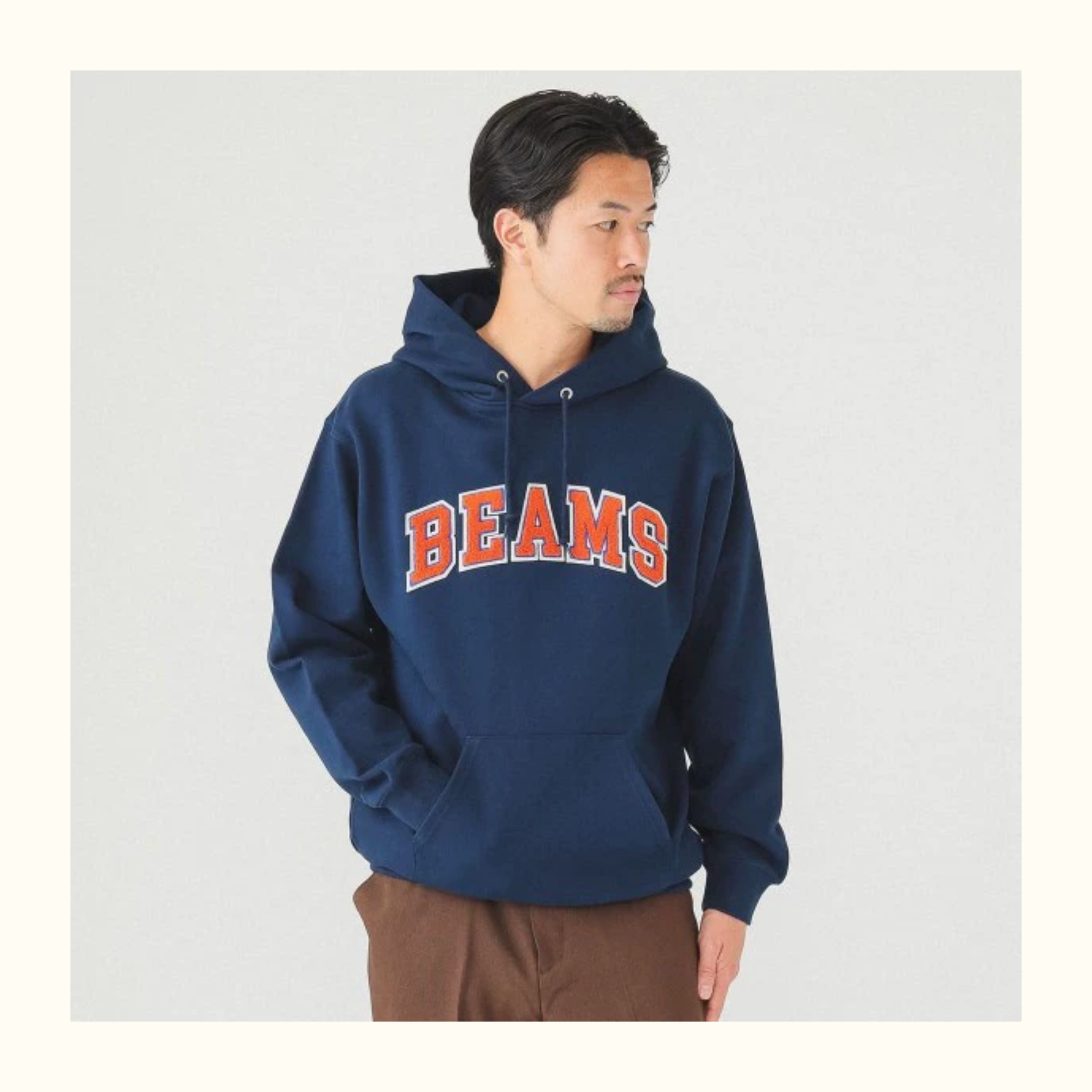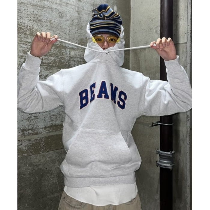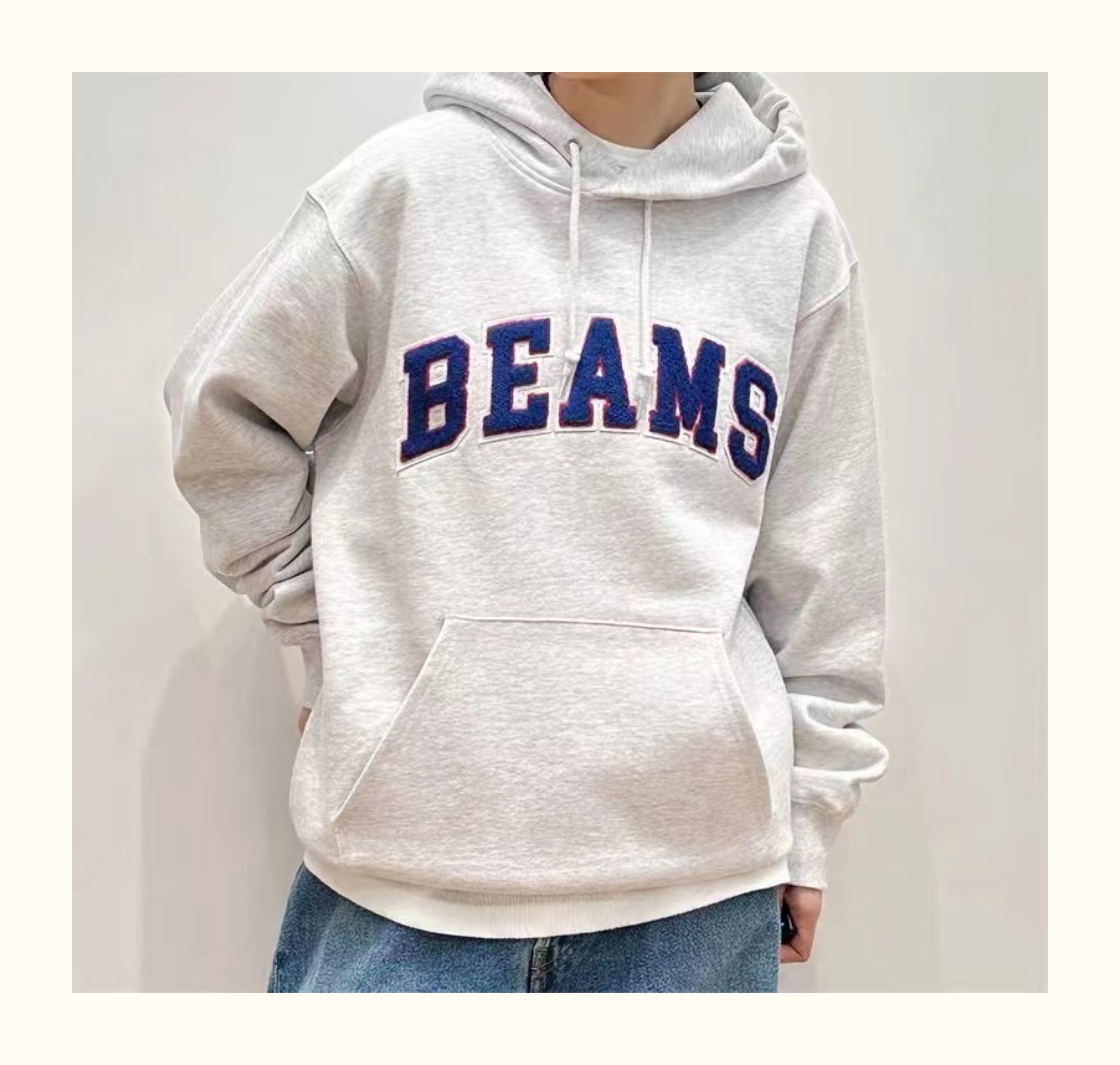 23AW BEAMS純棉寬松休閒復古刺綉字母學院風連帽套頭衛衣男潮