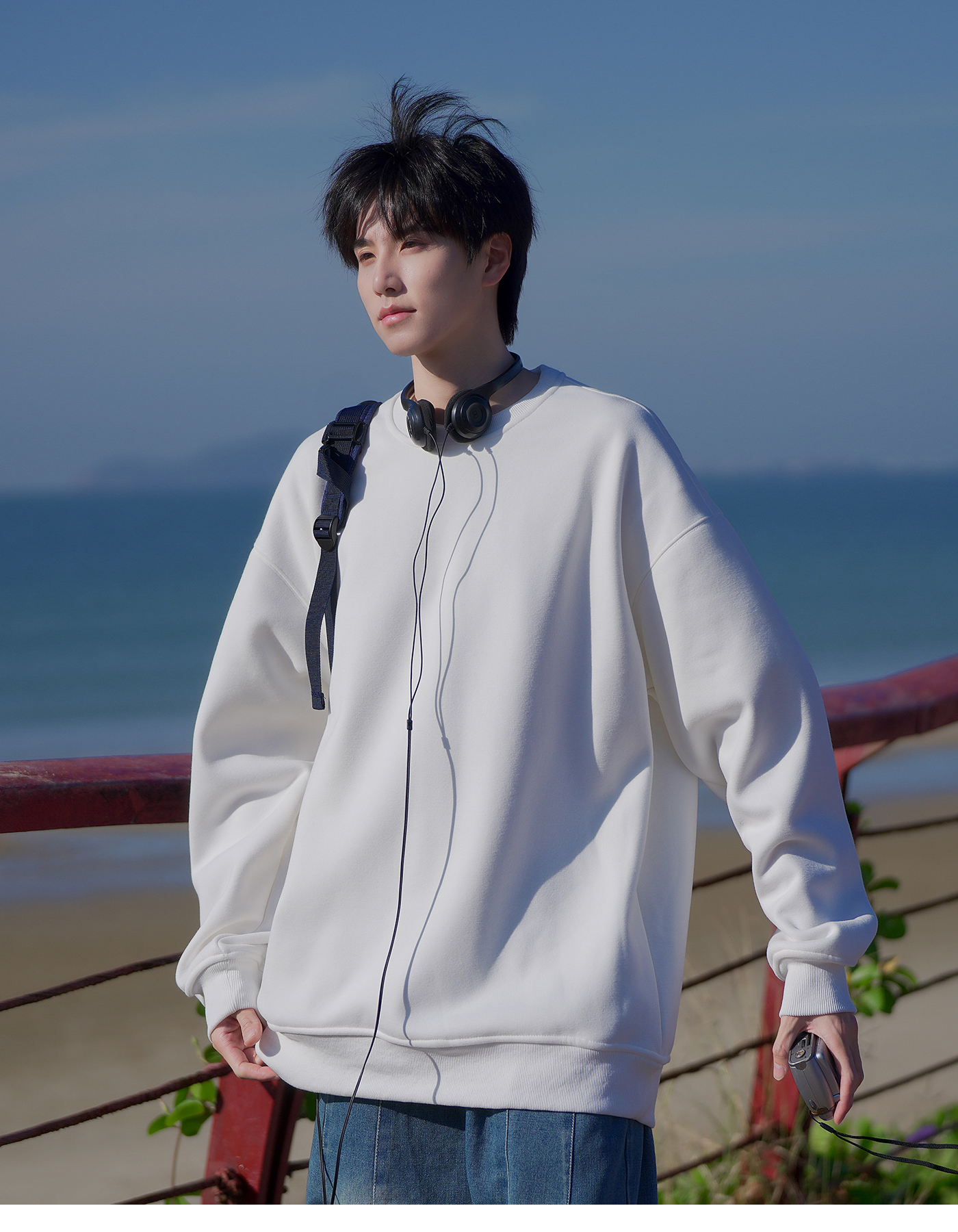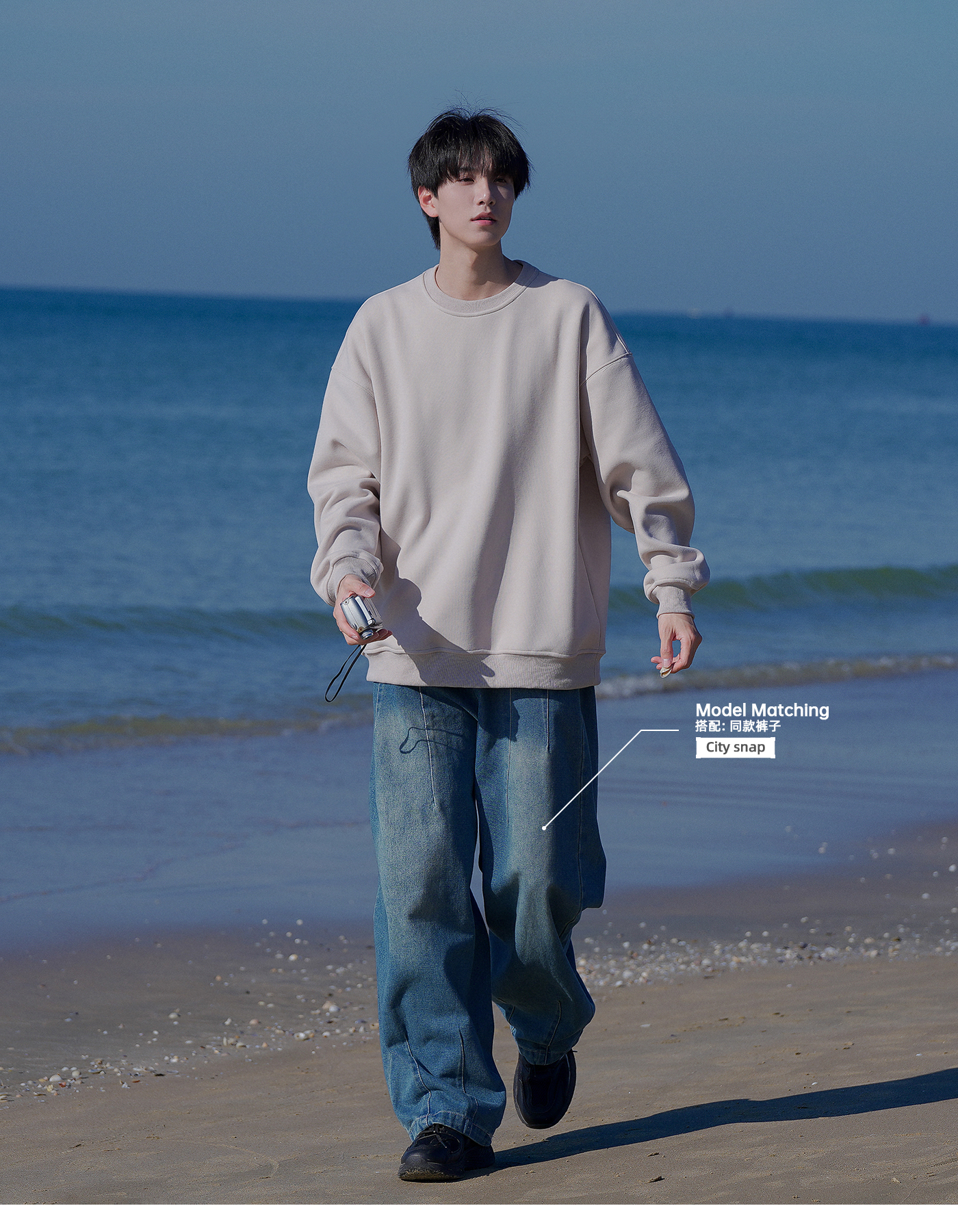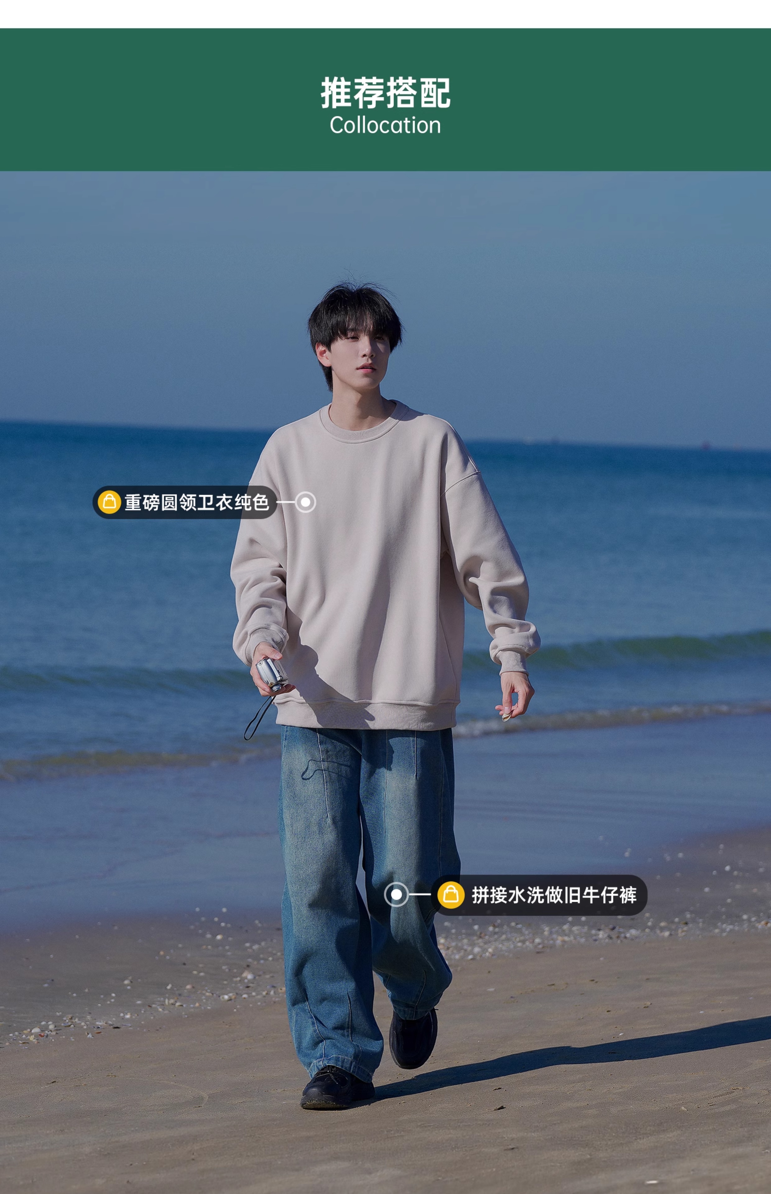 @港仔文藝男 420g重磅圓領衛衣男秋冬款復古純色oversize套頭衫