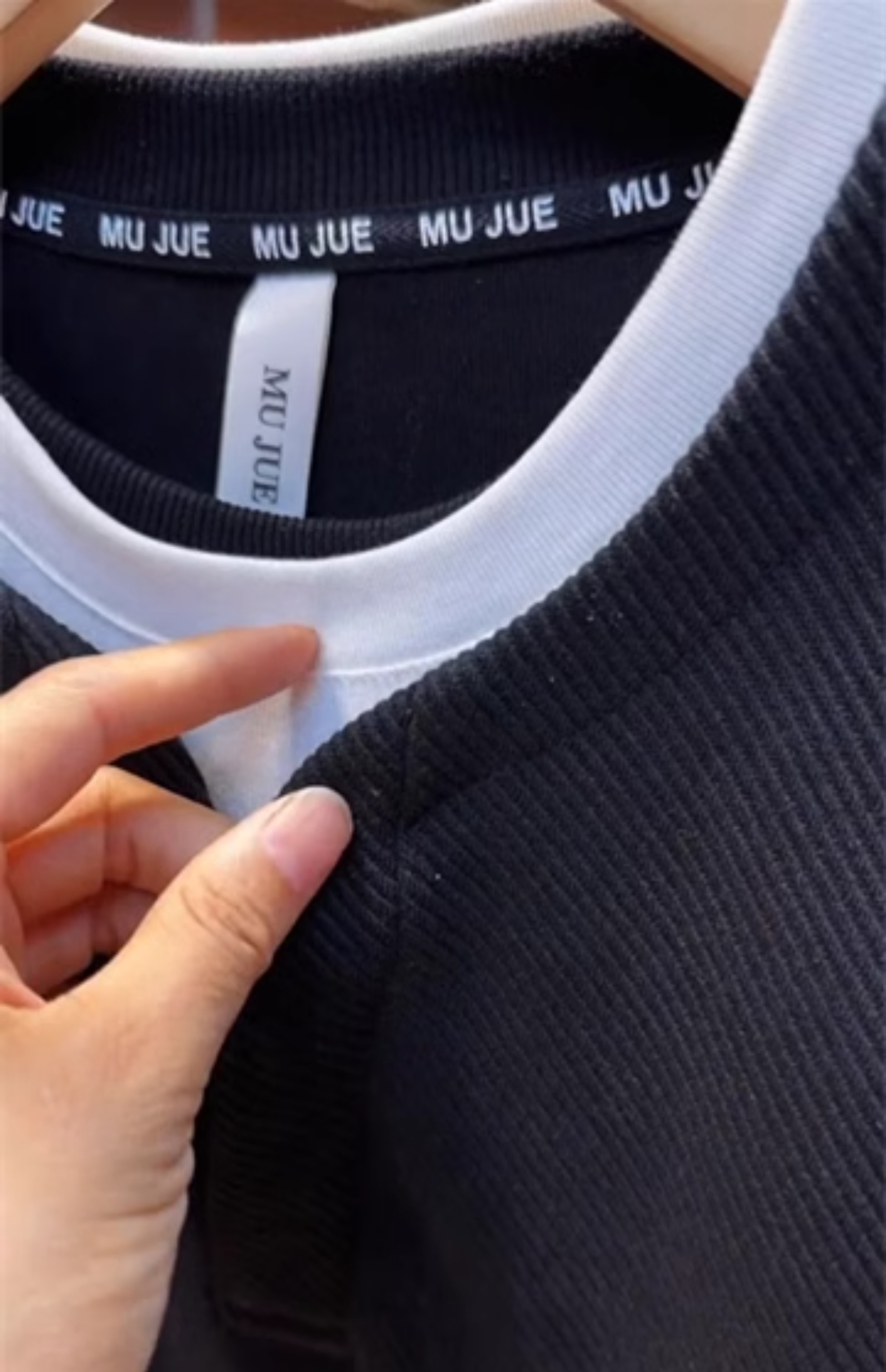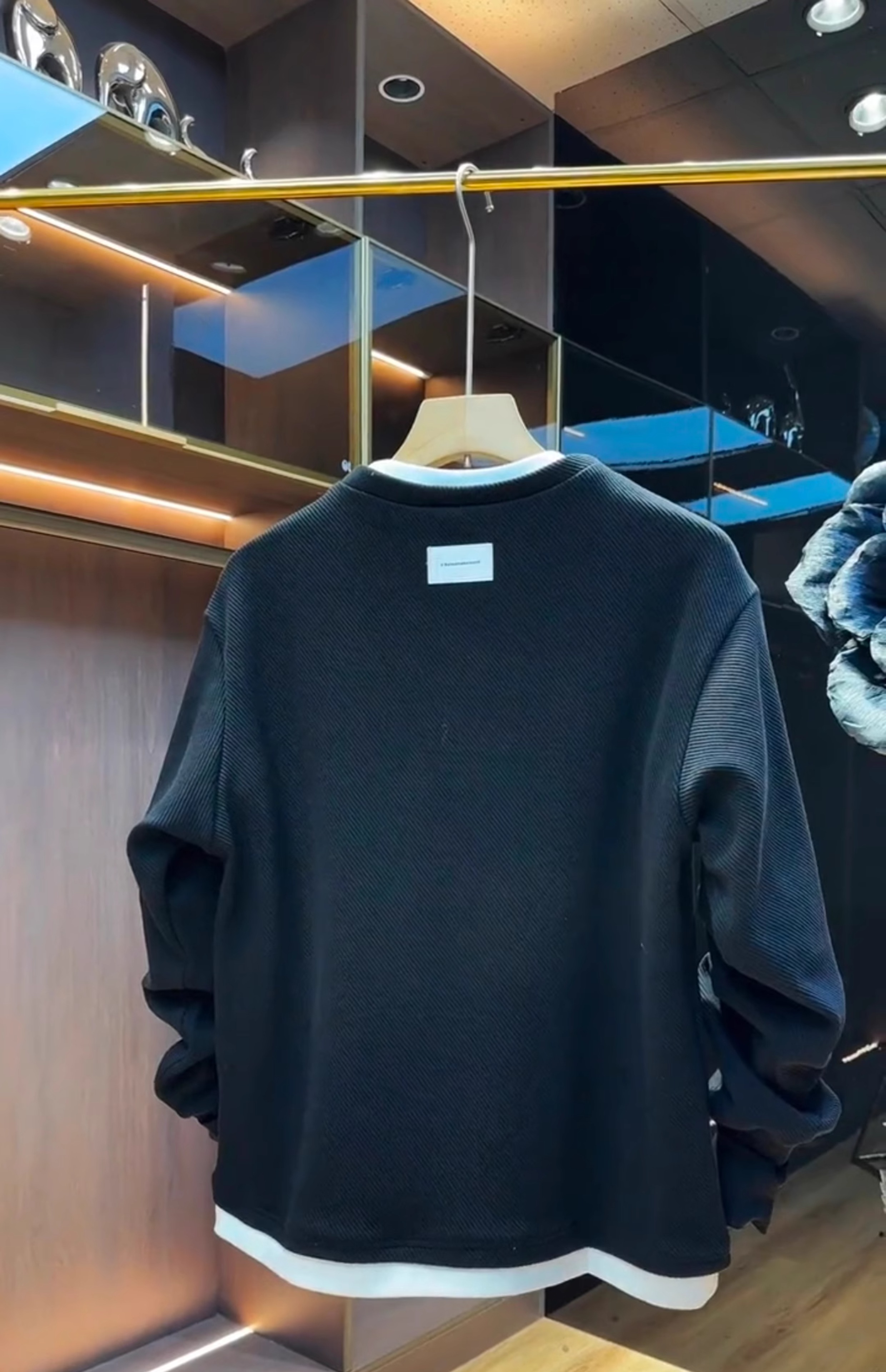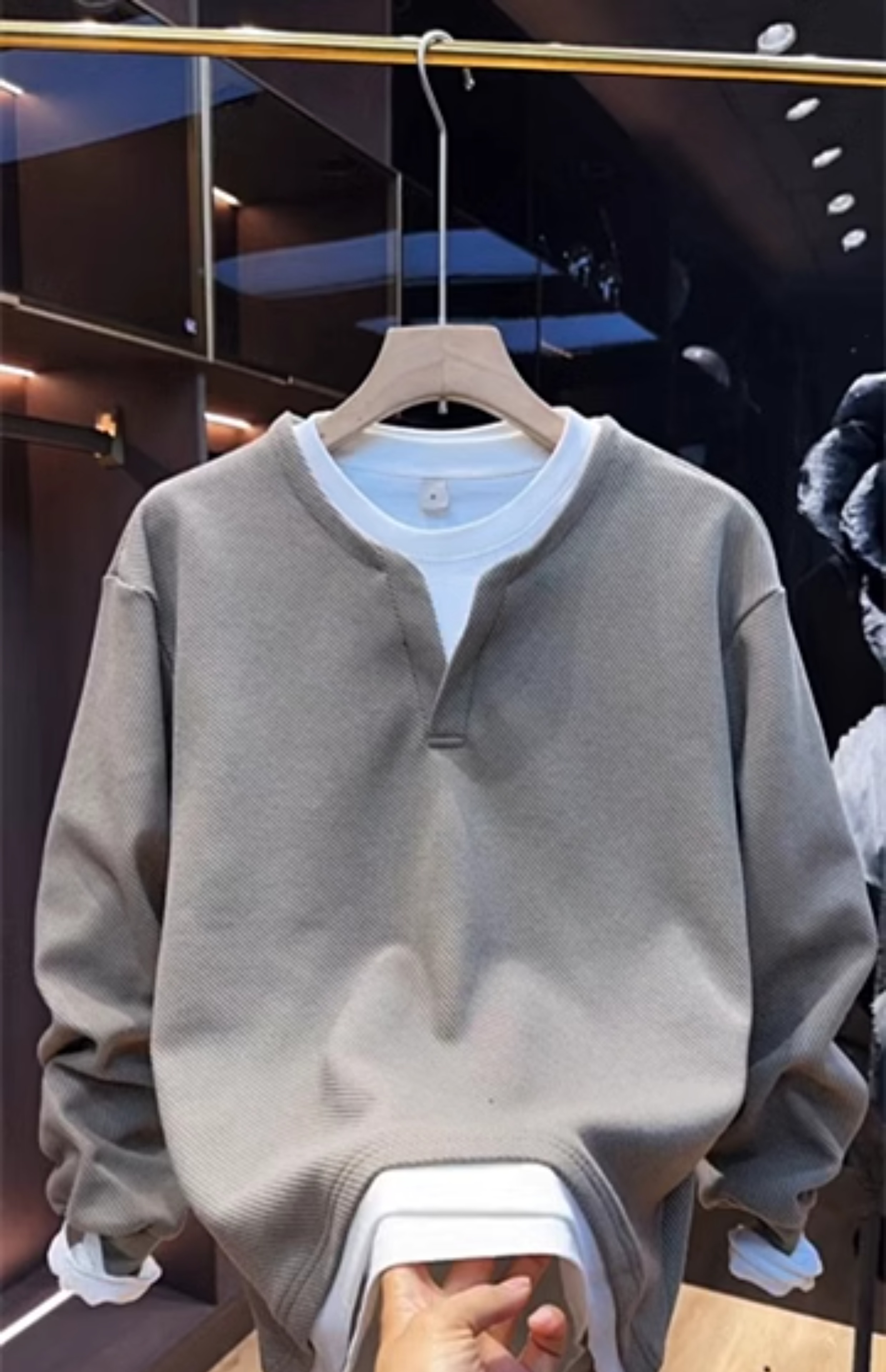秋冬新款加絨假兩件V領衛衣男士高檔簡約寬松百搭休閒上衣打底衫