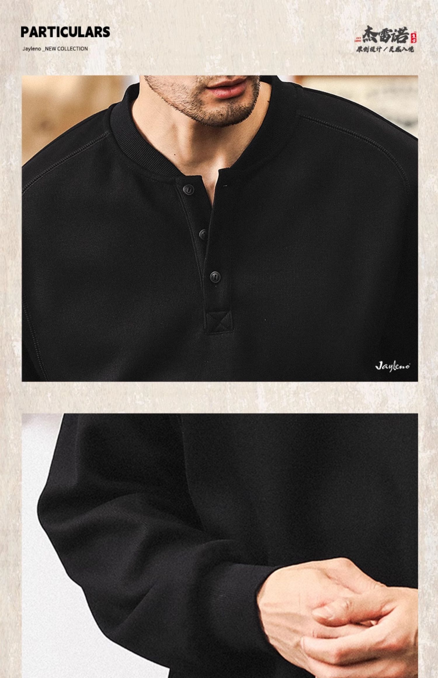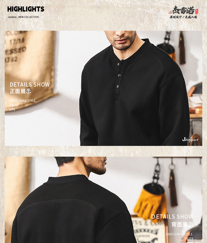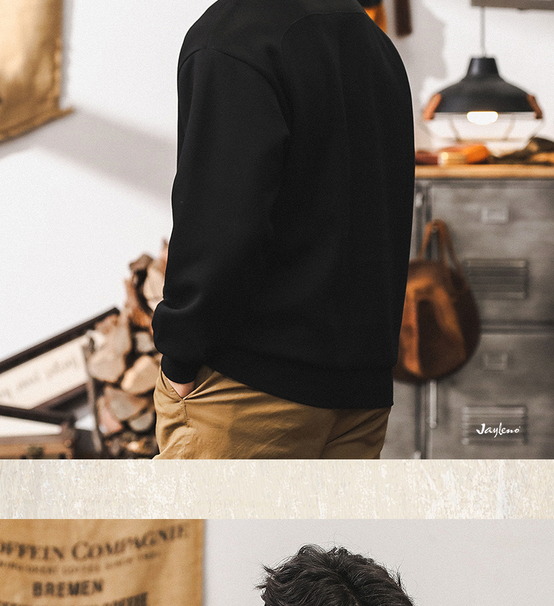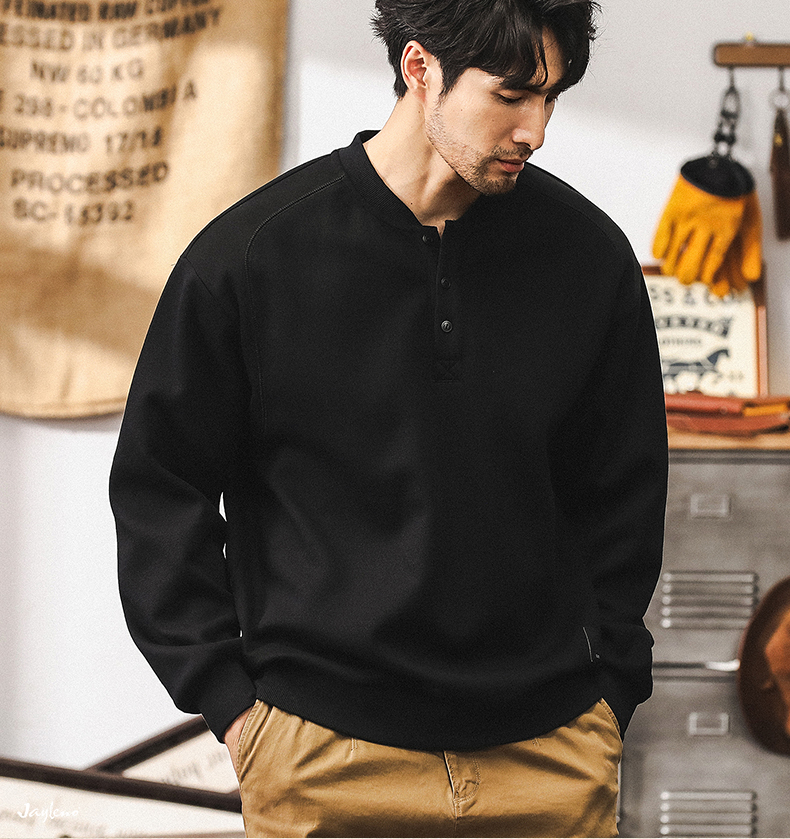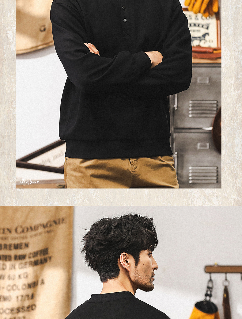 美式復古重磅加絨衛衣男秋季潮牌亨利領半開衫外套男春秋款POLO衫