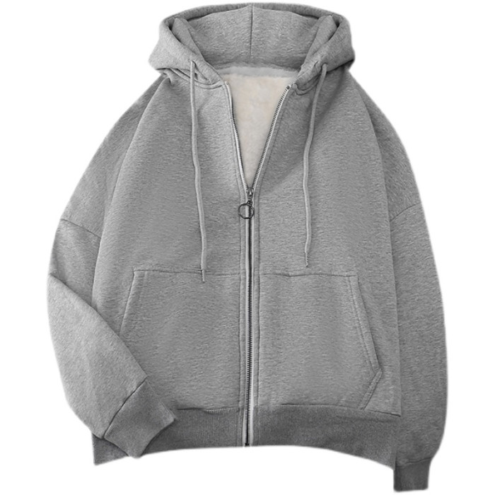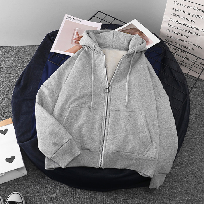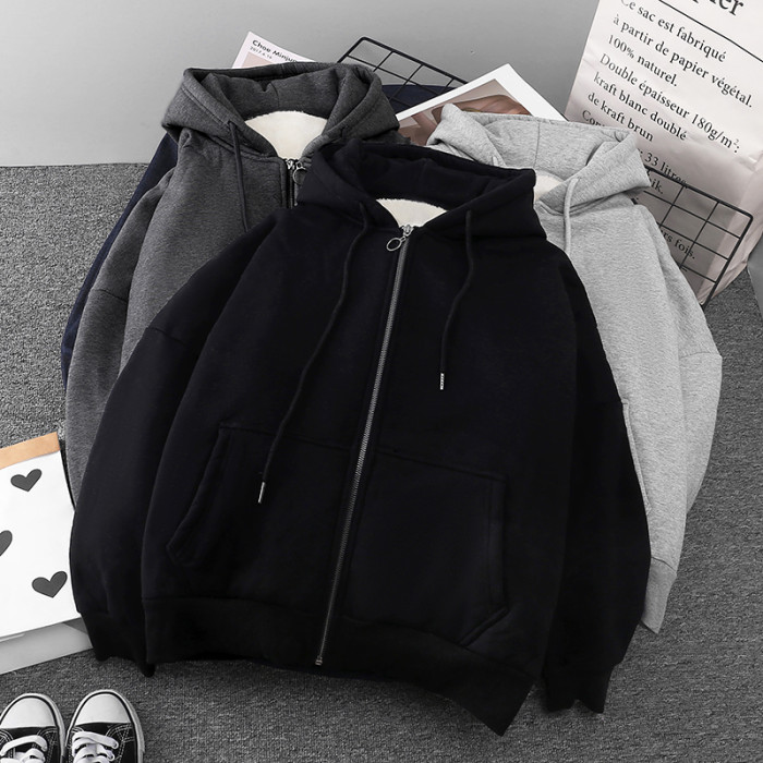 韓系純色男女大碼拉鍊開衫連帽衛衣2021秋冬裝寬松加絨厚保暖外套