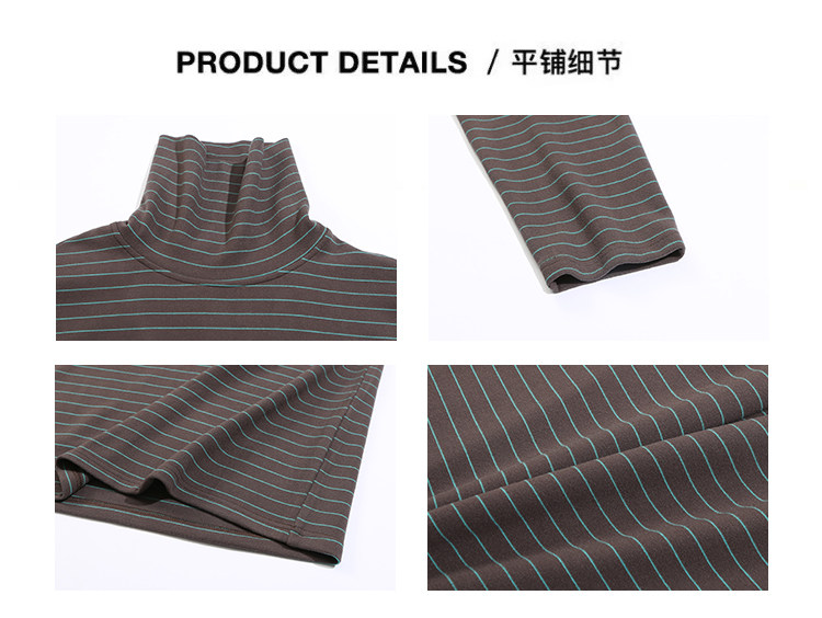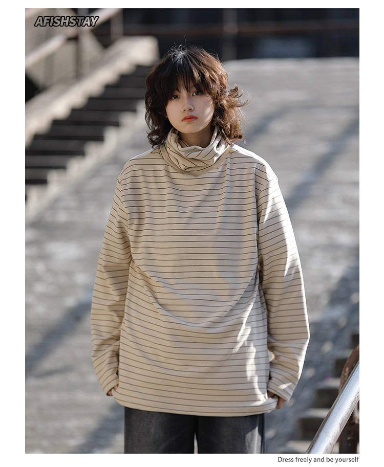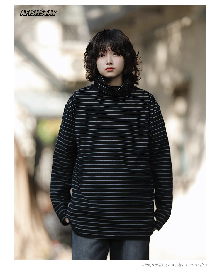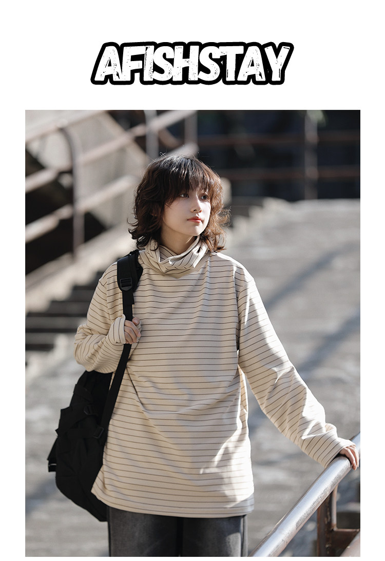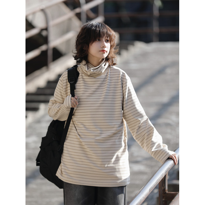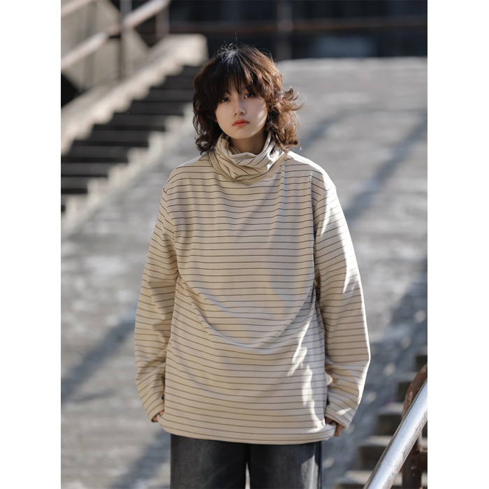 阿於呆 秋冬日系復古條紋高領打底衫男德絨內搭保暖堆堆領長袖T恤