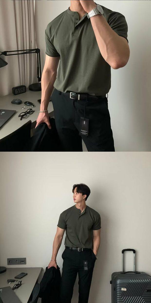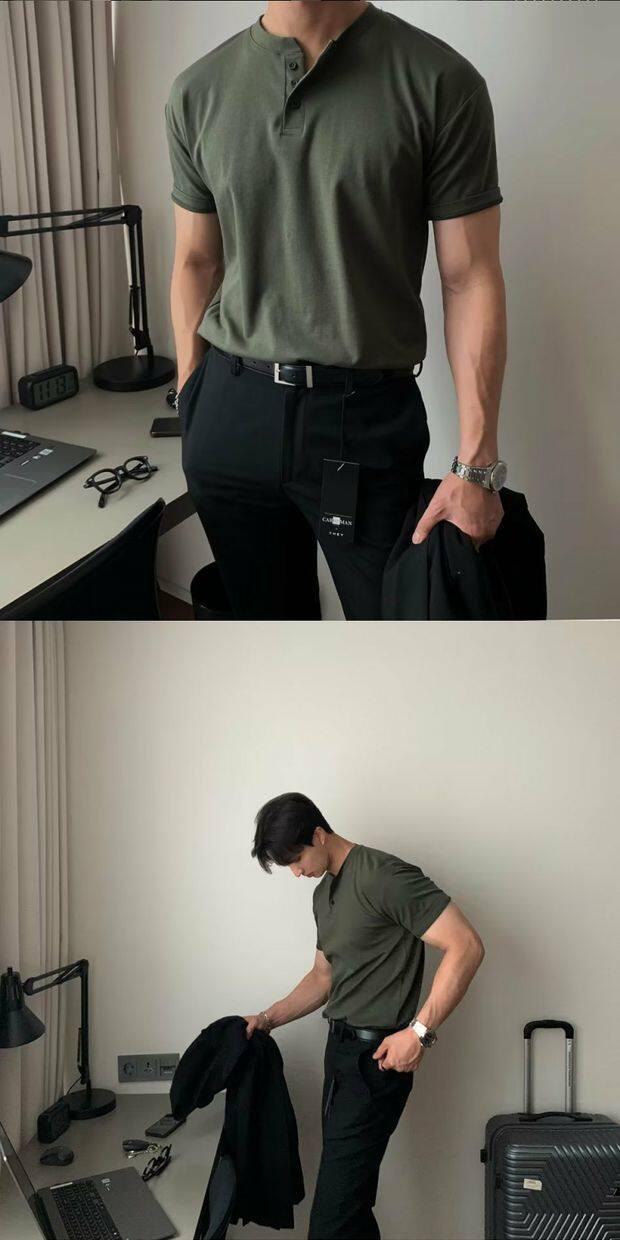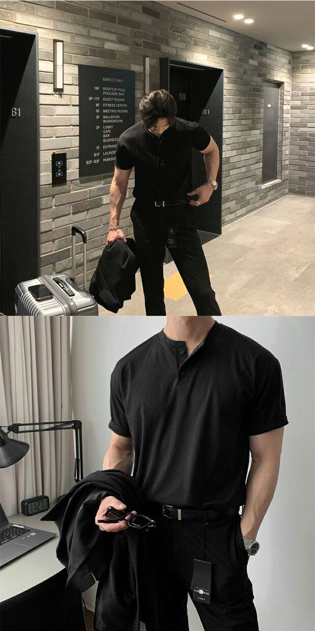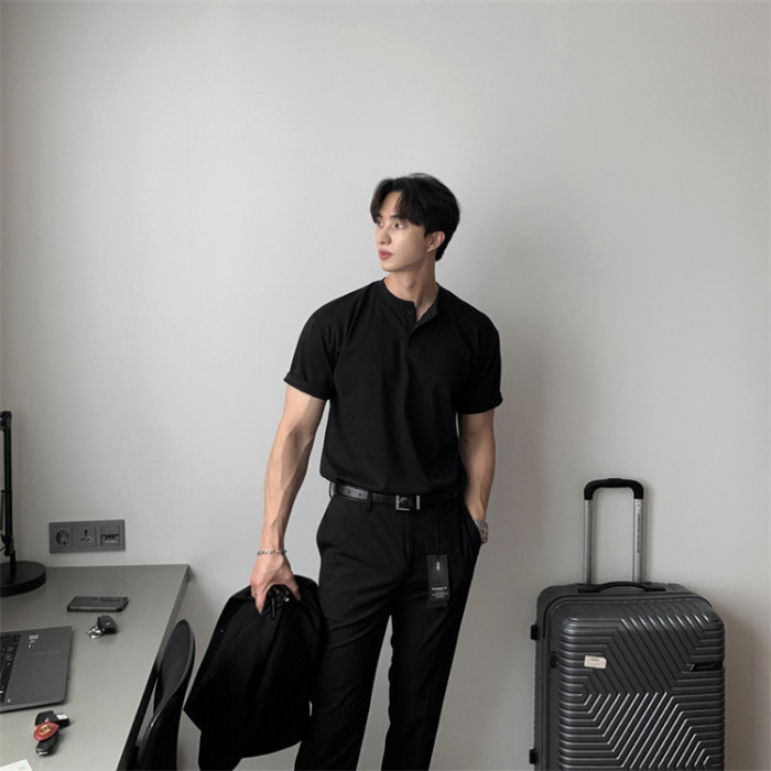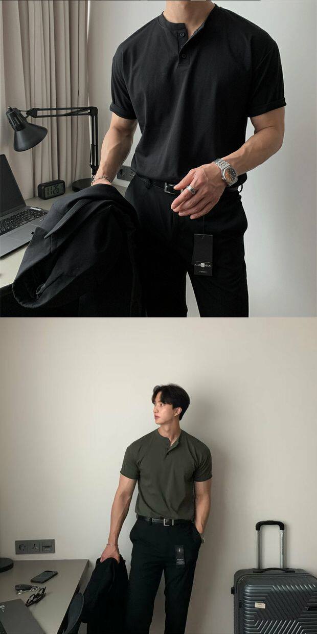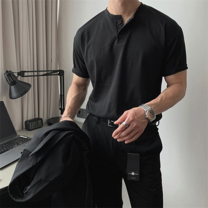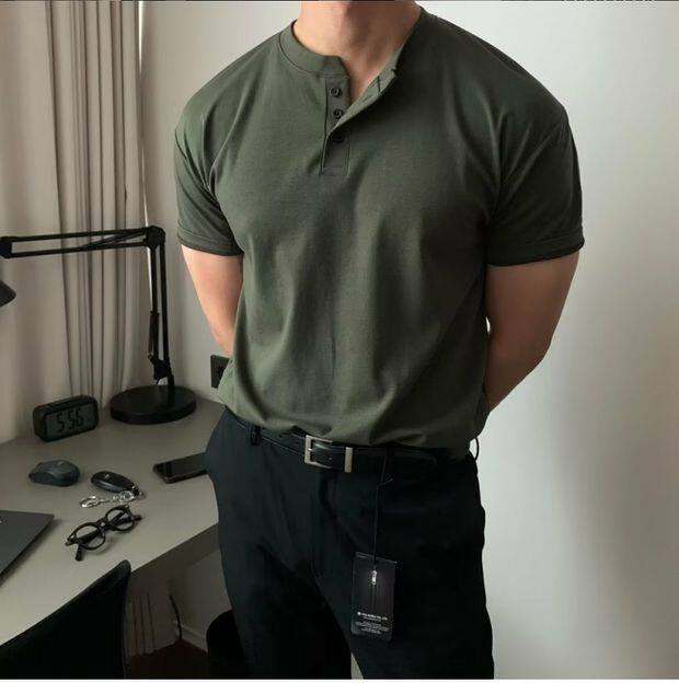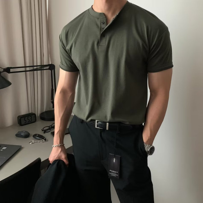 美式亨利領純棉t恤肌肉男硬漢修身短袖半開釦設計感v領運動上衣潮