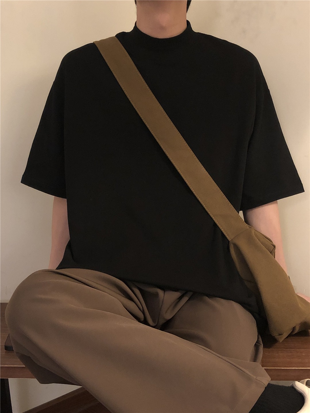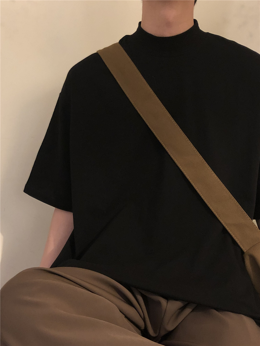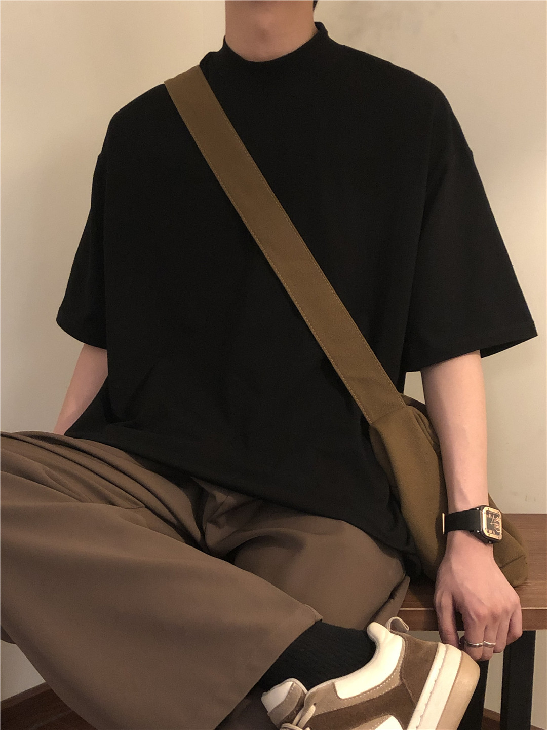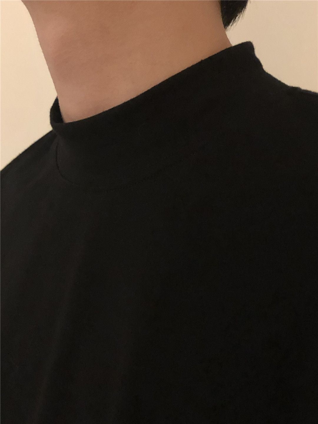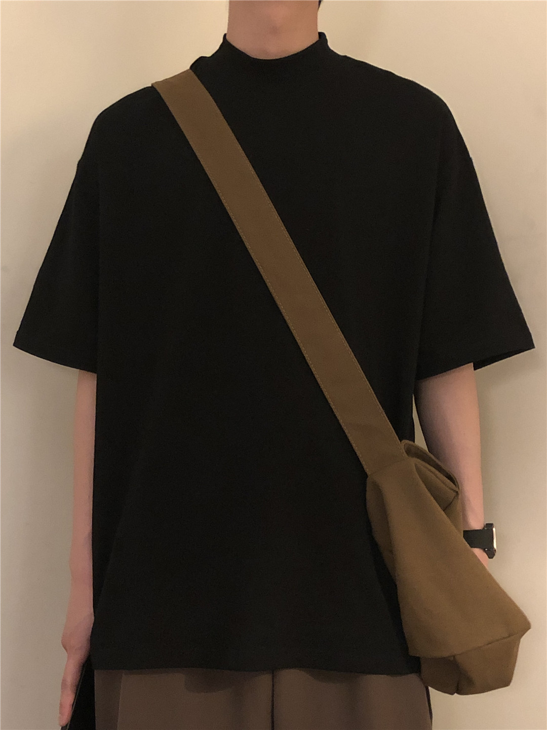 日系新款潮牌黑色半高領T恤男ina高街百搭純色短袖寬松五分袖上衣