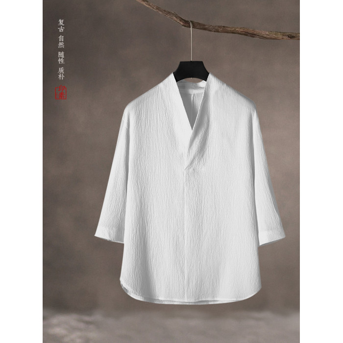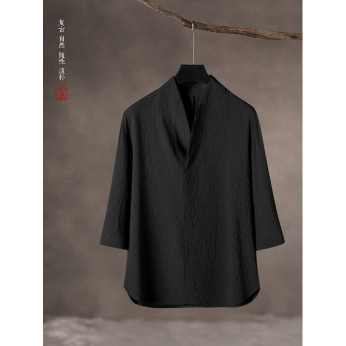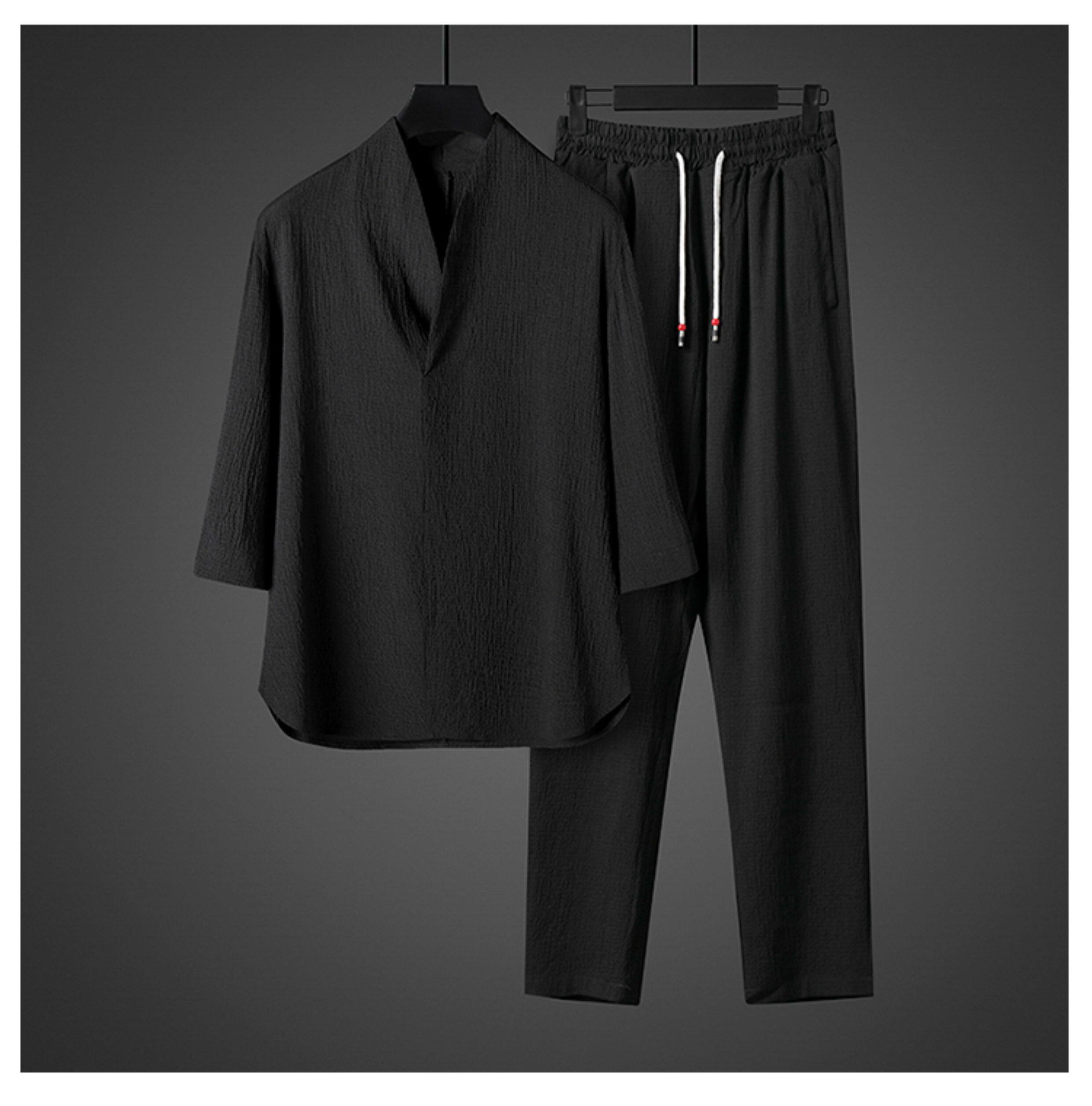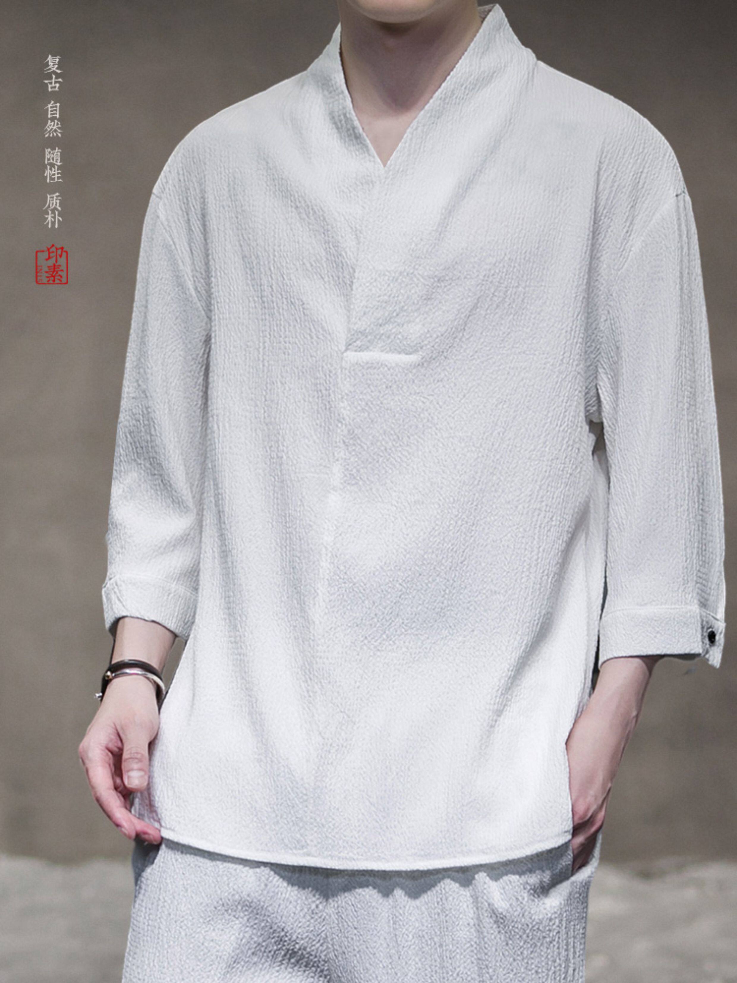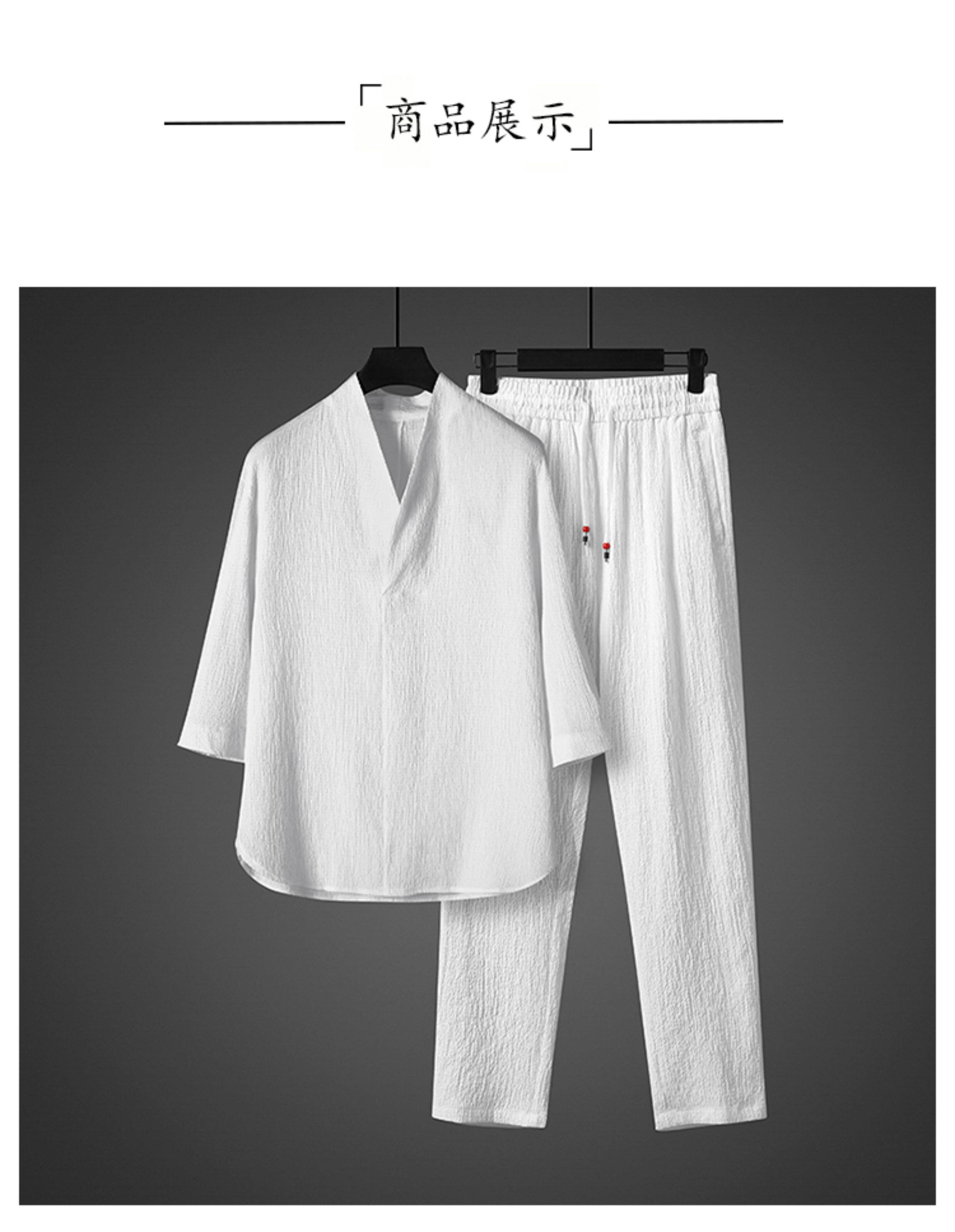 風男裝夏季復古風冰絲T恤短袖男士套裝上衣V領中式漢服七分袖