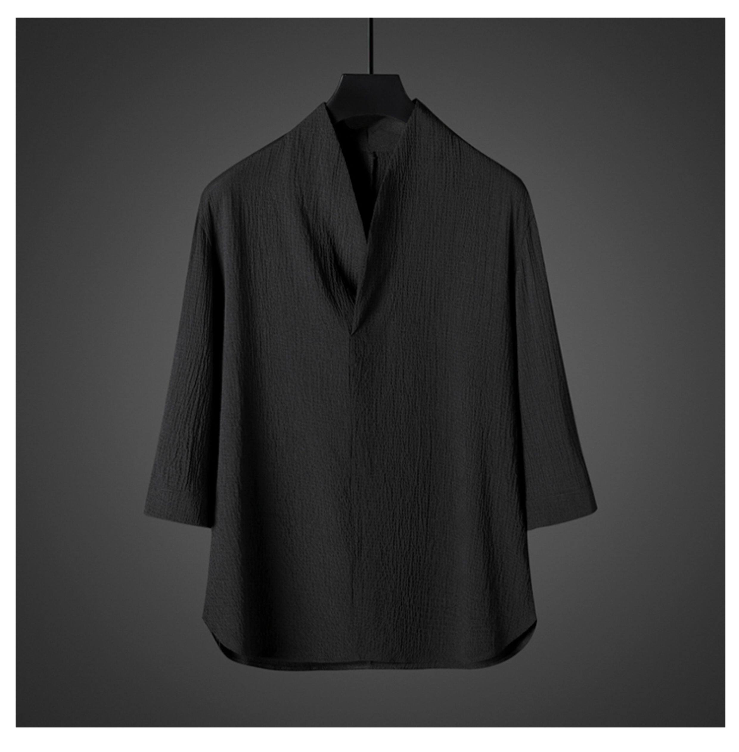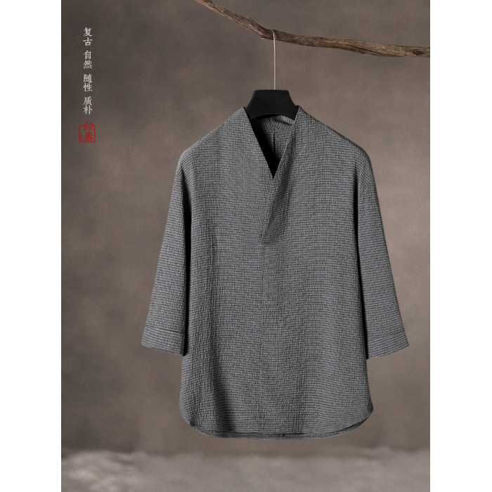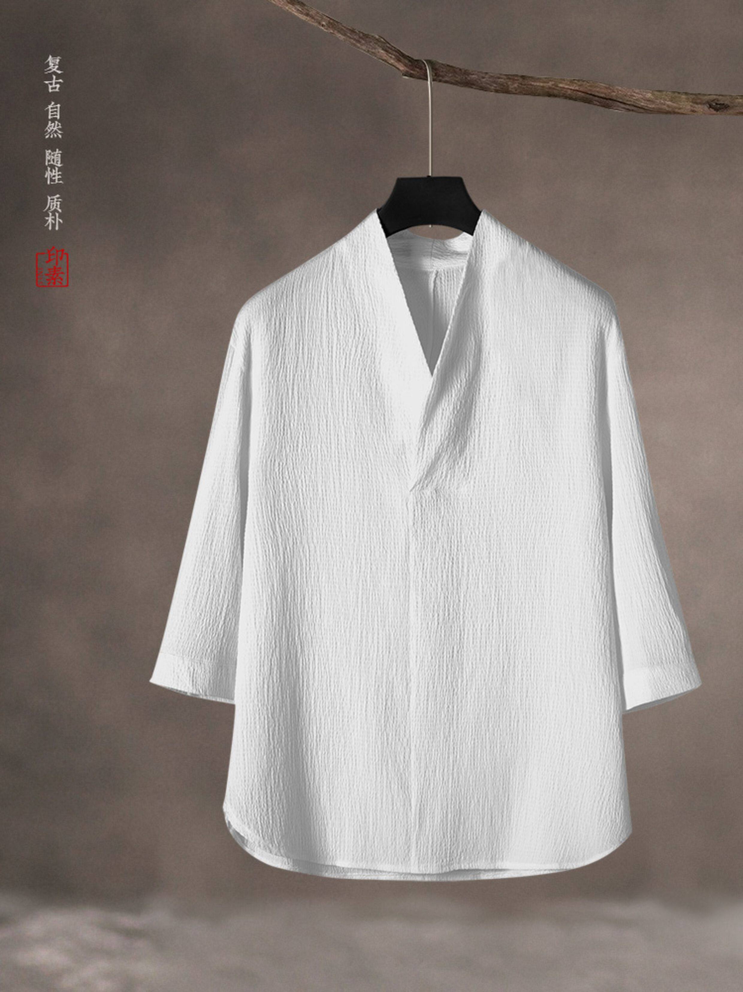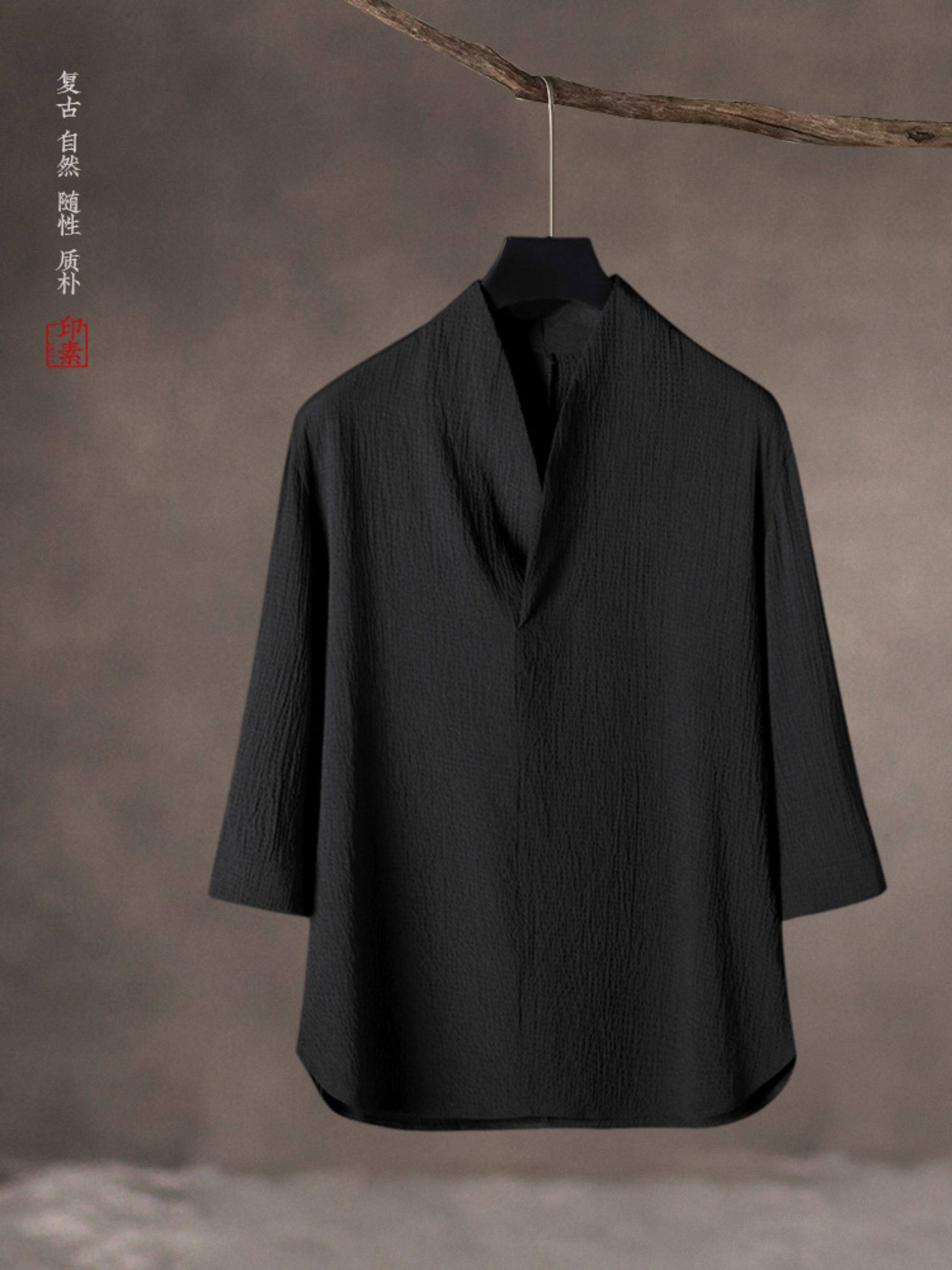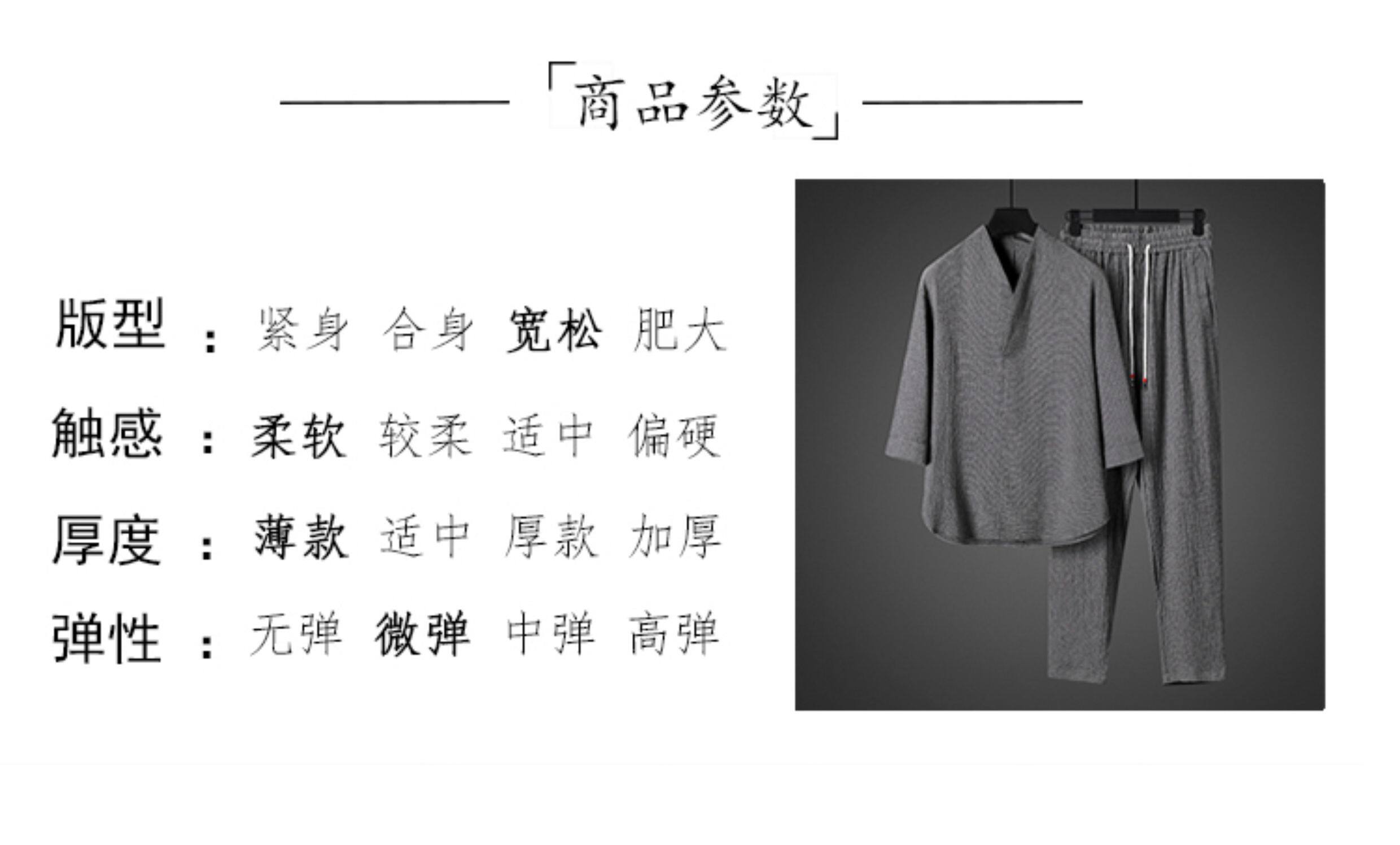 風男裝夏季復古風冰絲T恤短袖男士套裝上衣V領中式漢服七分袖