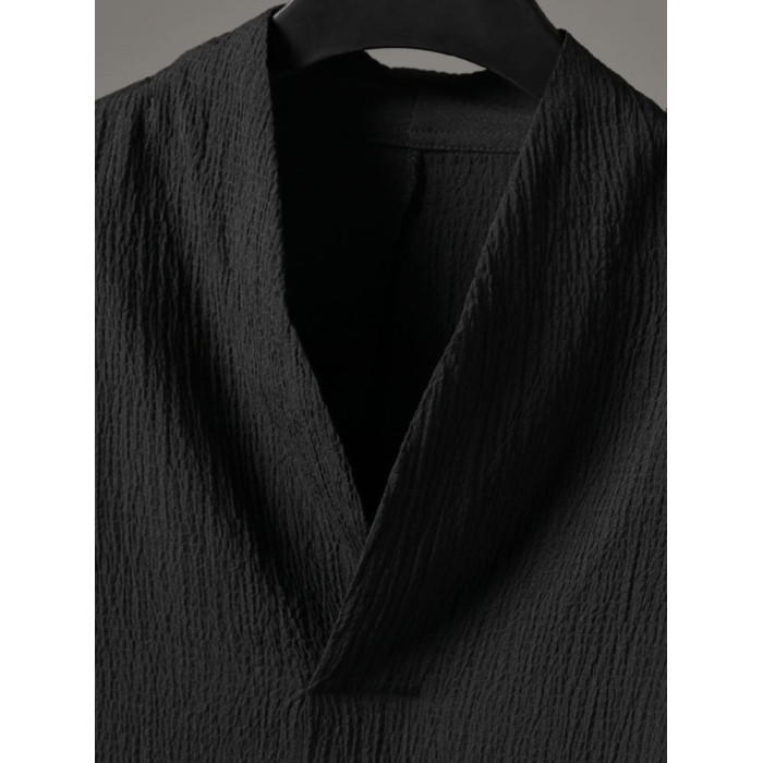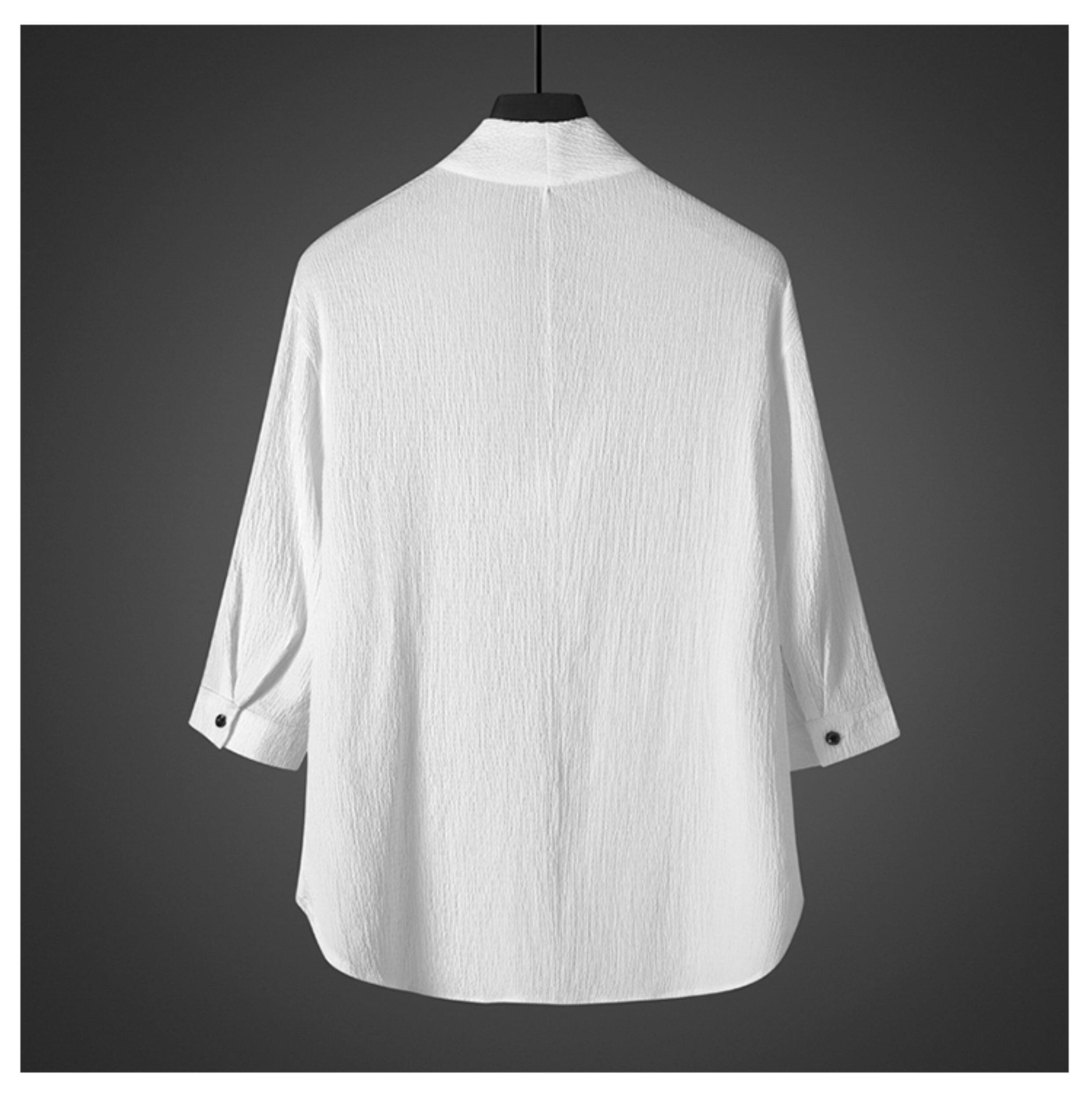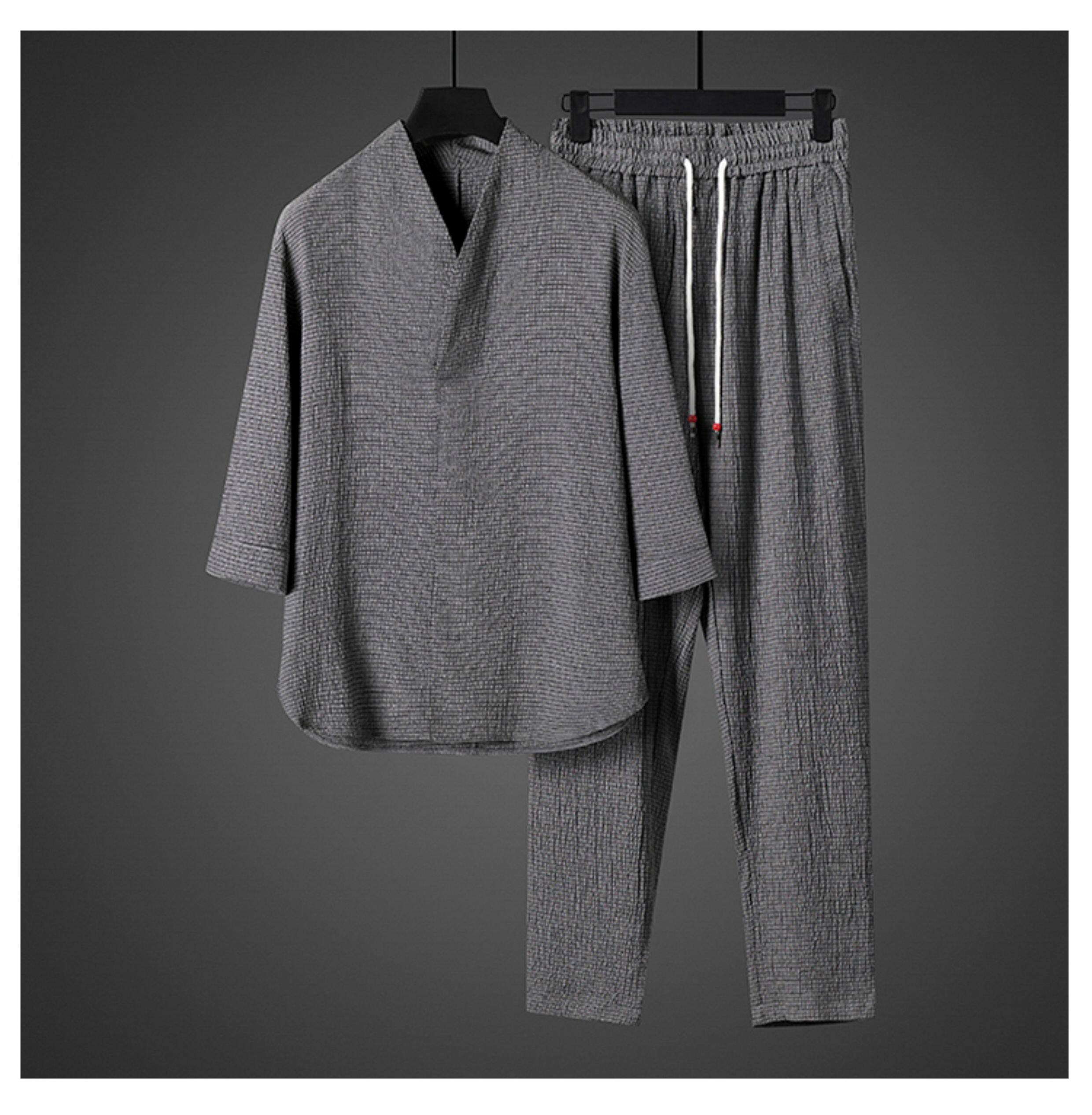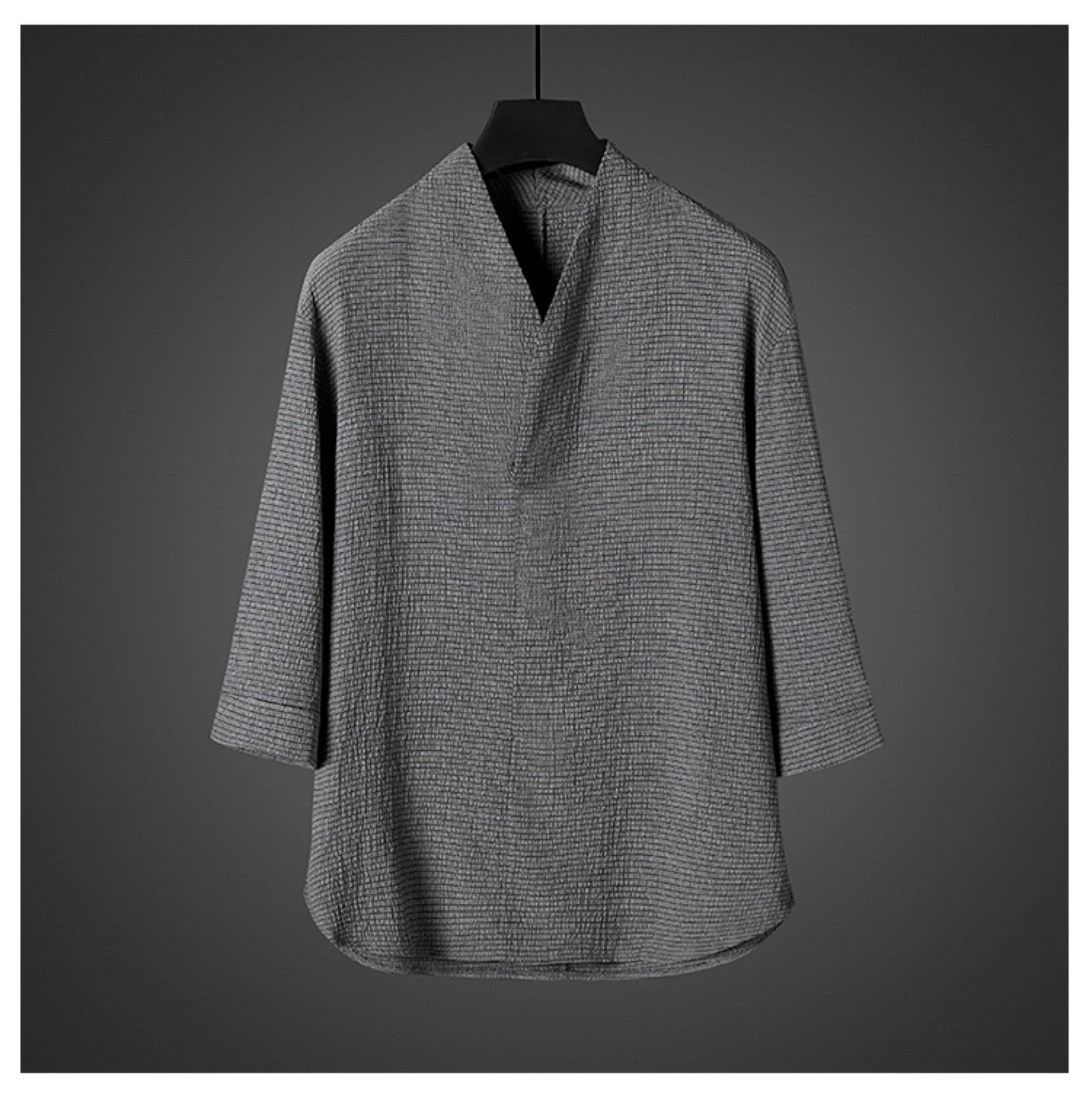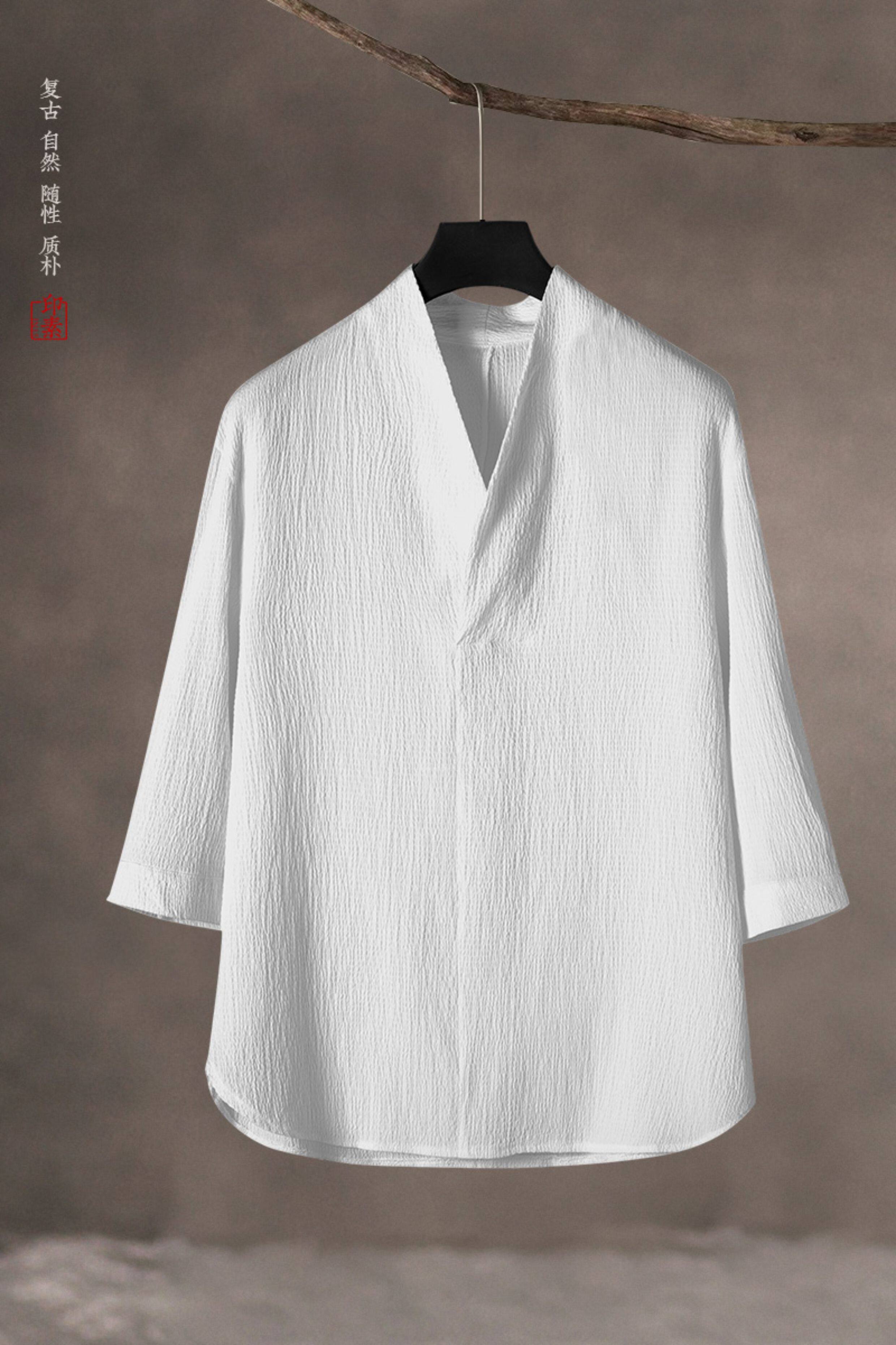 風男裝夏季復古風冰絲T恤短袖男士套裝上衣V領中式漢服七分袖