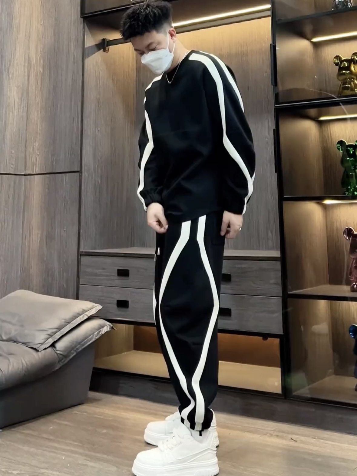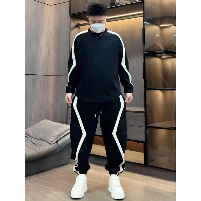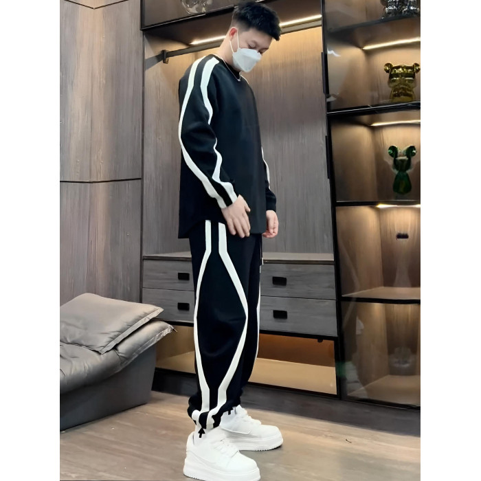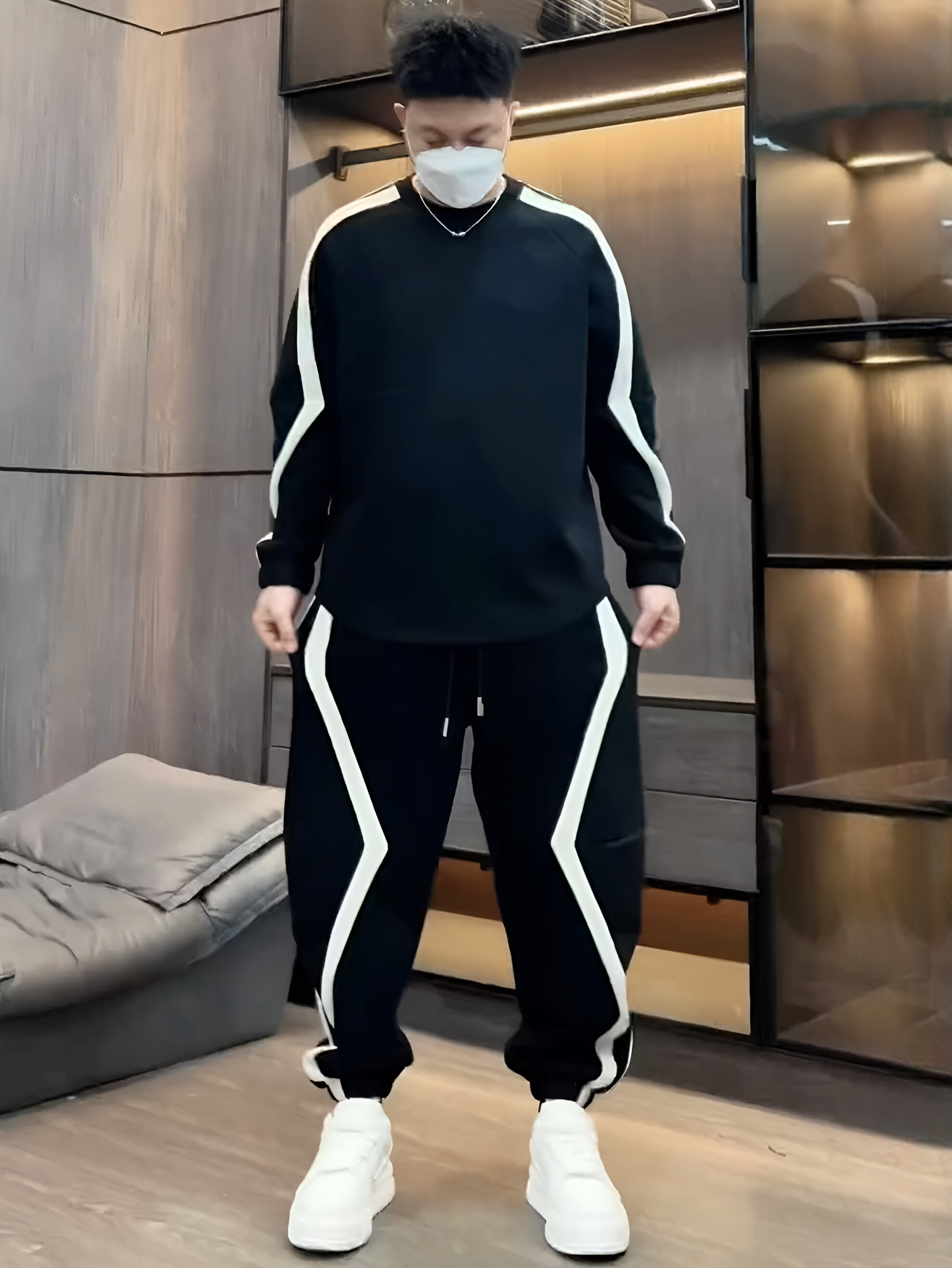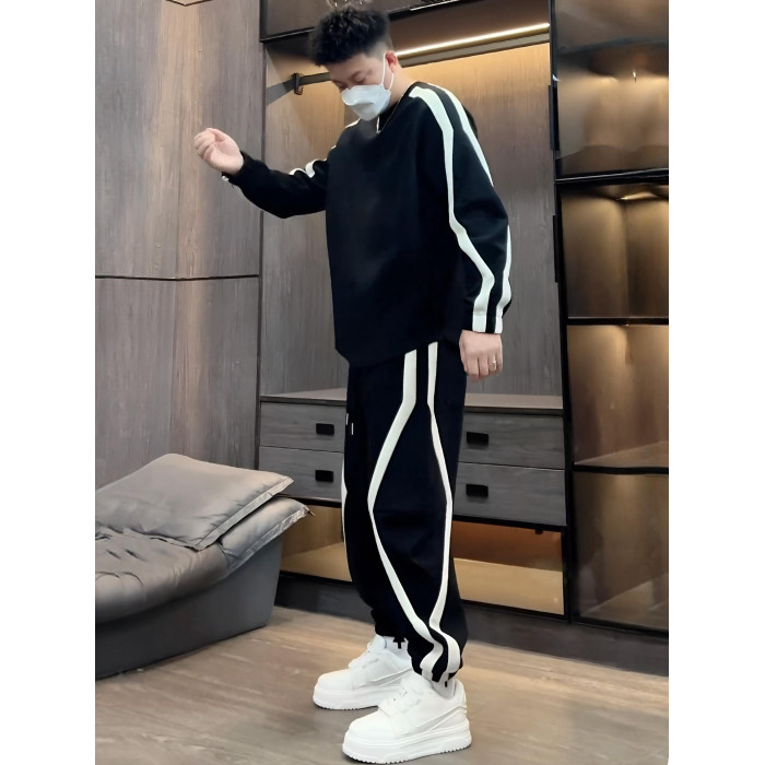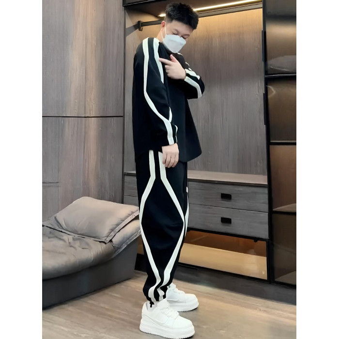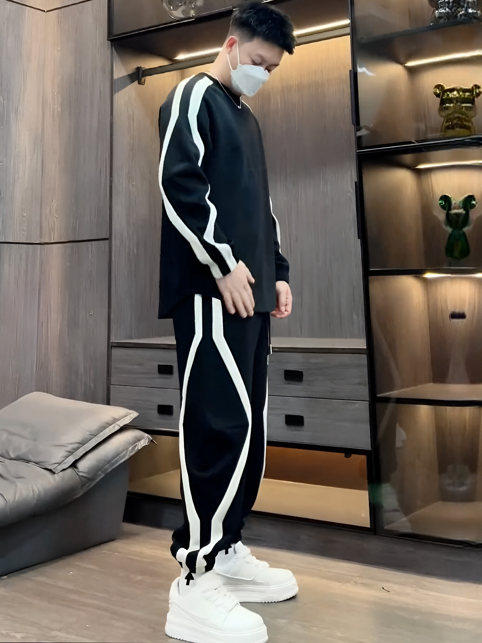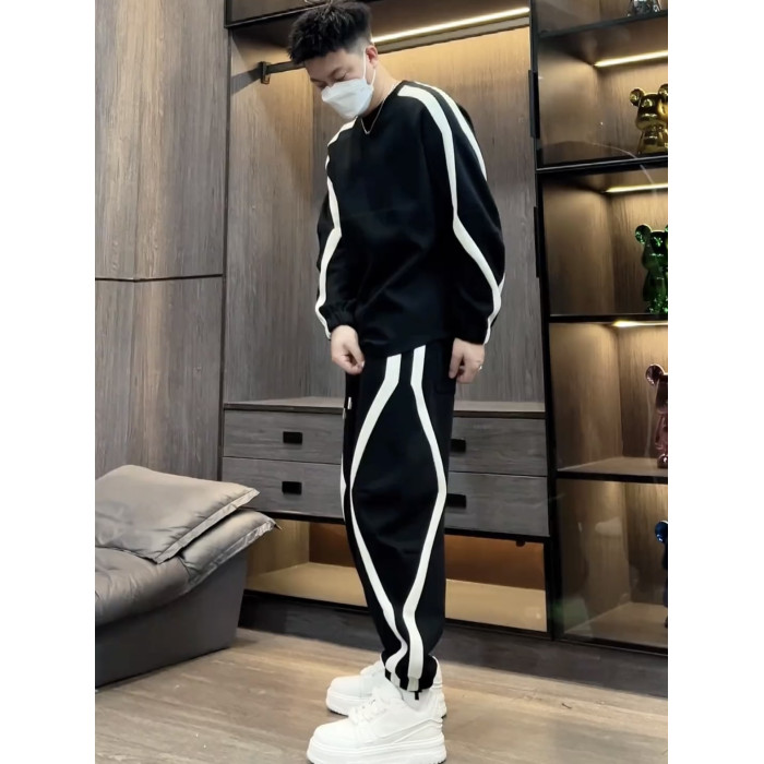 春秋新款條紋拼接圓領衛衣衛褲兩件套男潮流高級寬松運動休閒套裝