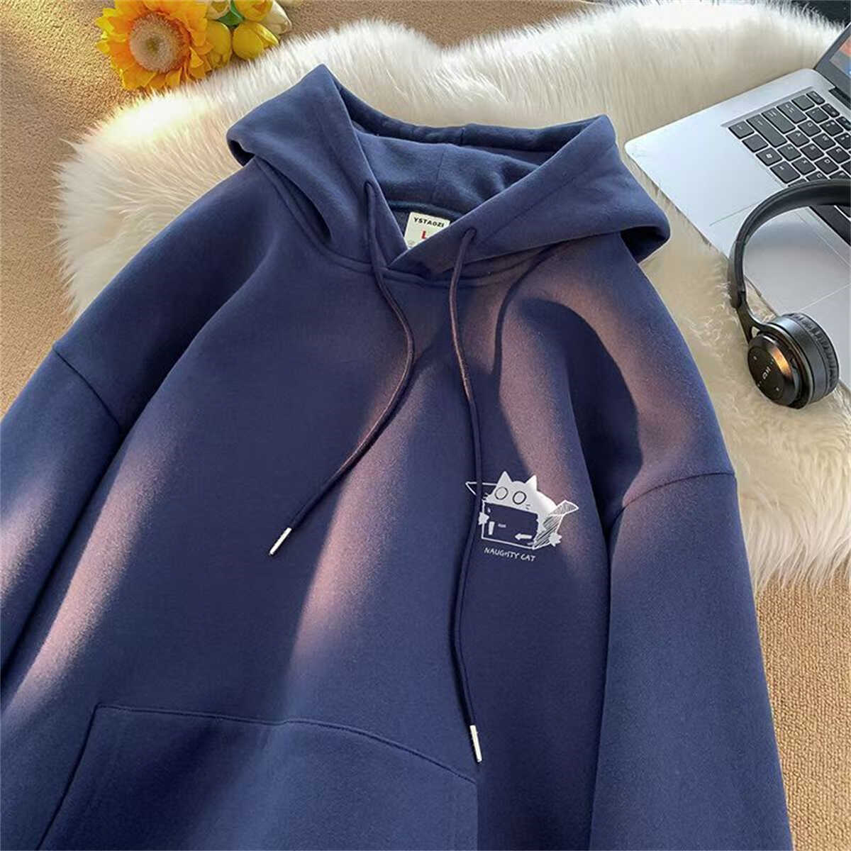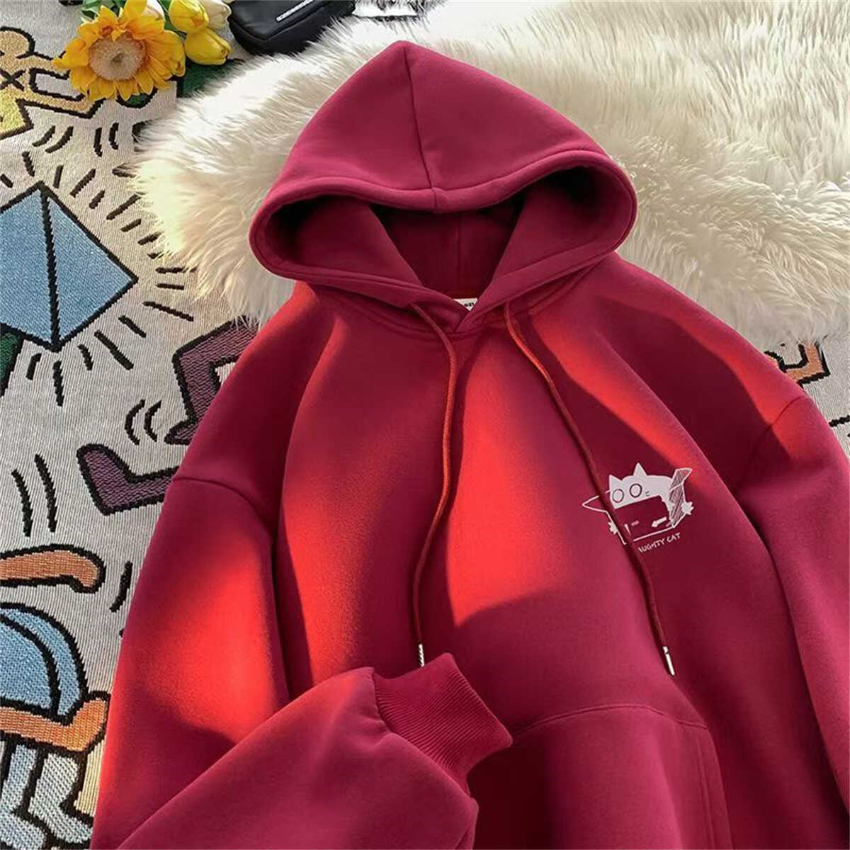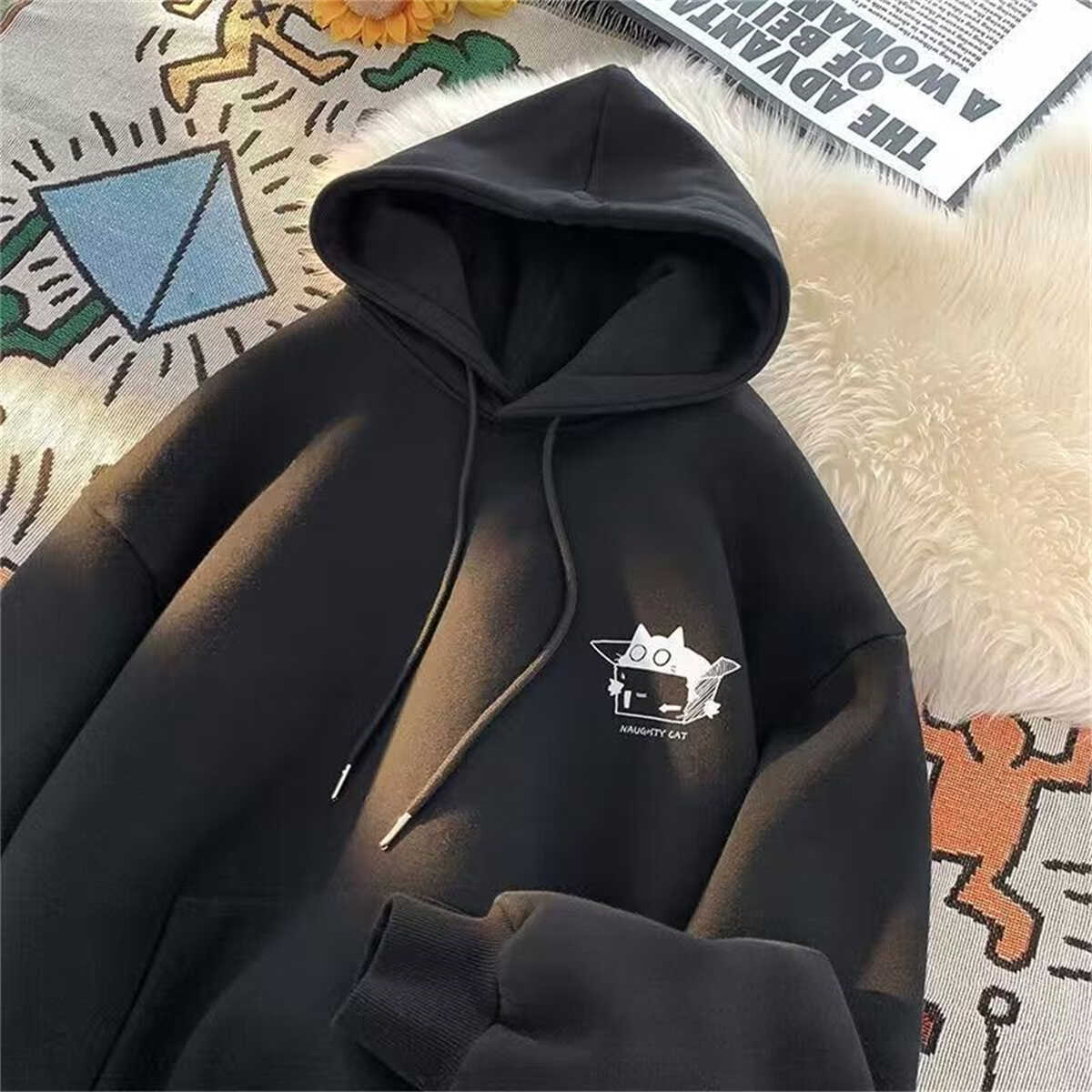 高級感痞帥潮流卡通美式復古重磅100%純棉連帽衛衣男秋冬寬松加絨