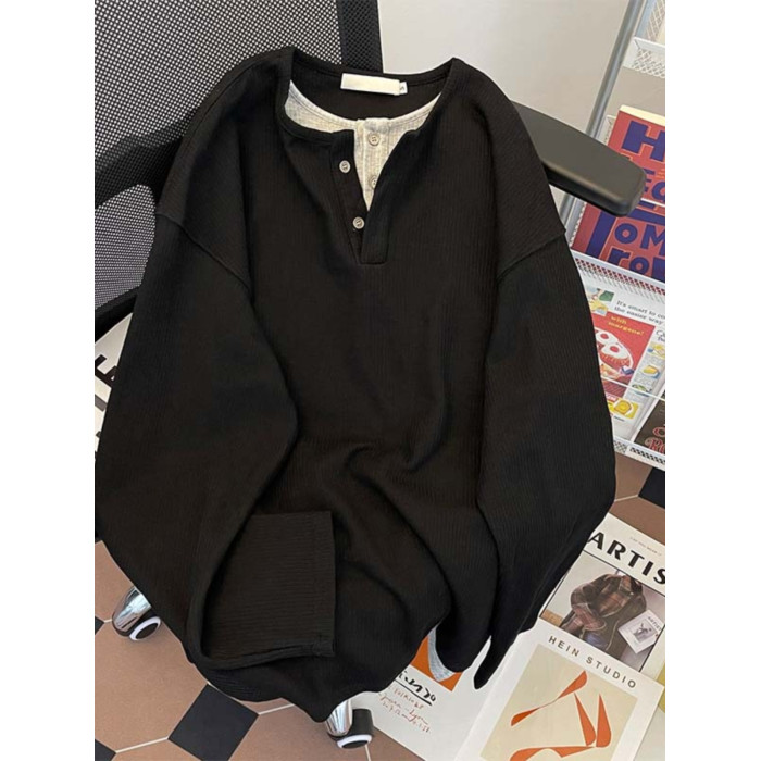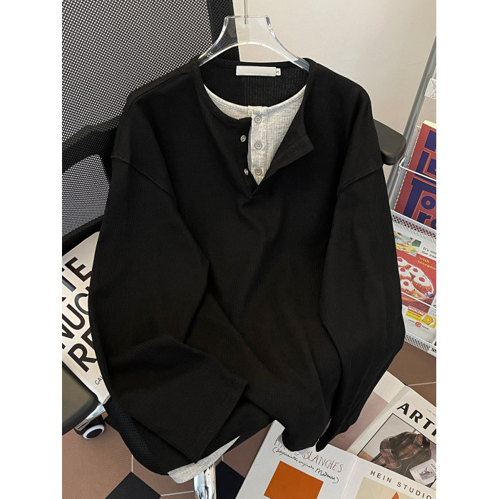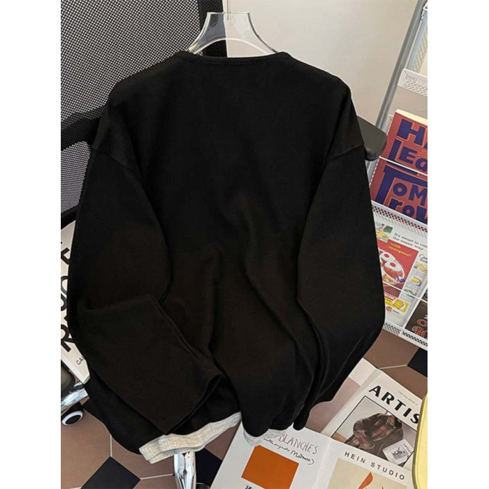 春秋圓領衛衣男套頭假兩件休閒潮牌青少年設計感美式運動初秋上衣