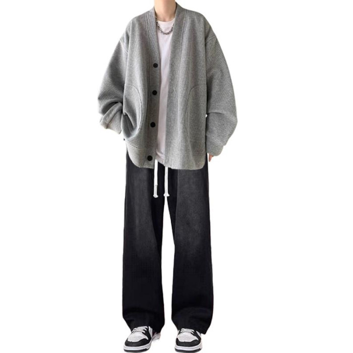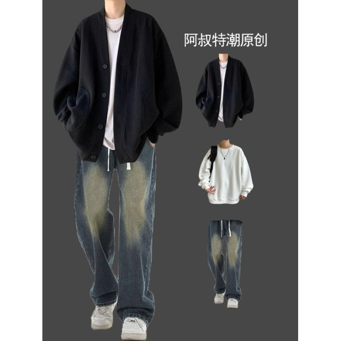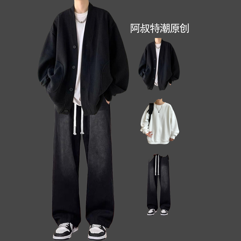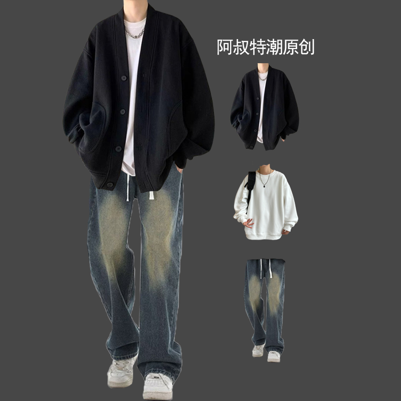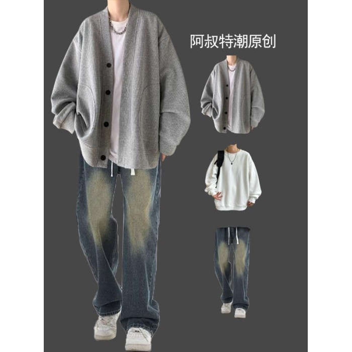 春秋男士華夫格日系開衫三件套裝搭配痞帥搭配牛仔褲潮牌高街一套