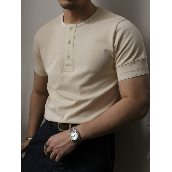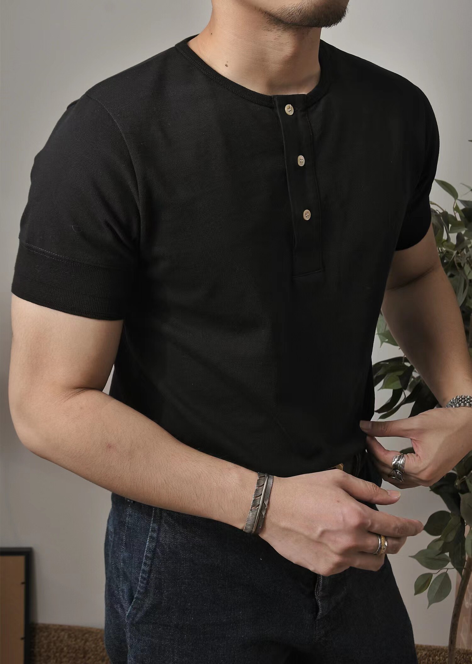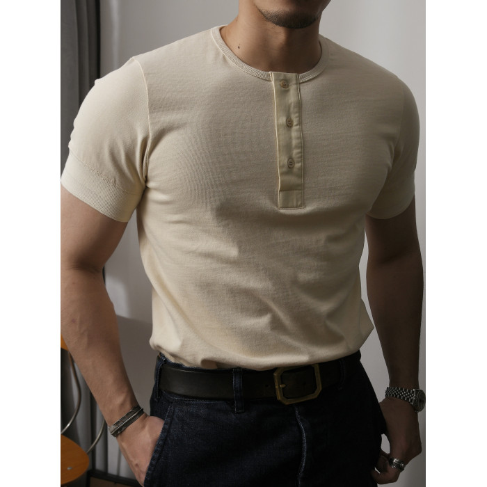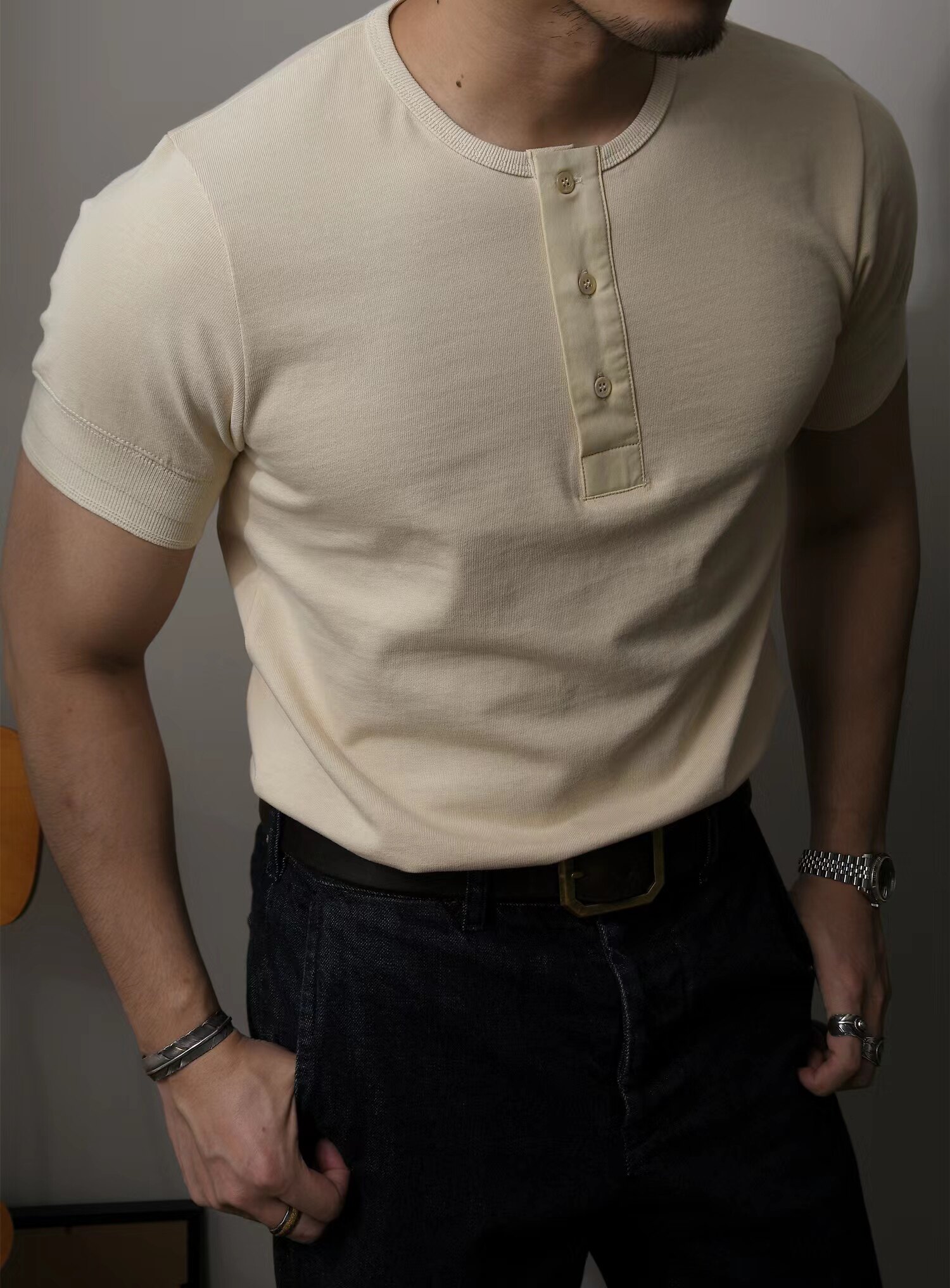 柴米300g亨利領重磅T恤男美式復古阿美哢嘰短袖修身純色全棉夏季
