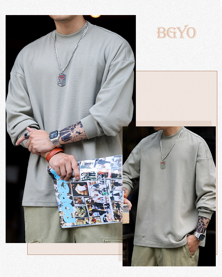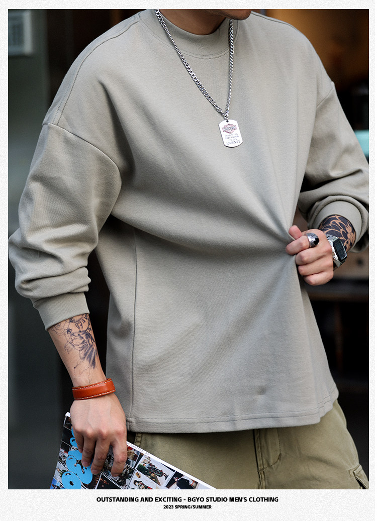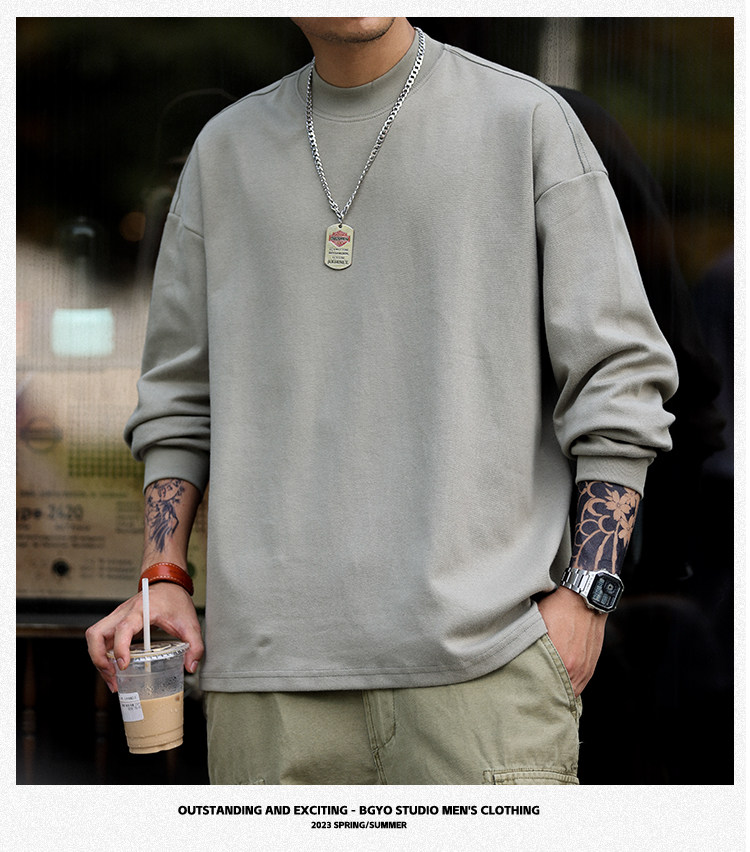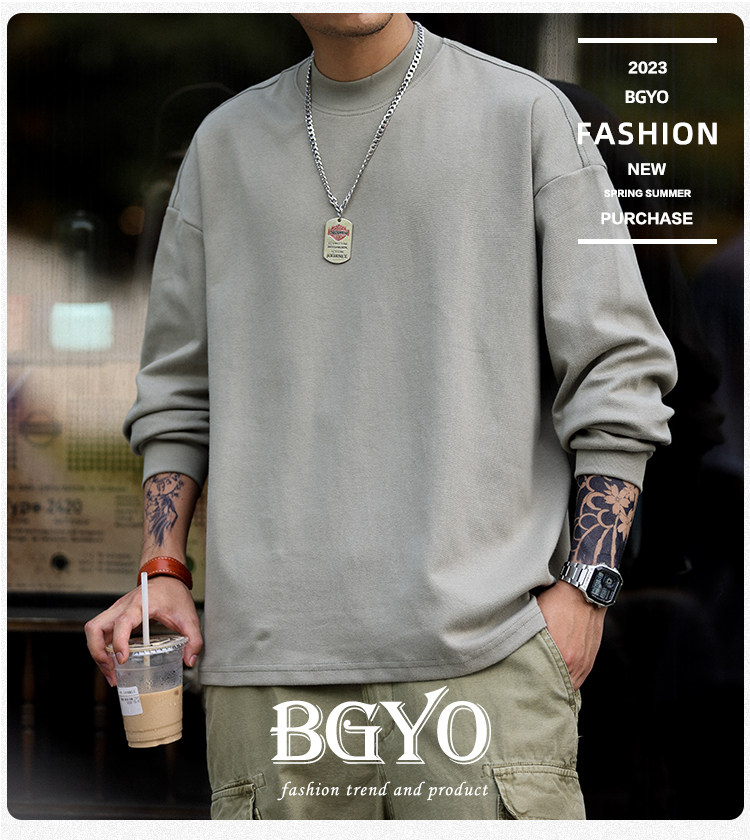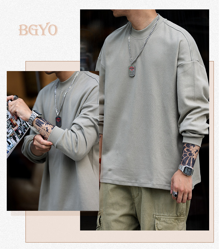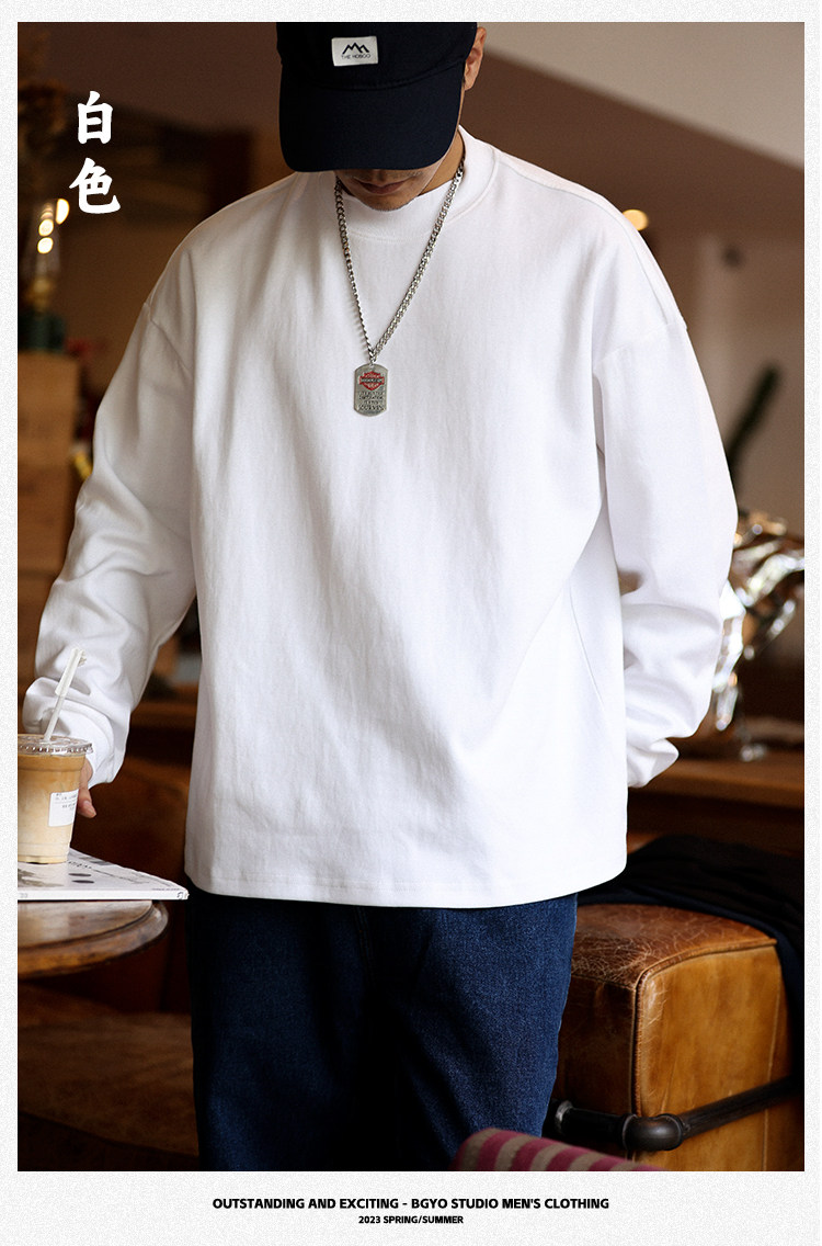 BGYO 日系小領口設計長袖T恤男重磅寬松復古純色休閒內搭打底TEE
