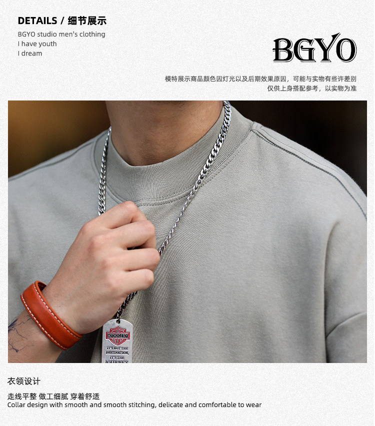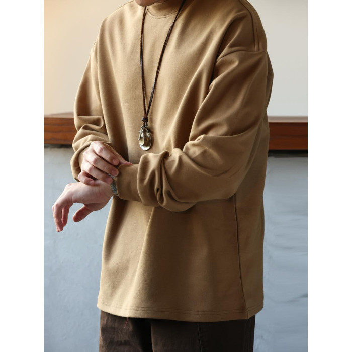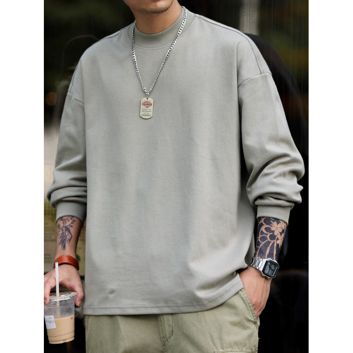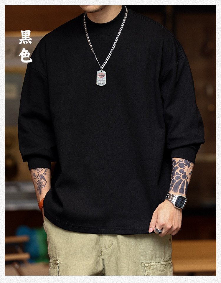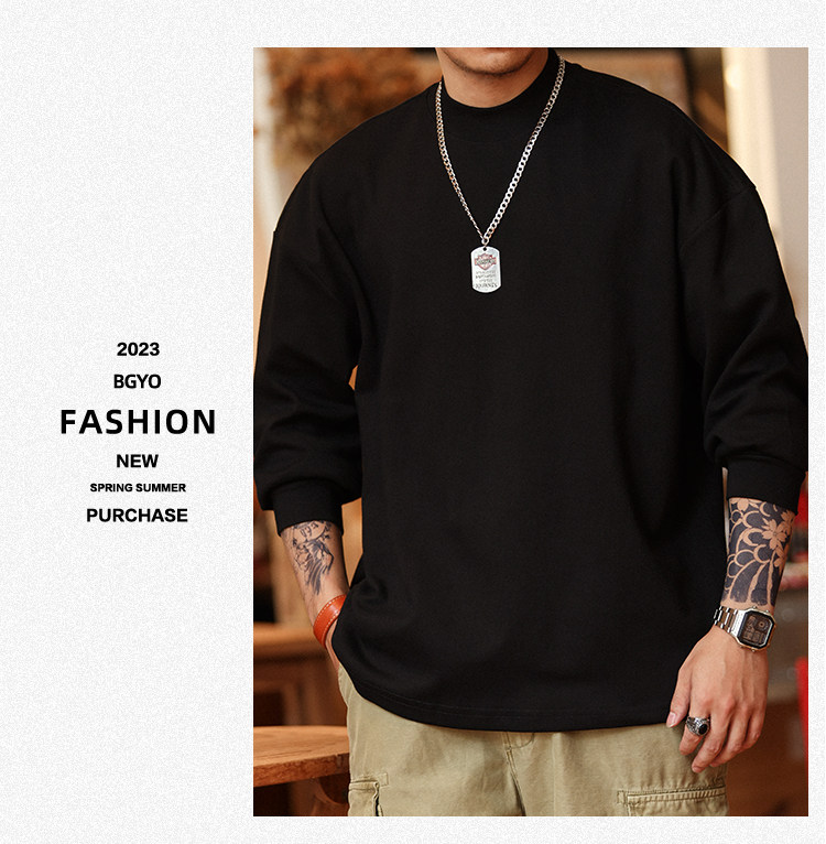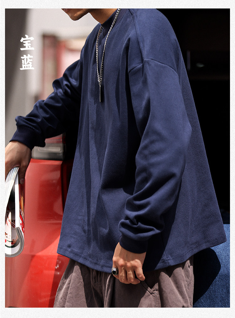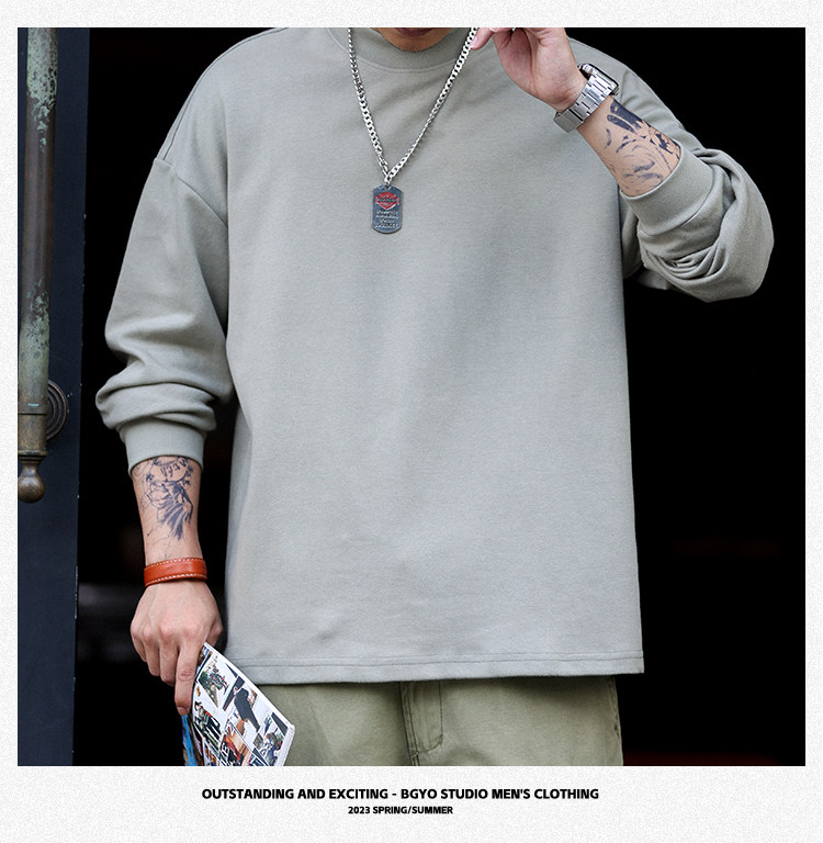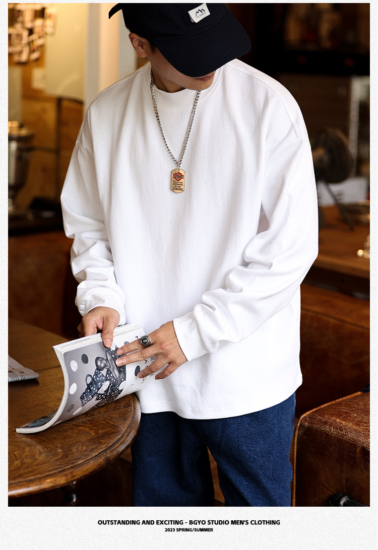 BGYO 日系小領口設計長袖T恤男重磅寬松復古純色休閒內搭打底TEE