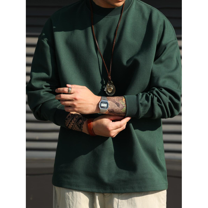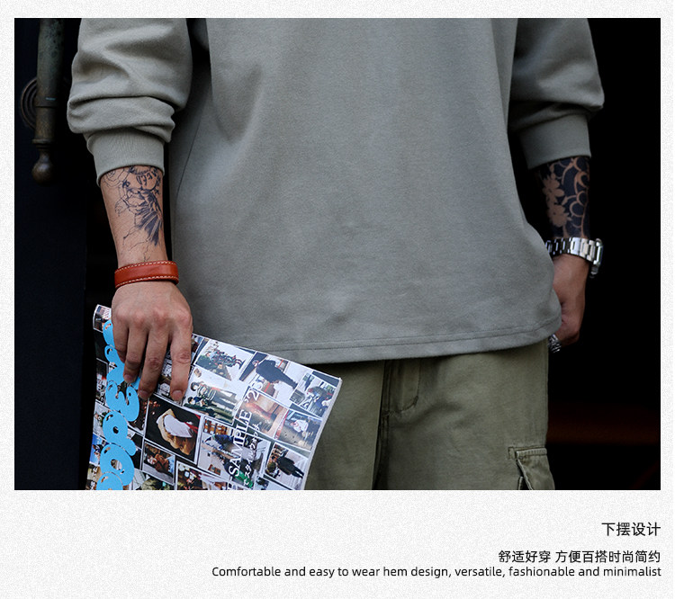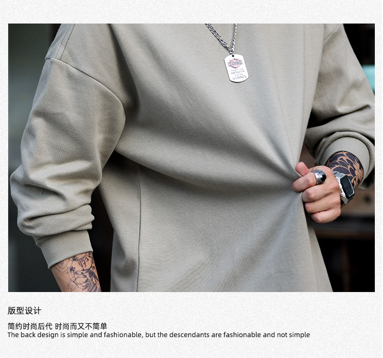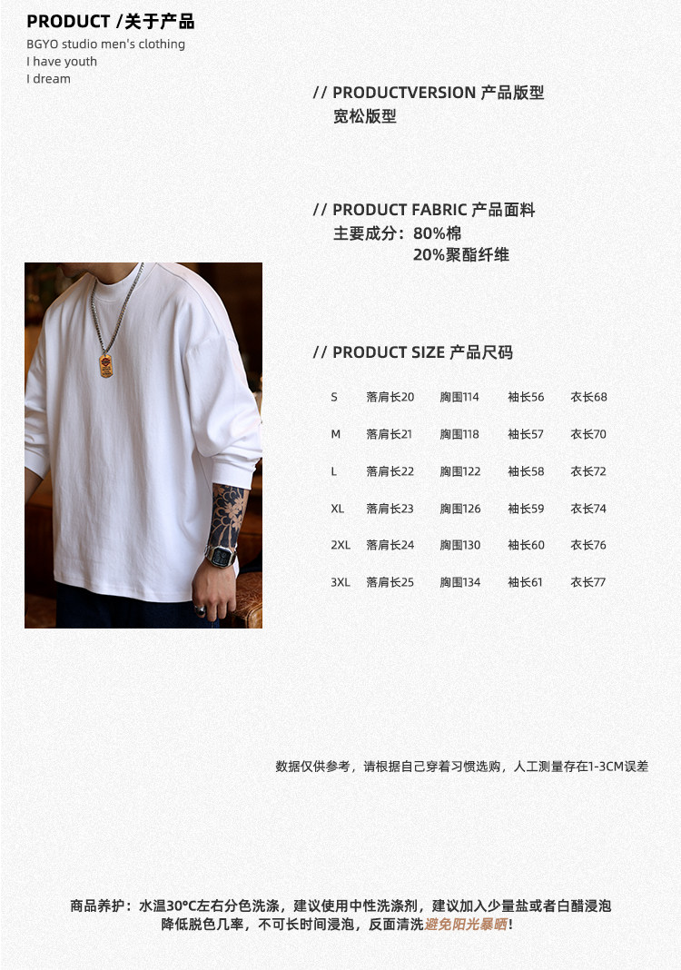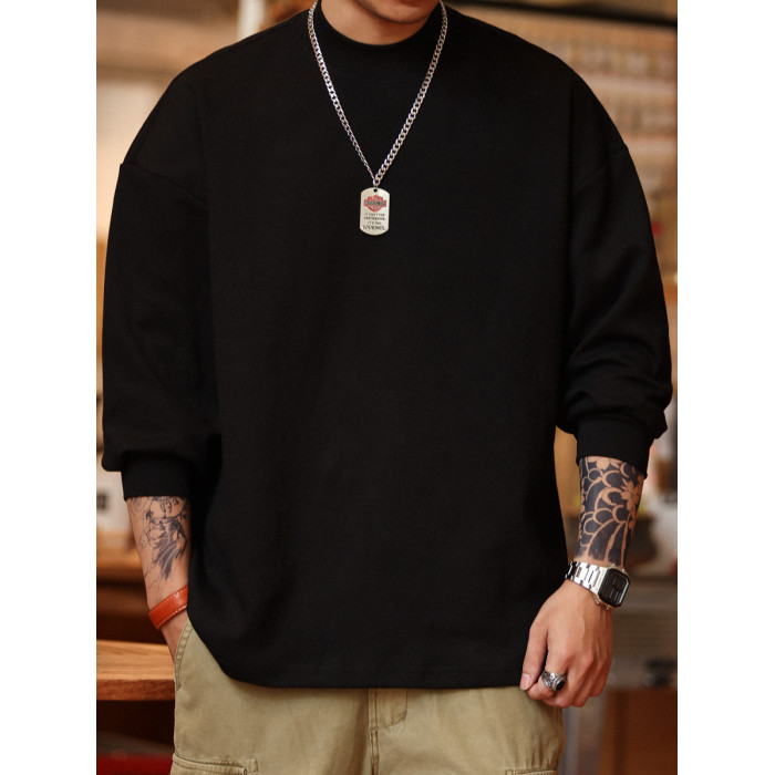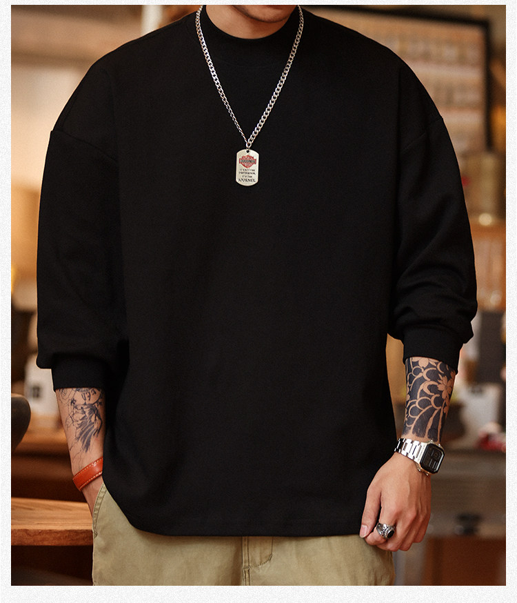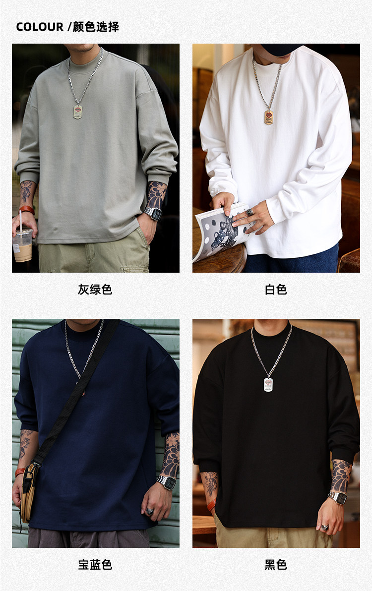 BGYO 日系小領口設計長袖T恤男重磅寬松復古純色休閒內搭打底TEE