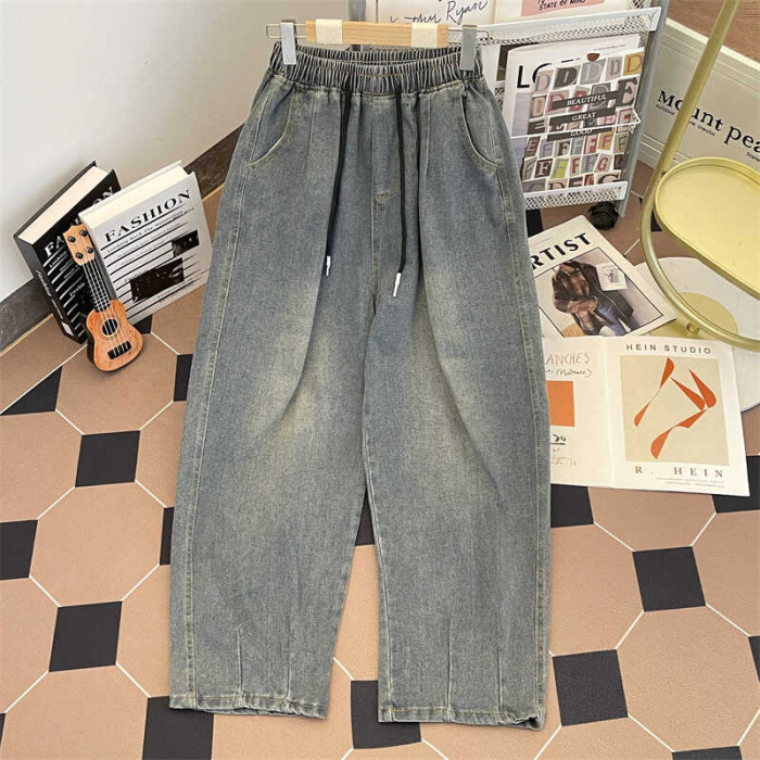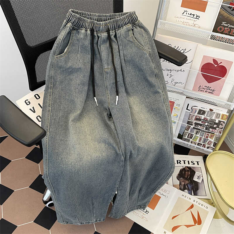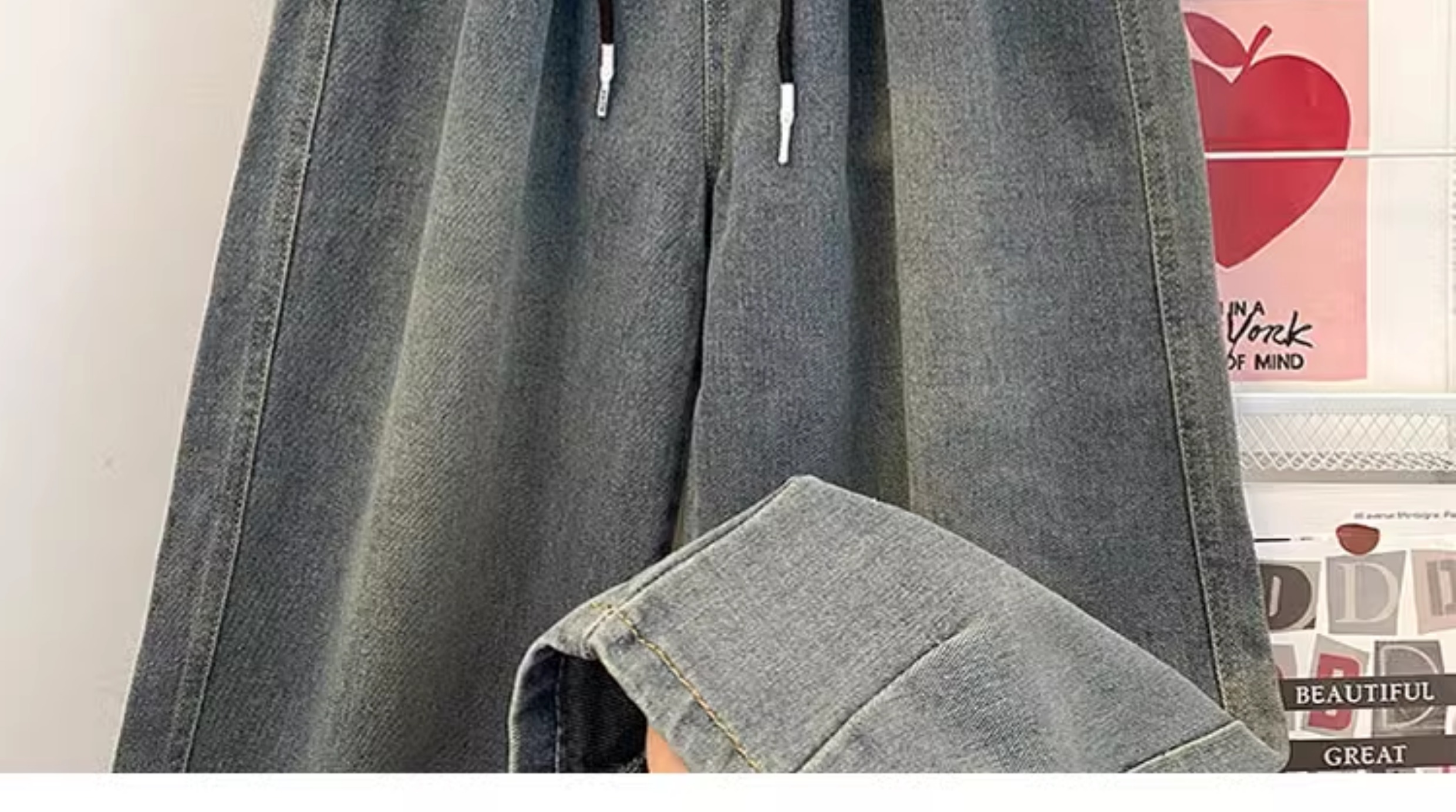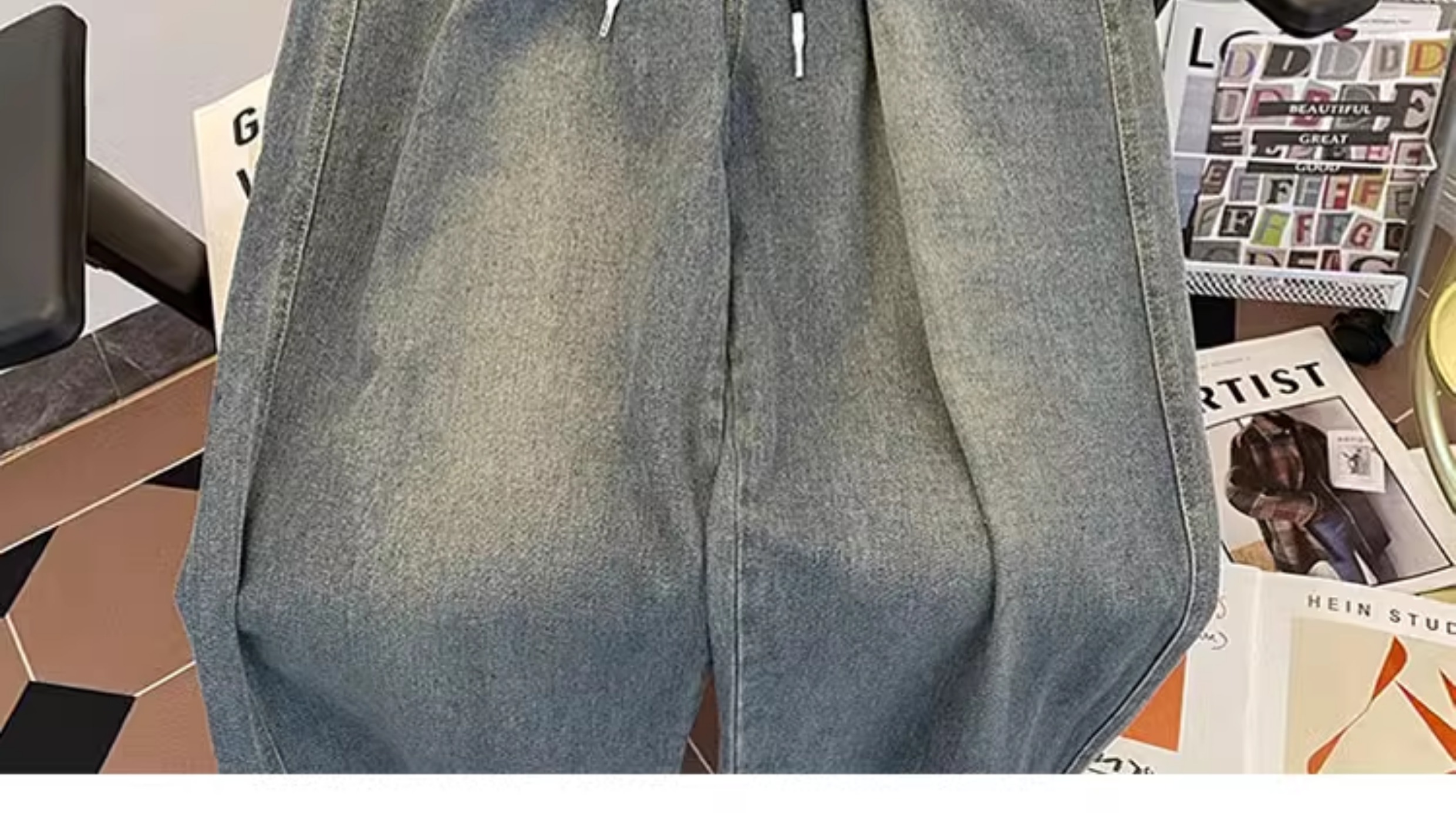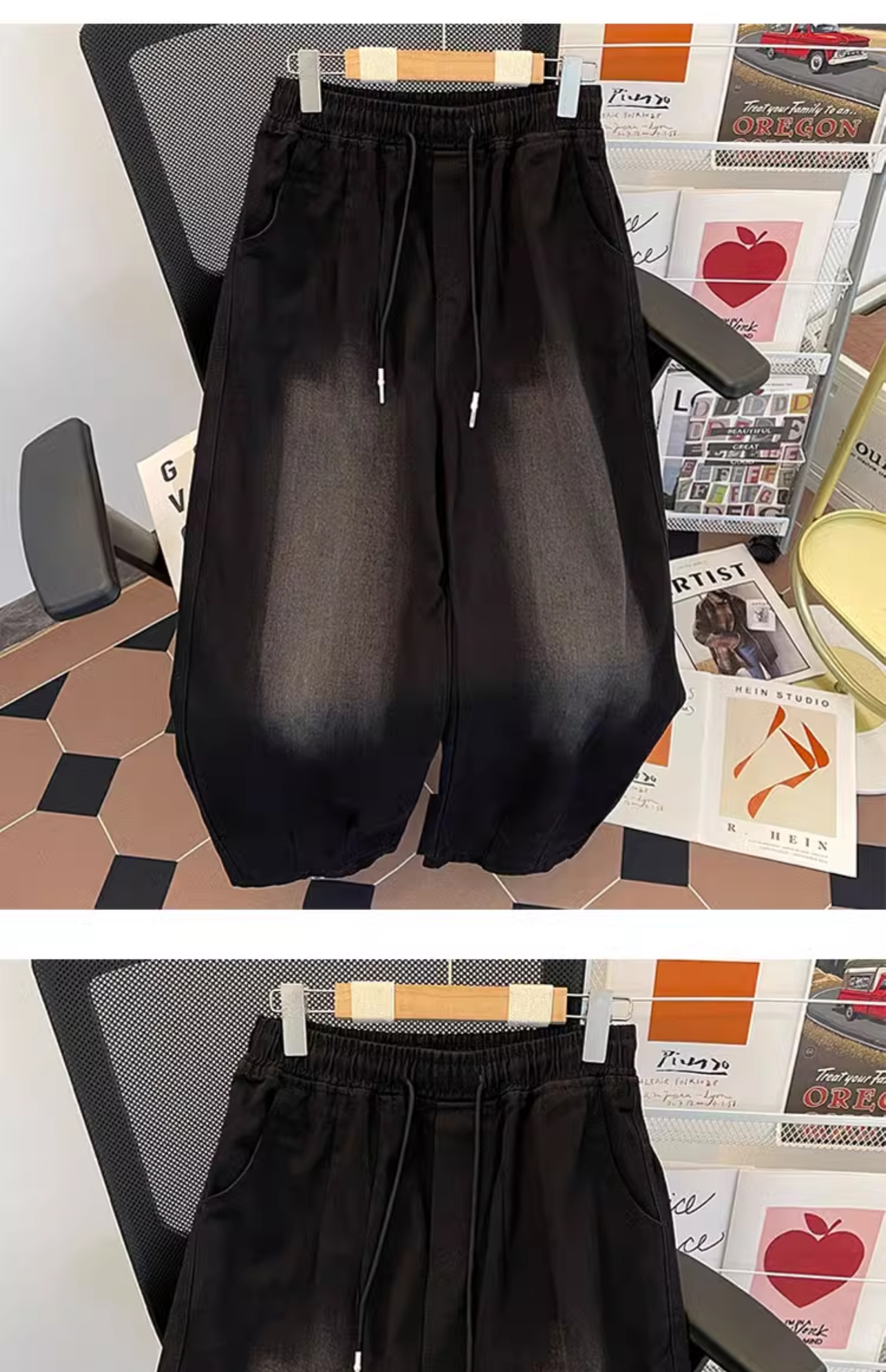 美式垂感復古牛仔褲男高街潮牌松緊腰抽繩濶腿褲子男生休閒長褲子