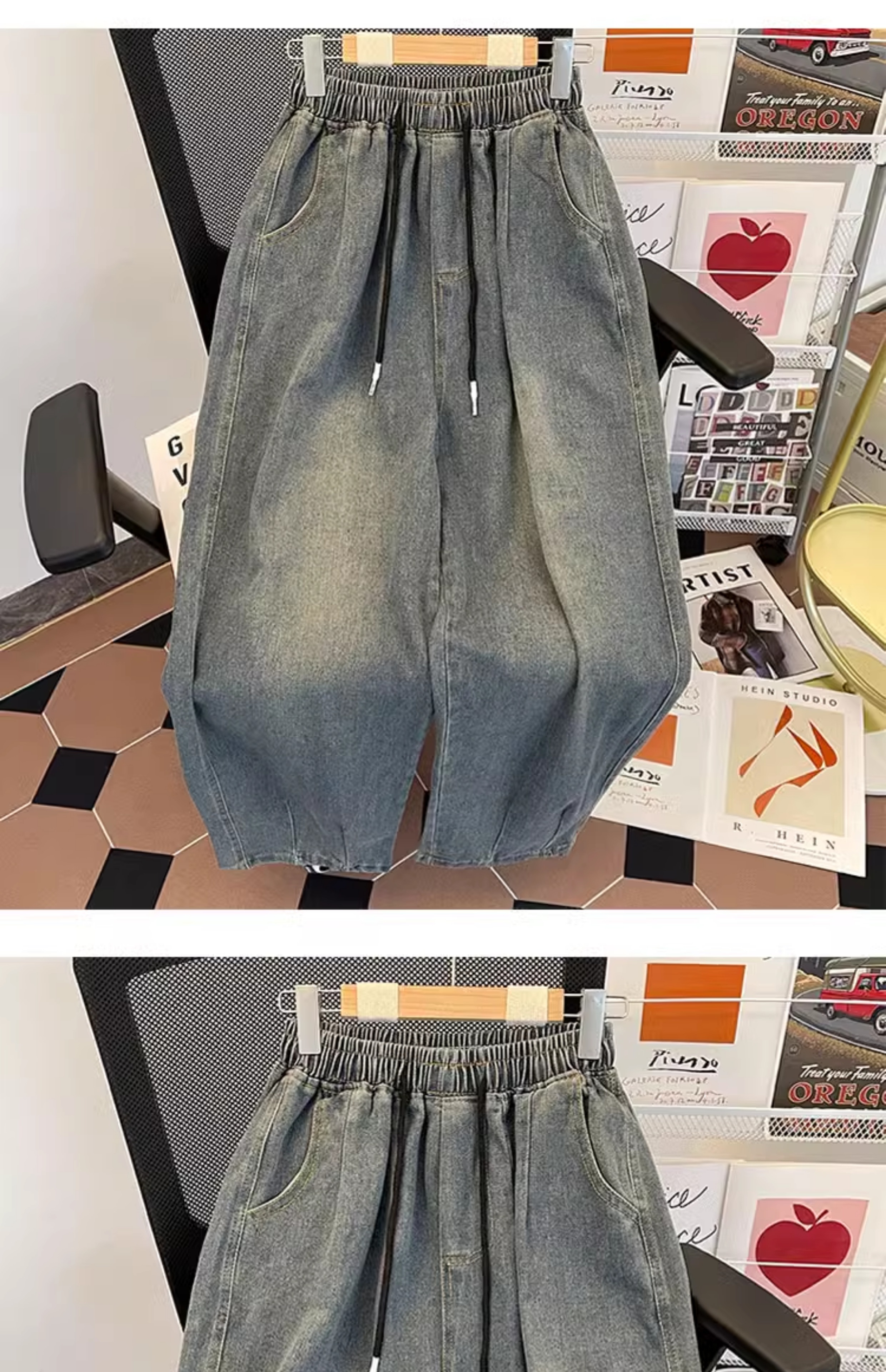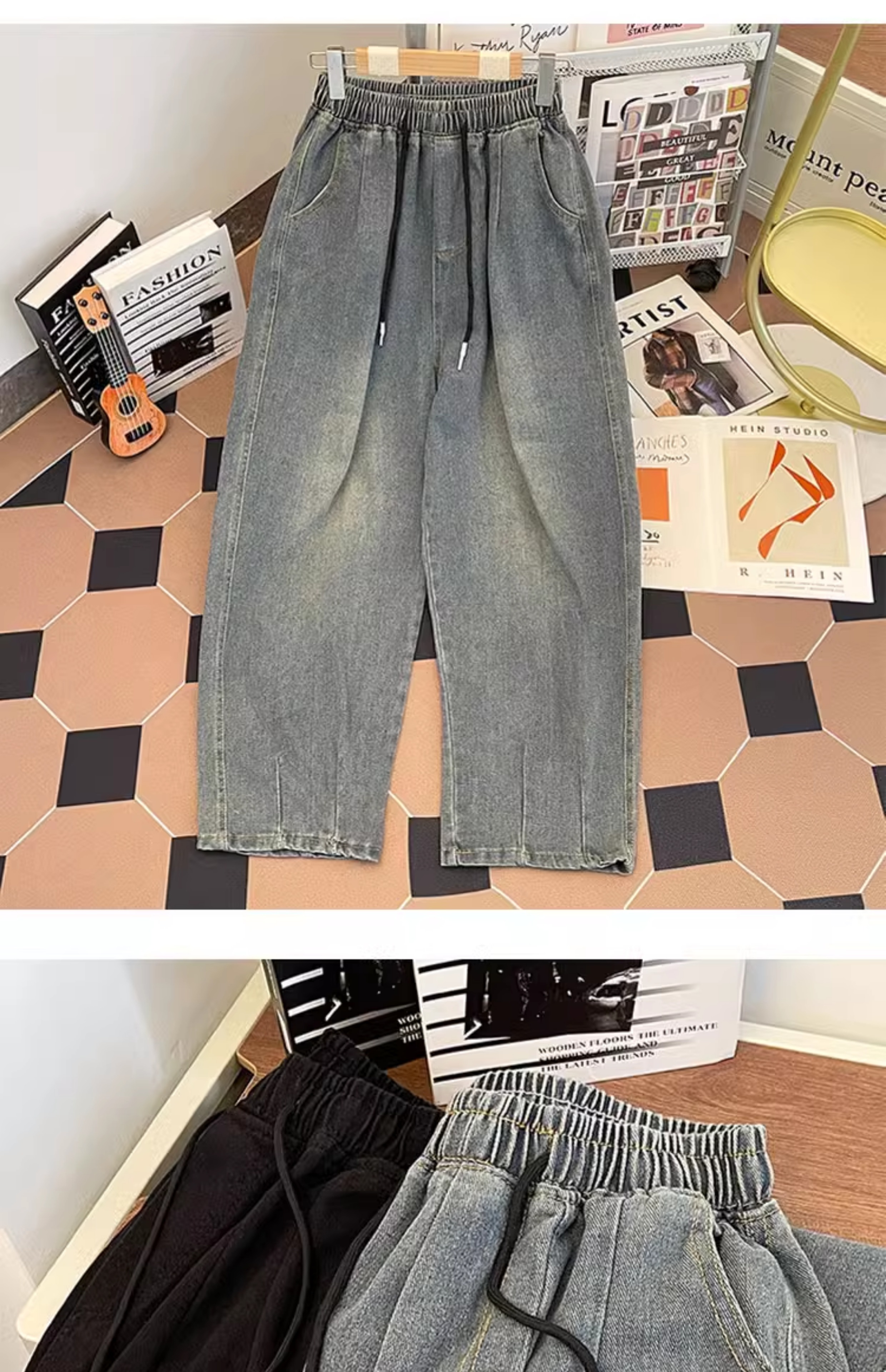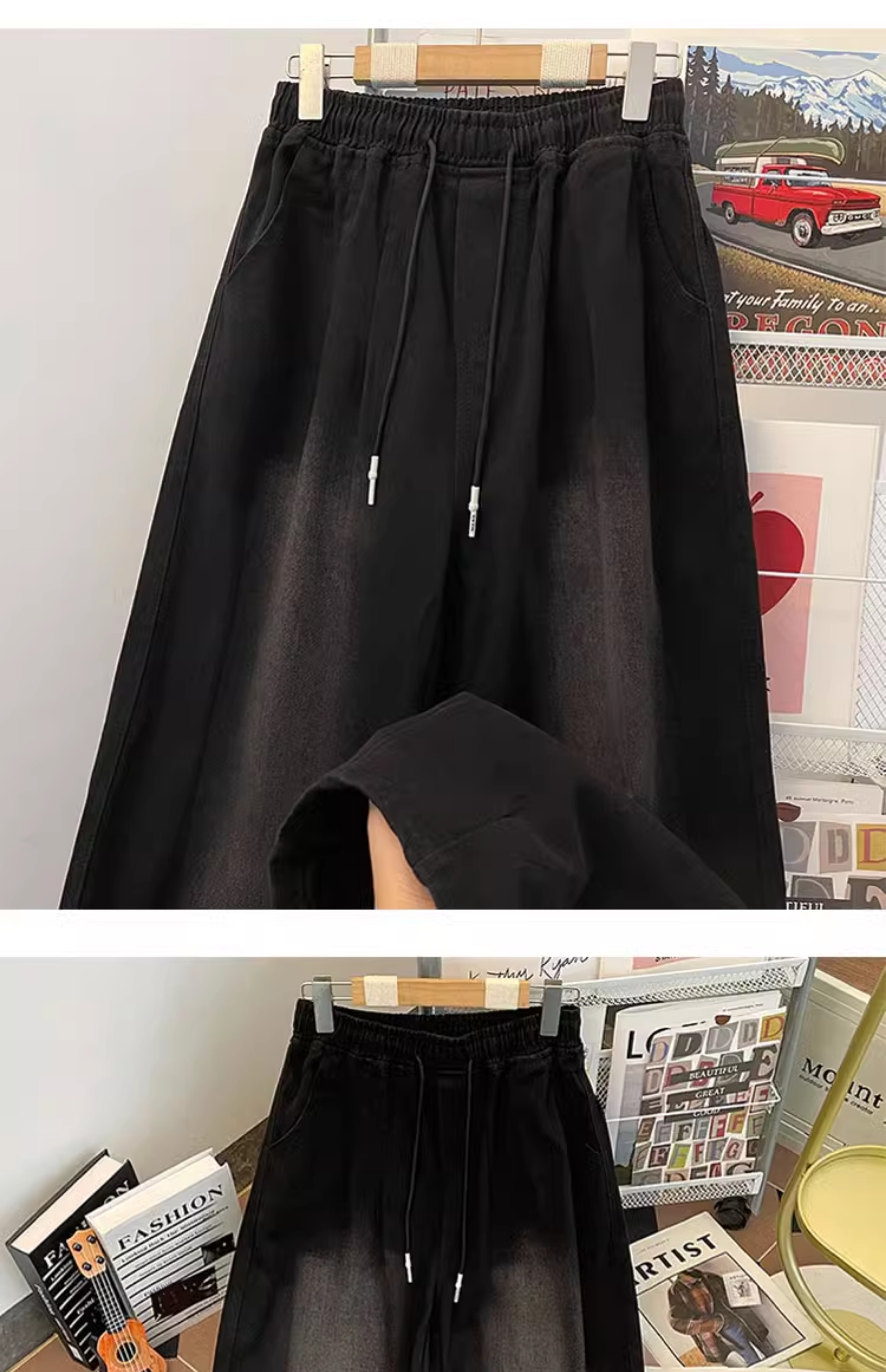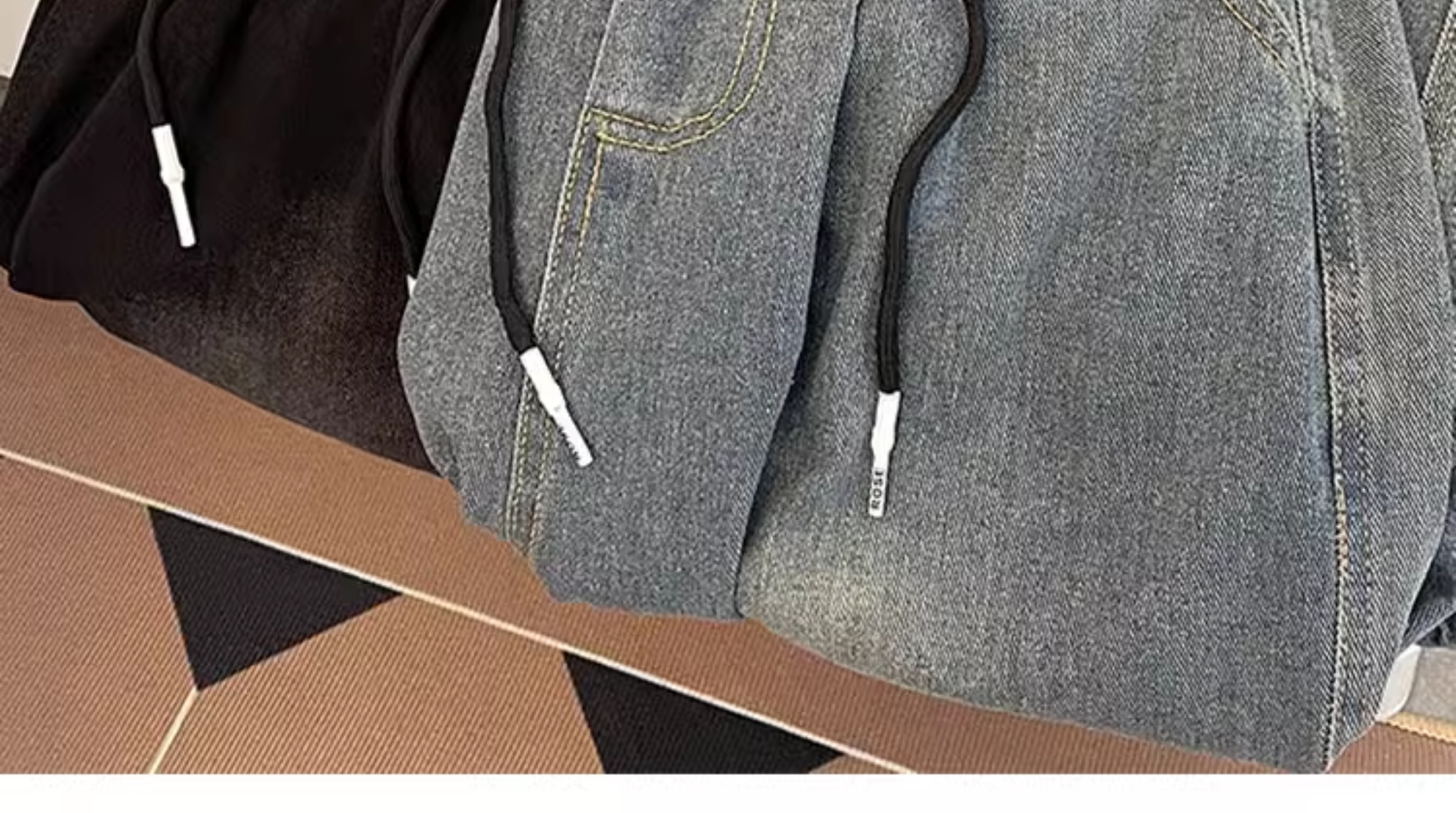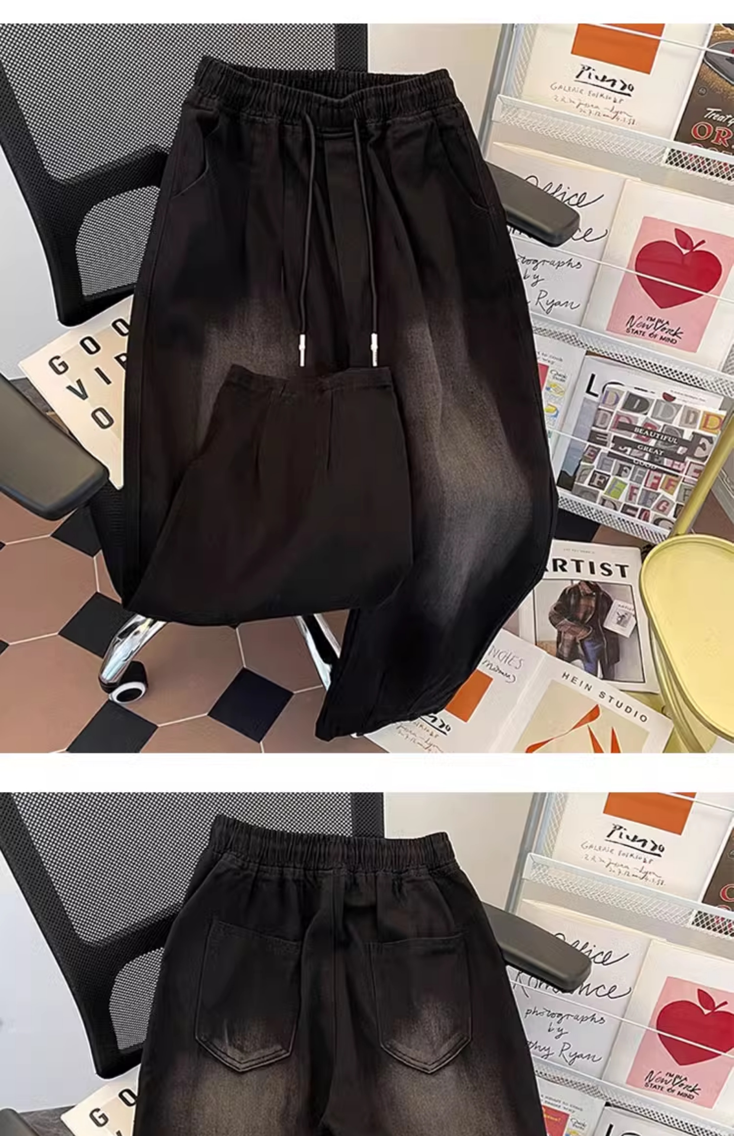 美式垂感復古牛仔褲男高街潮牌松緊腰抽繩濶腿褲子男生休閒長褲子