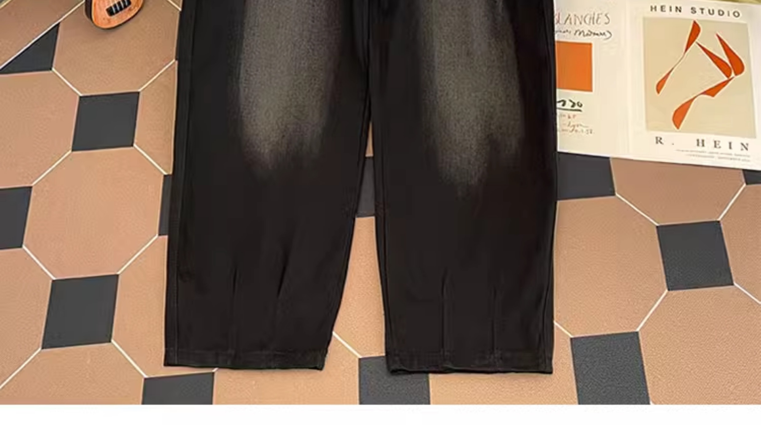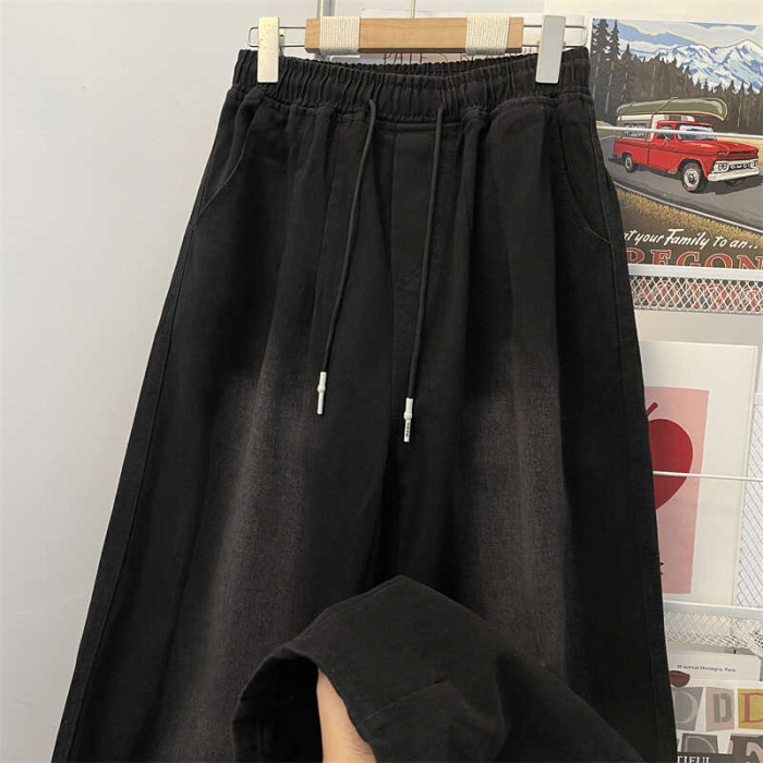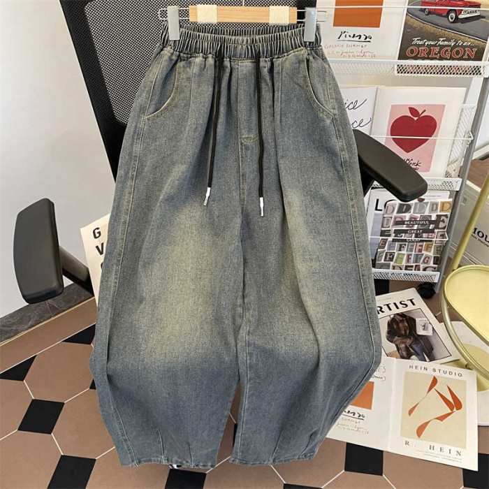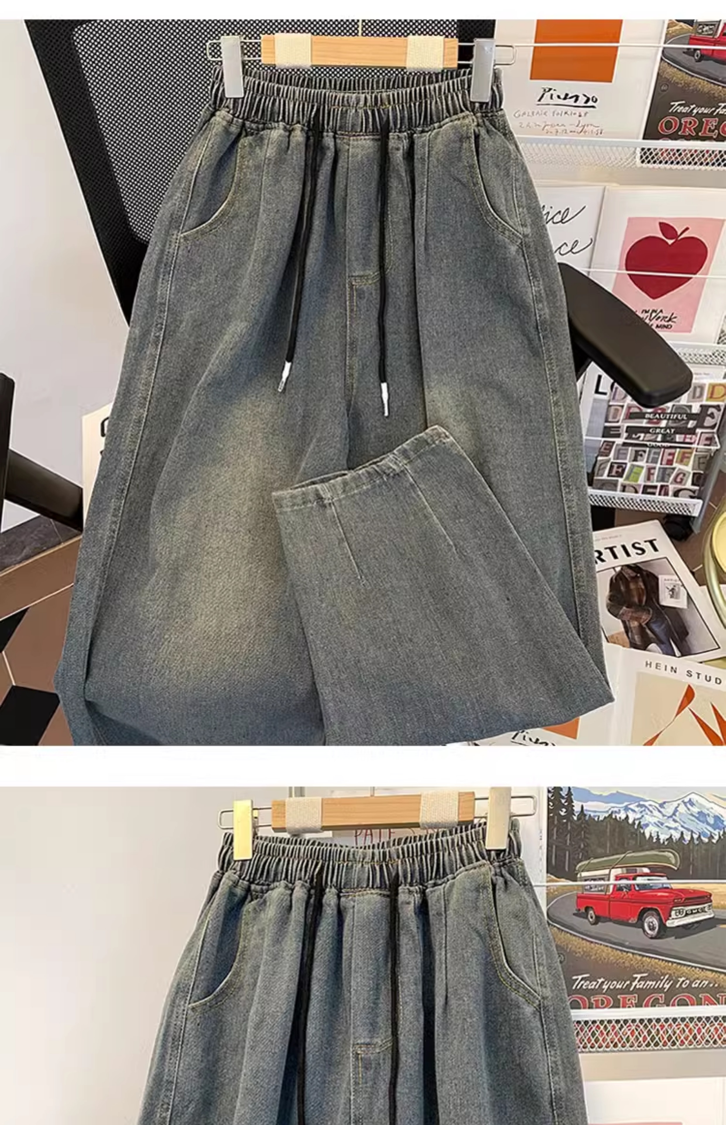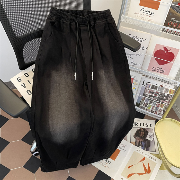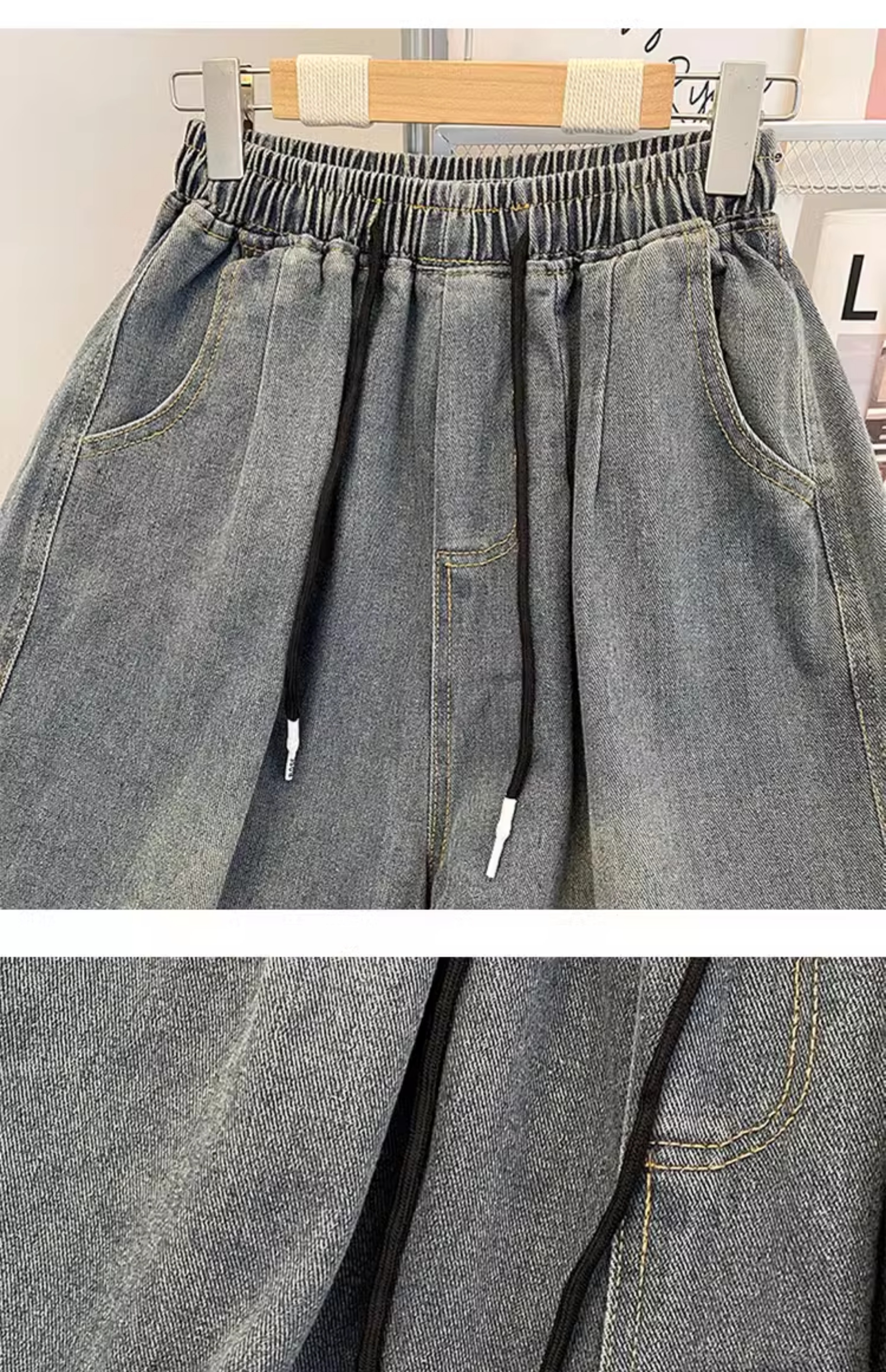 美式垂感復古牛仔褲男高街潮牌松緊腰抽繩濶腿褲子男生休閒長褲子