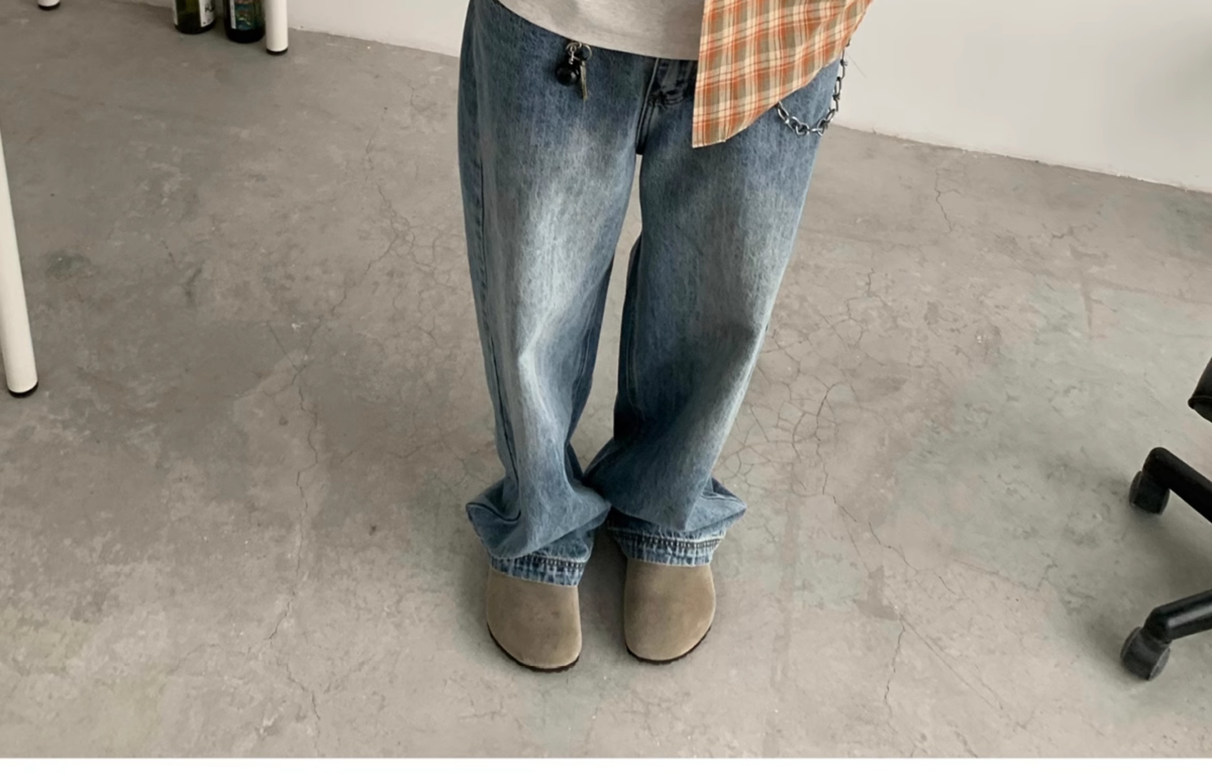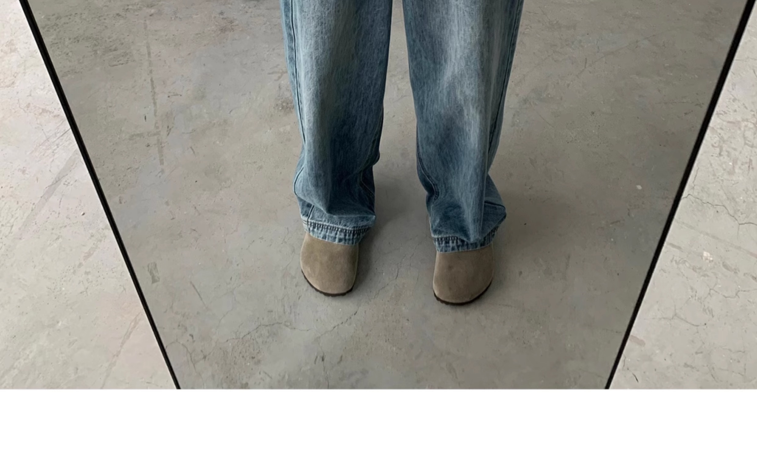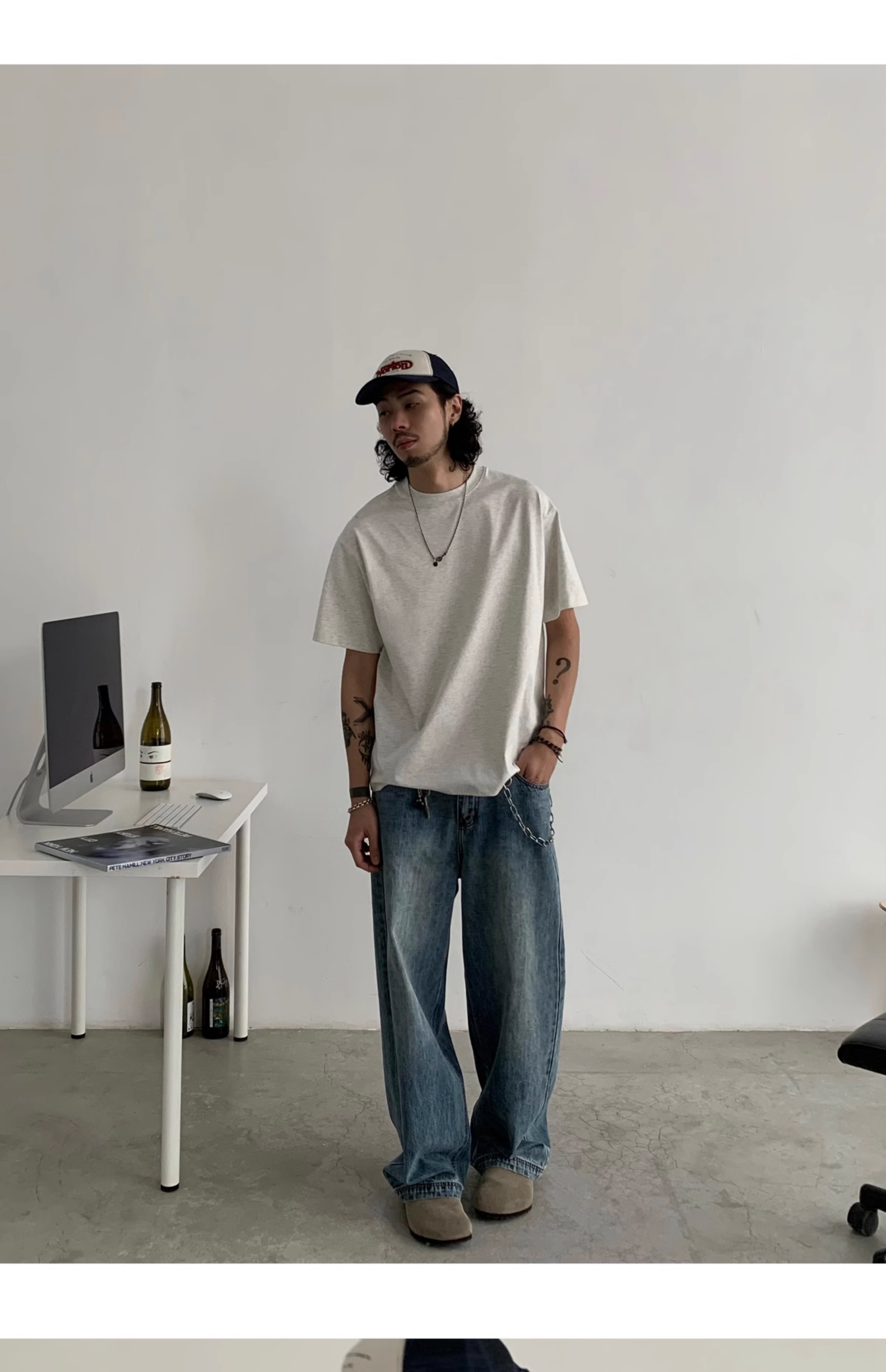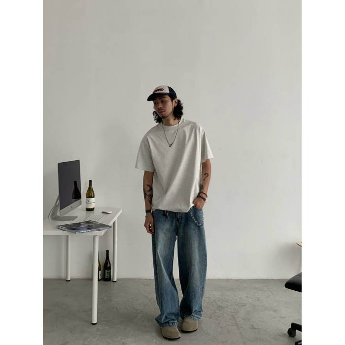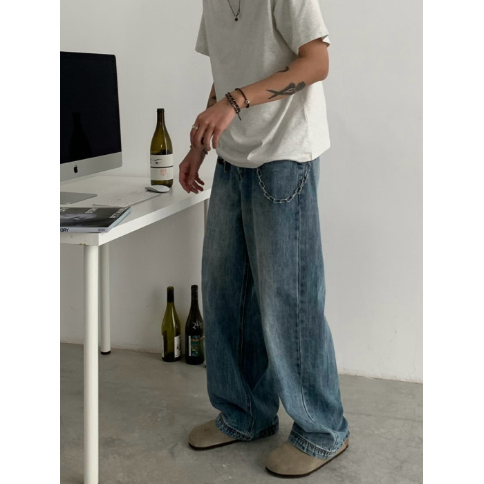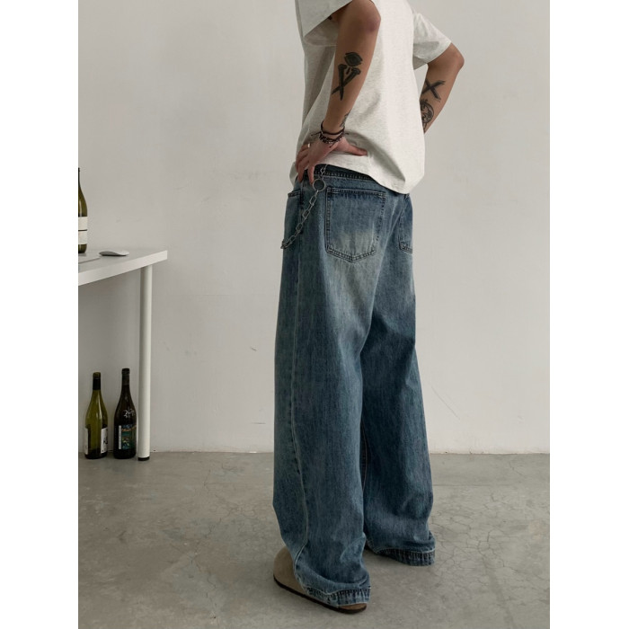 美式復古水洗爆裂紋藍色牛仔褲男vintage寬松濶腿堆堆感休閒長褲