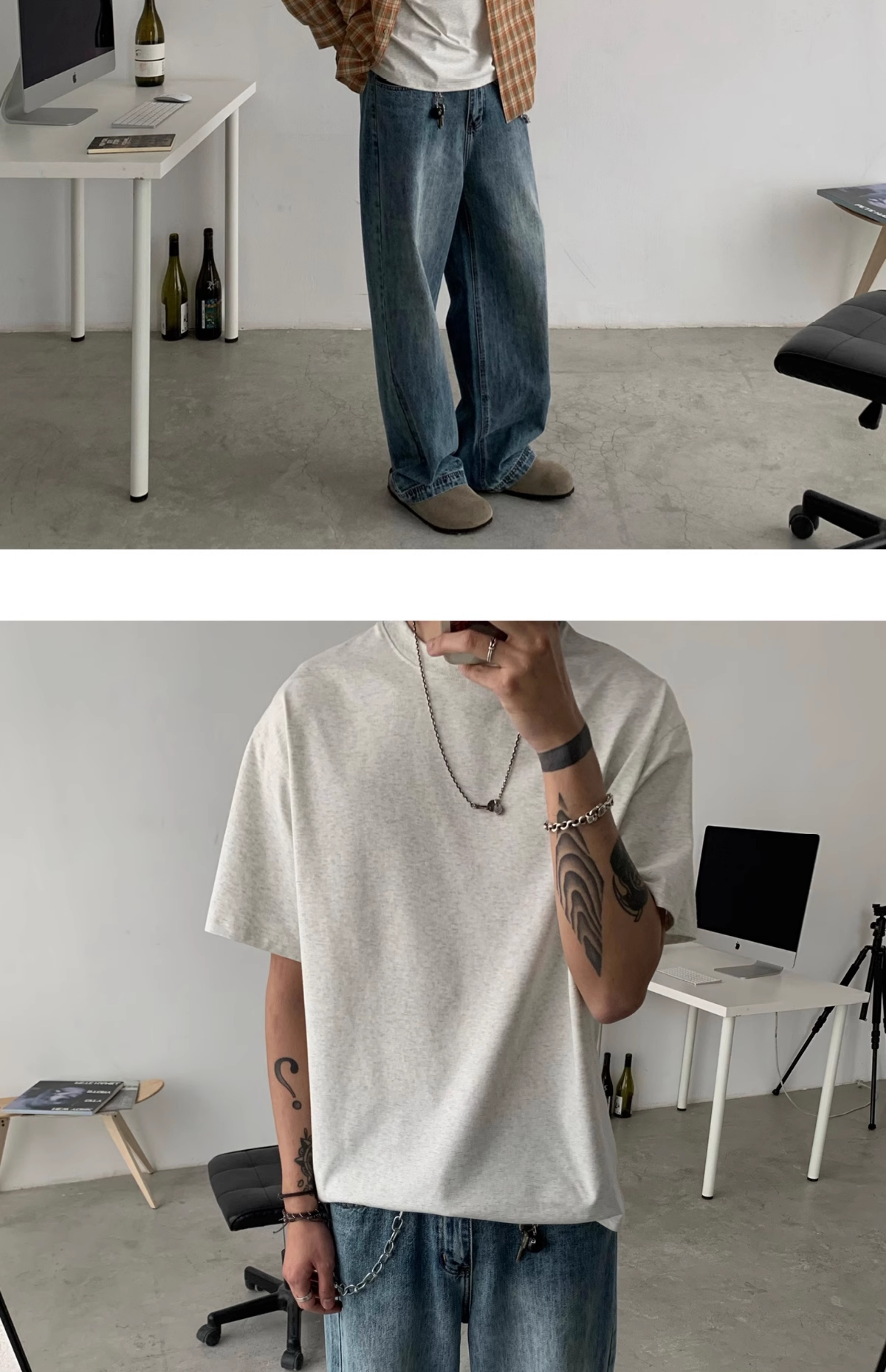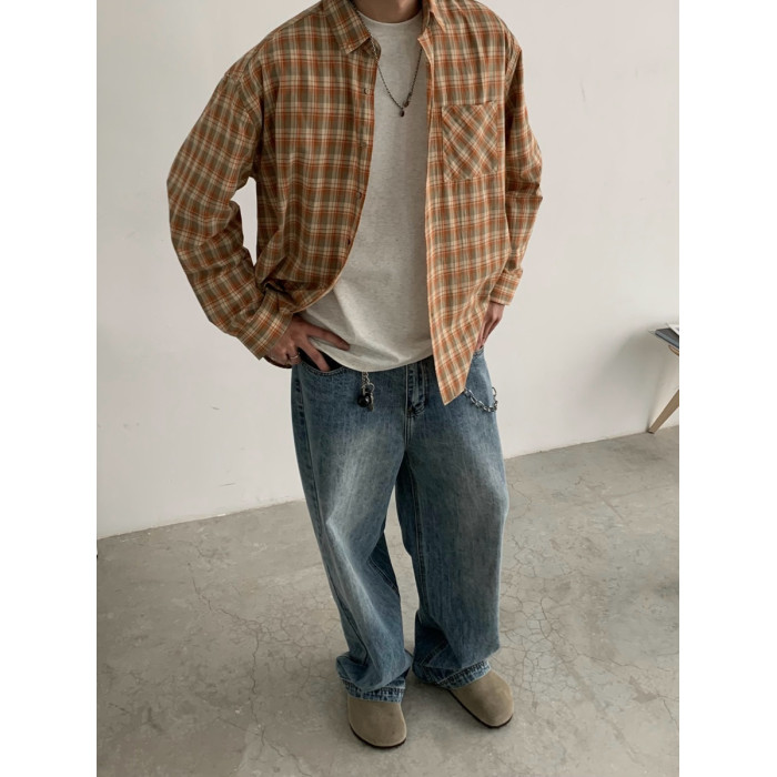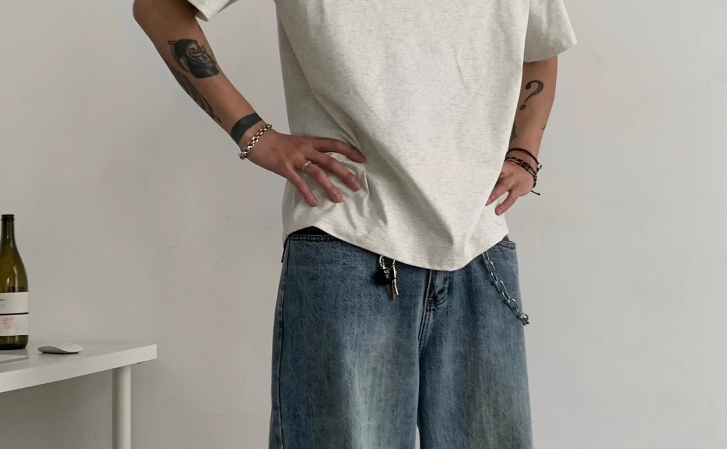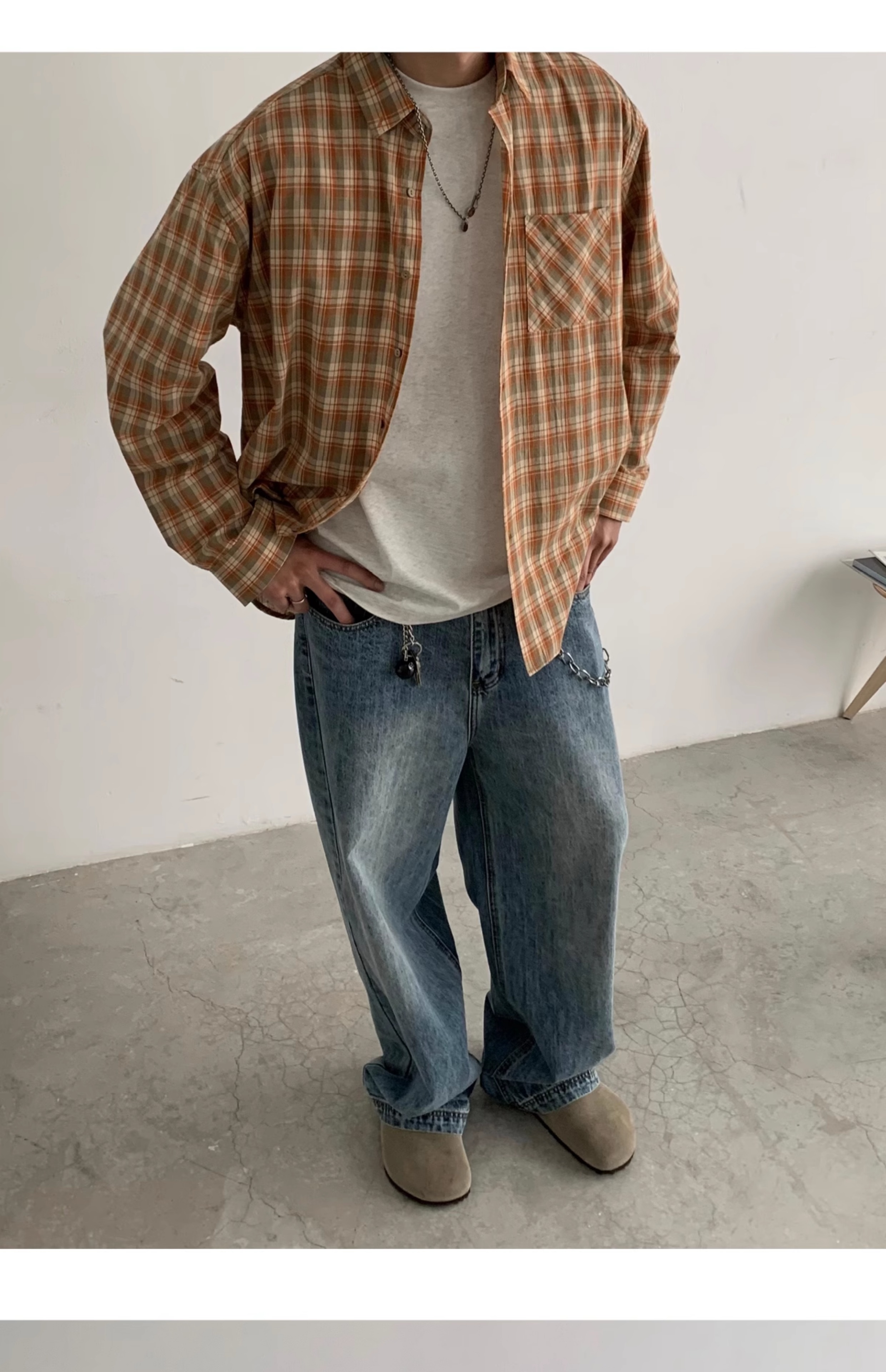 美式復古水洗爆裂紋藍色牛仔褲男vintage寬松濶腿堆堆感休閒長褲