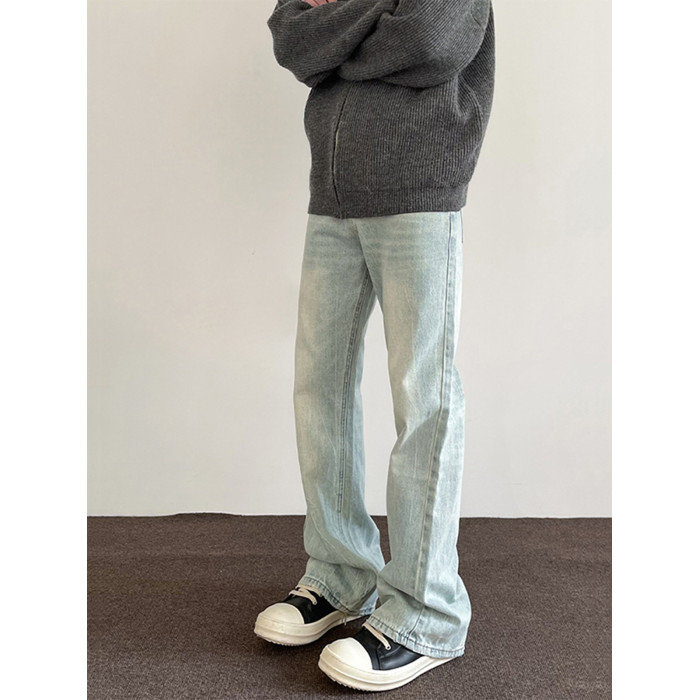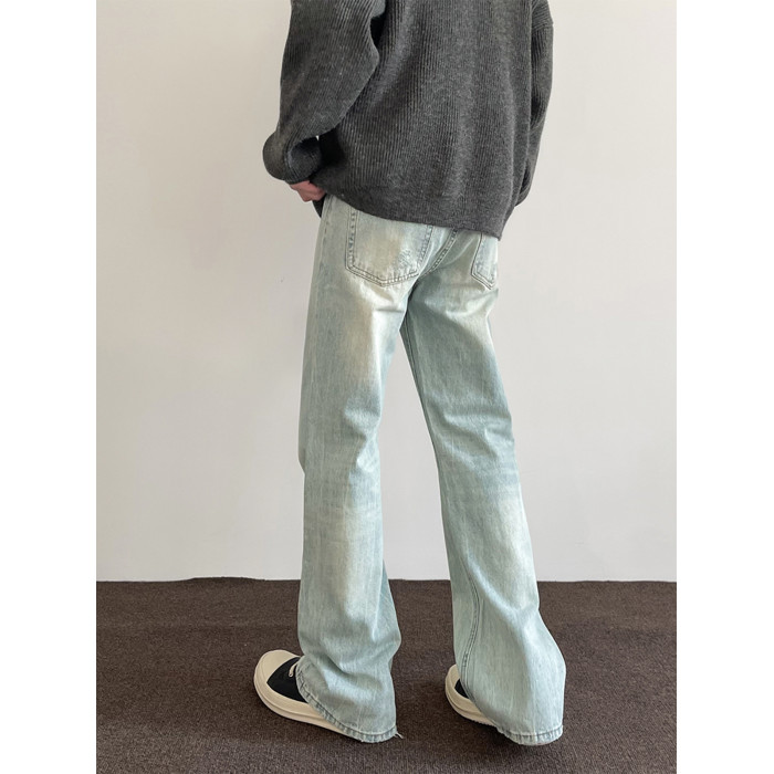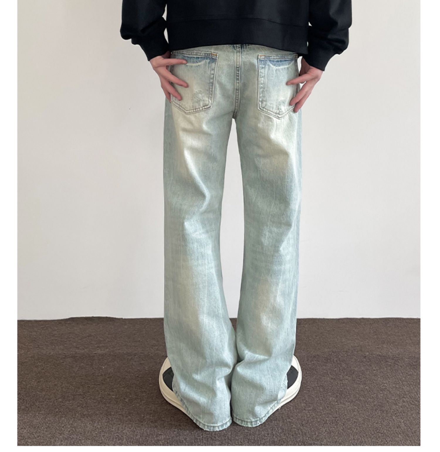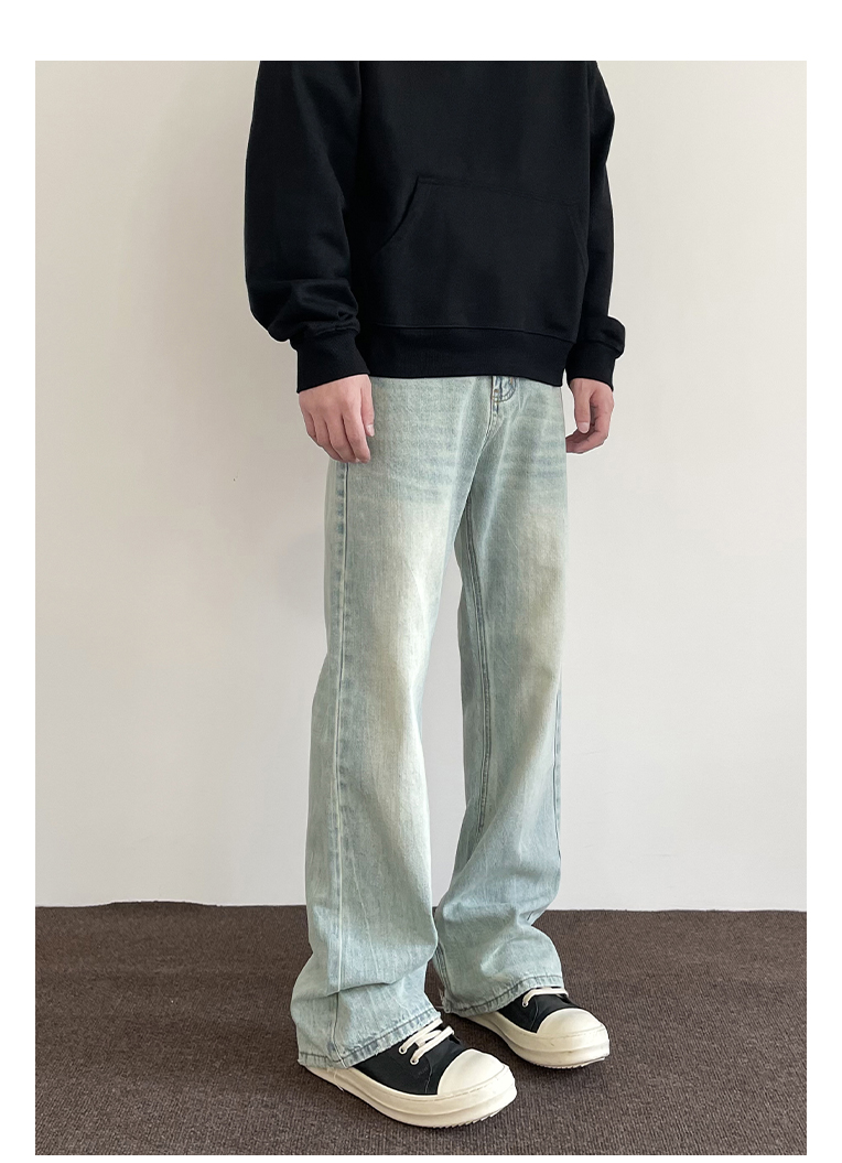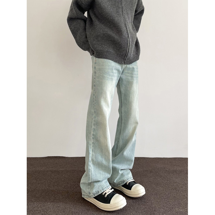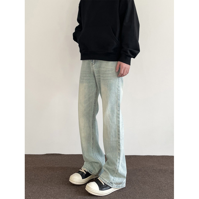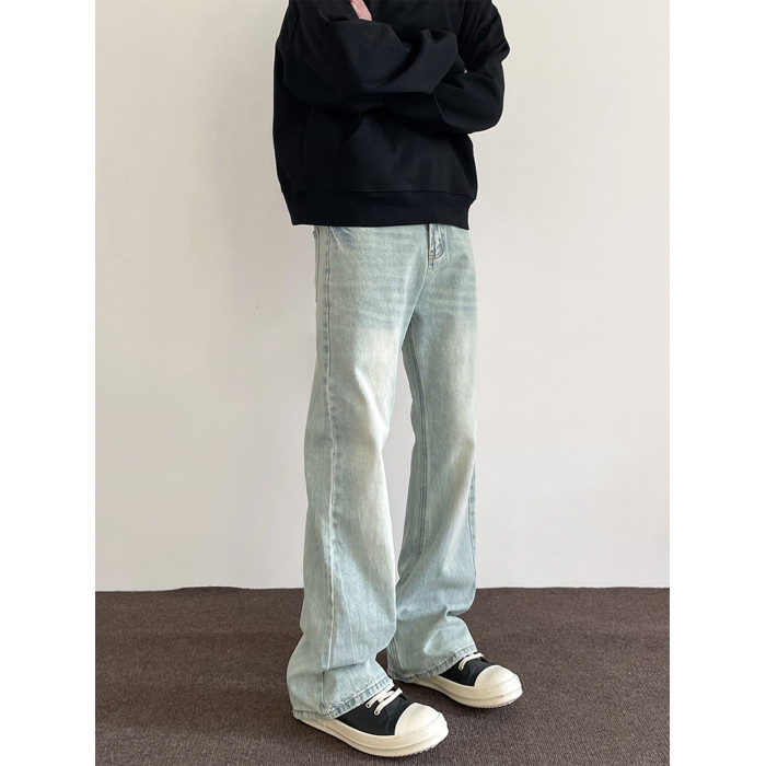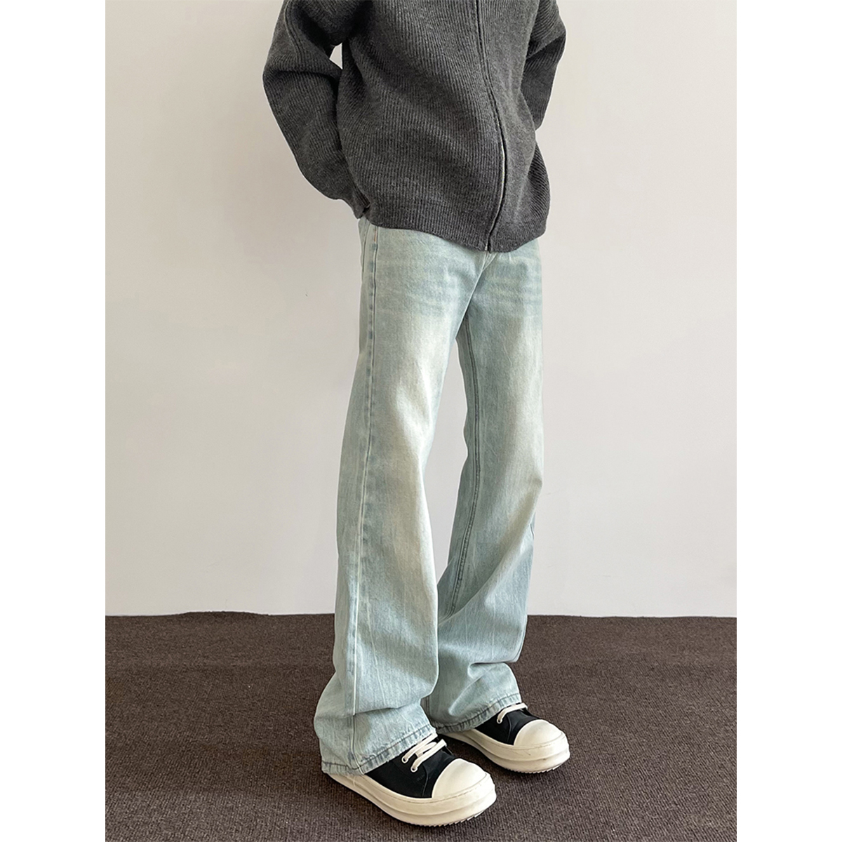 美式冰藍色水洗牛仔褲男潮牌新款高街直筒顯瘦cleanfit微喇長褲子