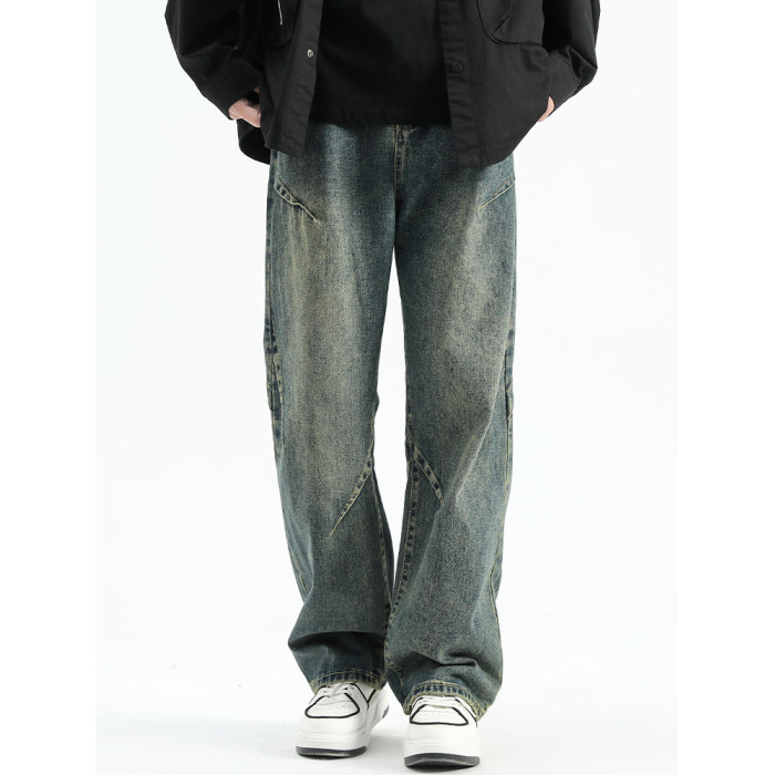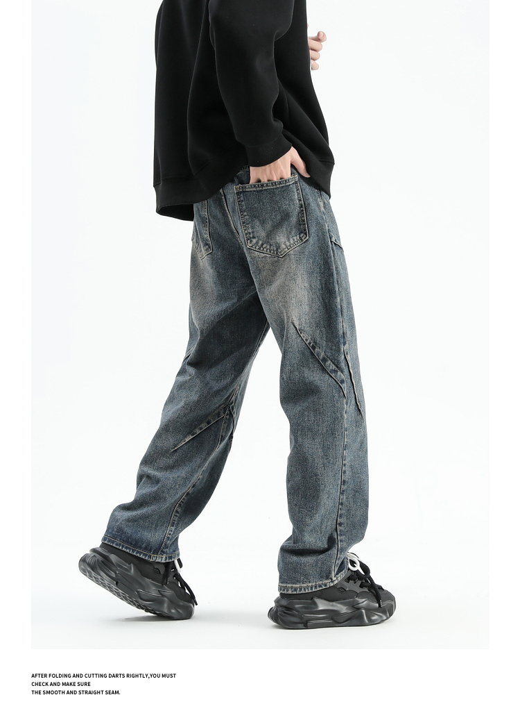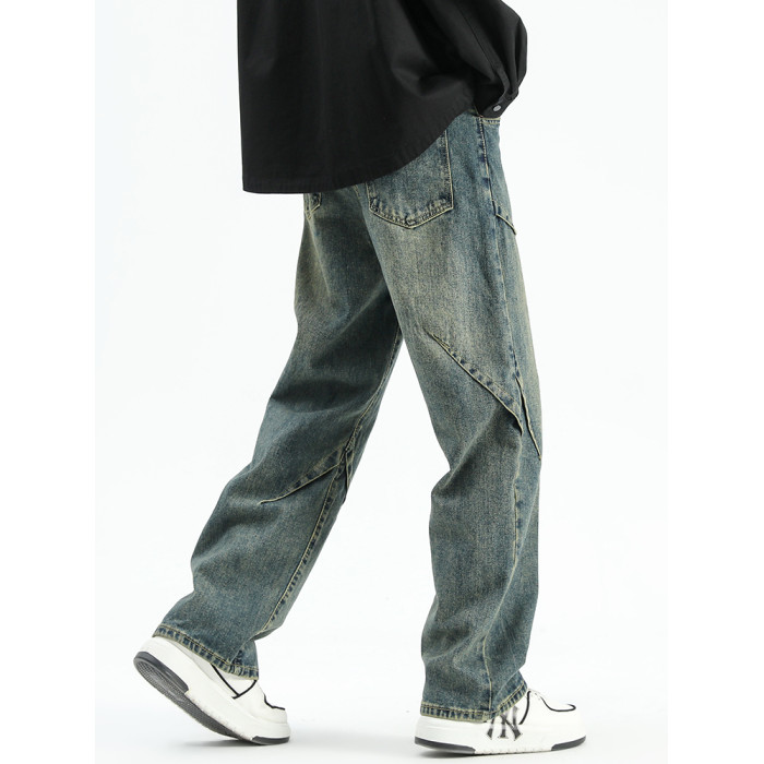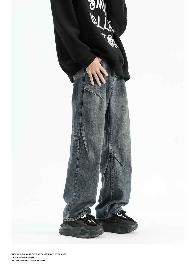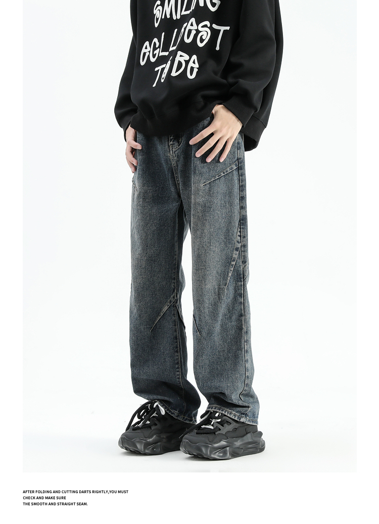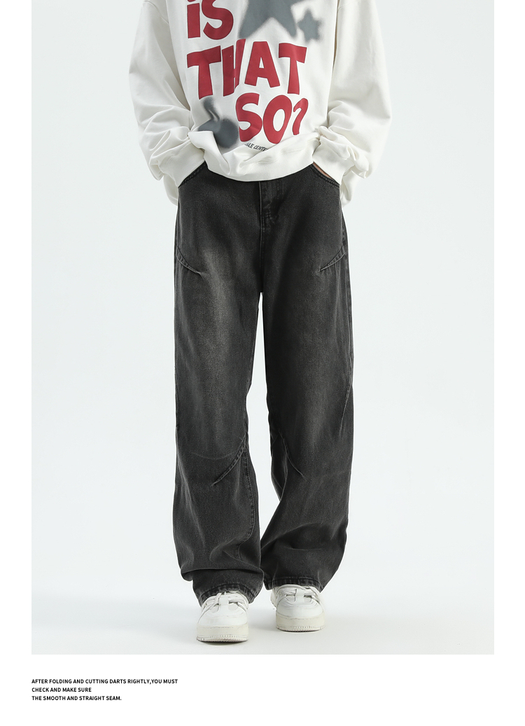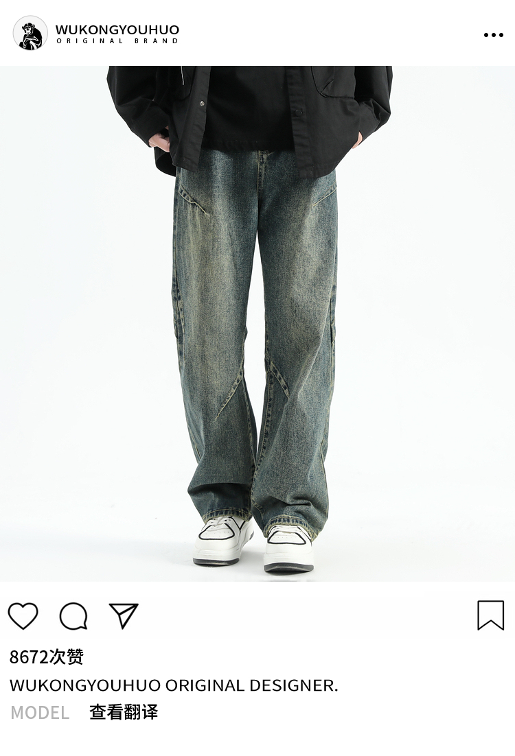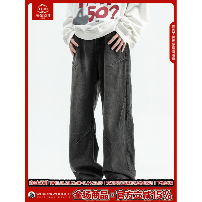 悟空有貨美式潮牌做舊小衆直筒牛仔褲男復古寬松潮流百搭濶腿長褲