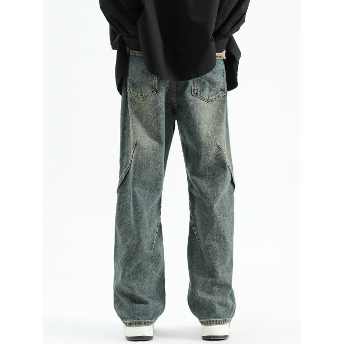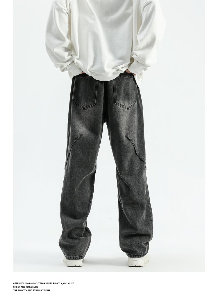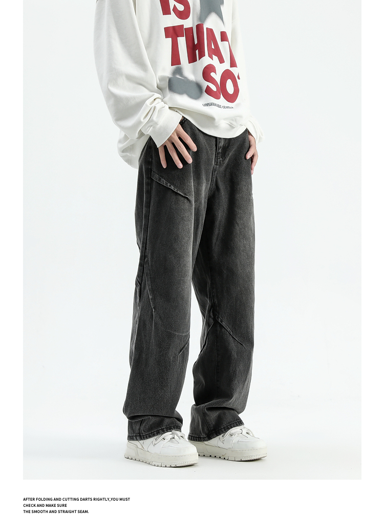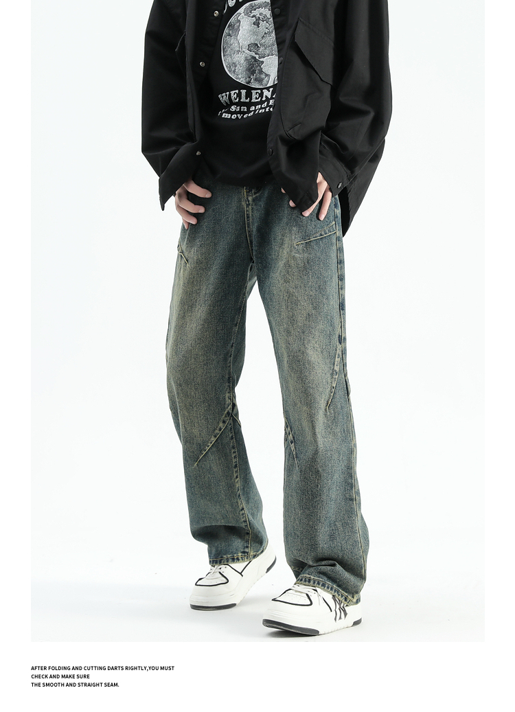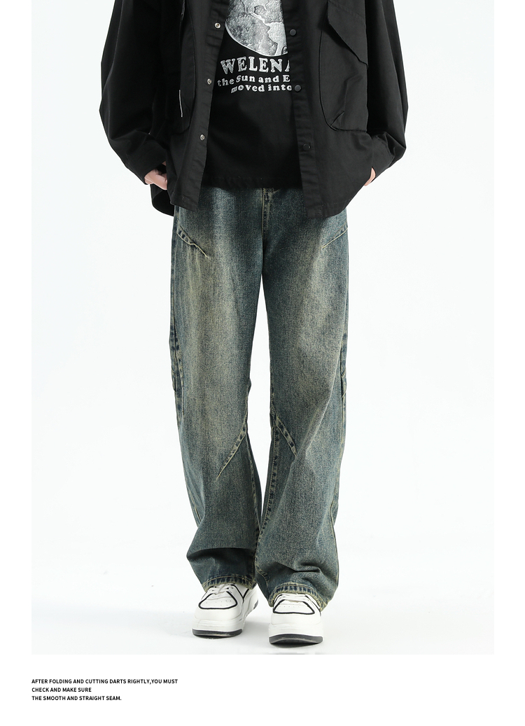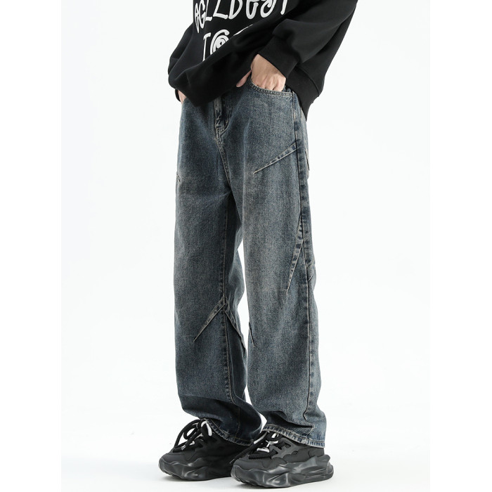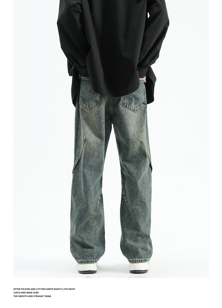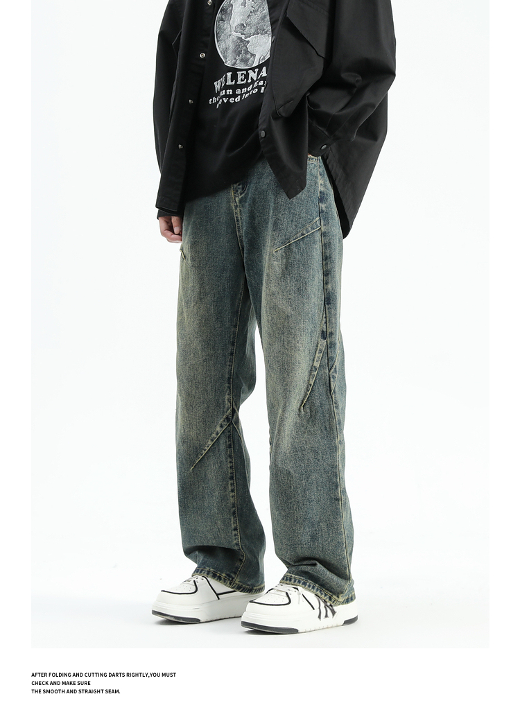 悟空有貨美式潮牌做舊小衆直筒牛仔褲男復古寬松潮流百搭濶腿長褲