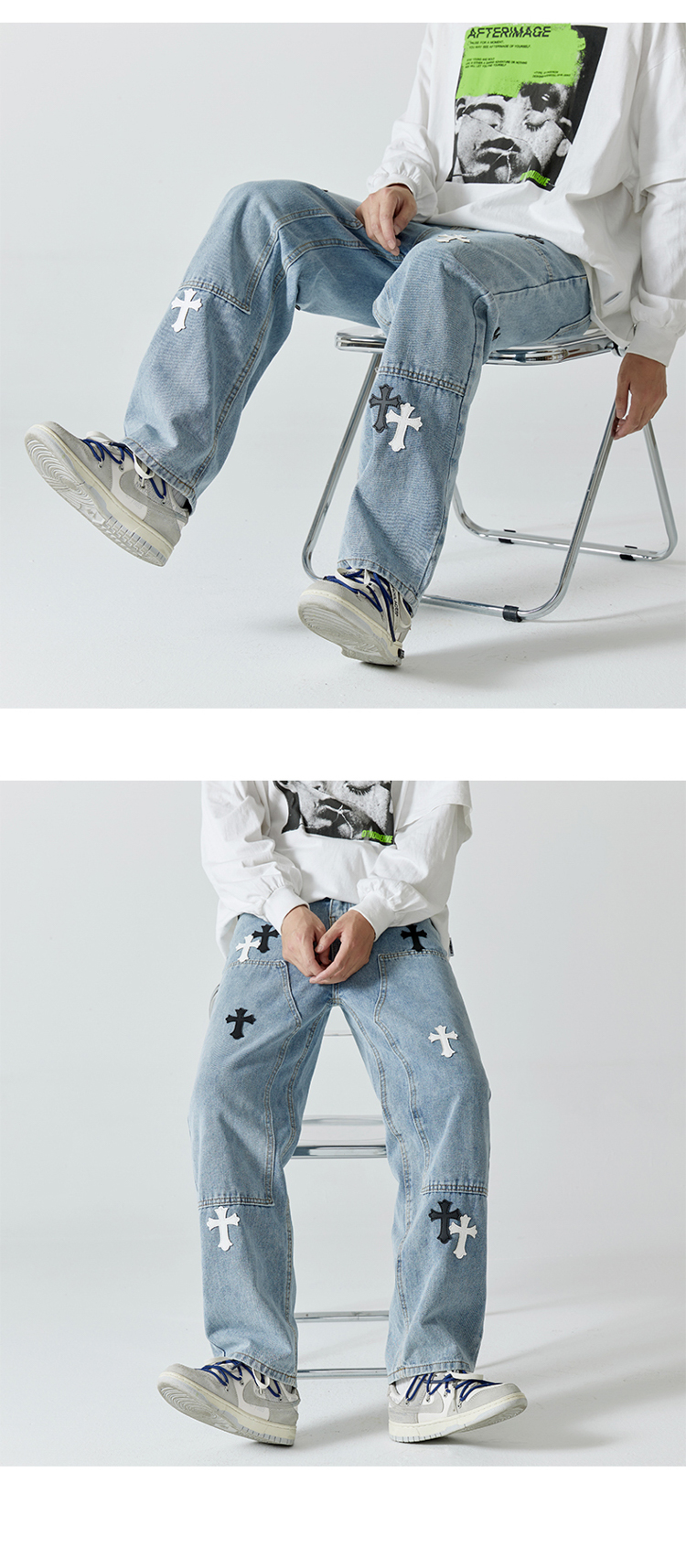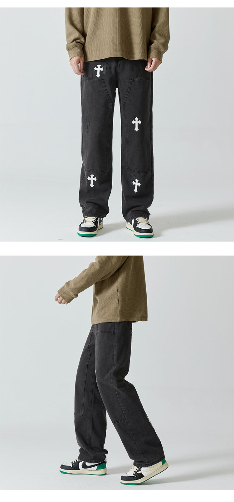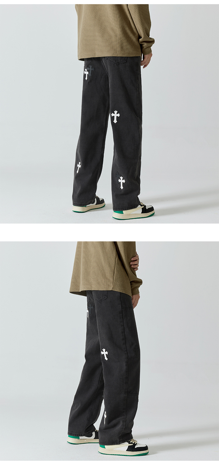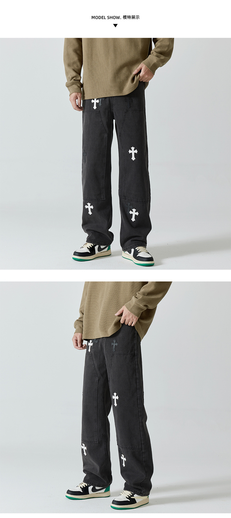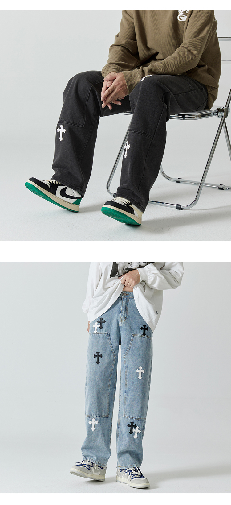 春秋季十字架牛仔褲男bf寬松直筒休閒高街潮牌設計感小衆長褲