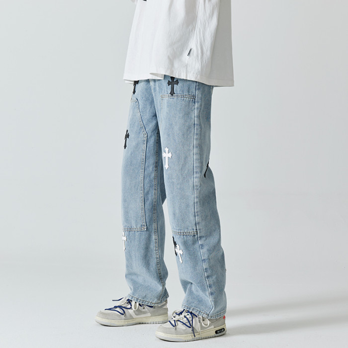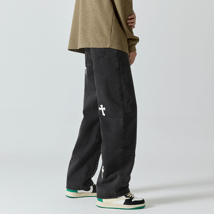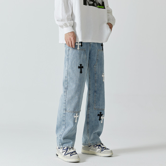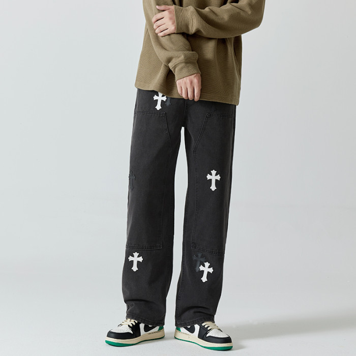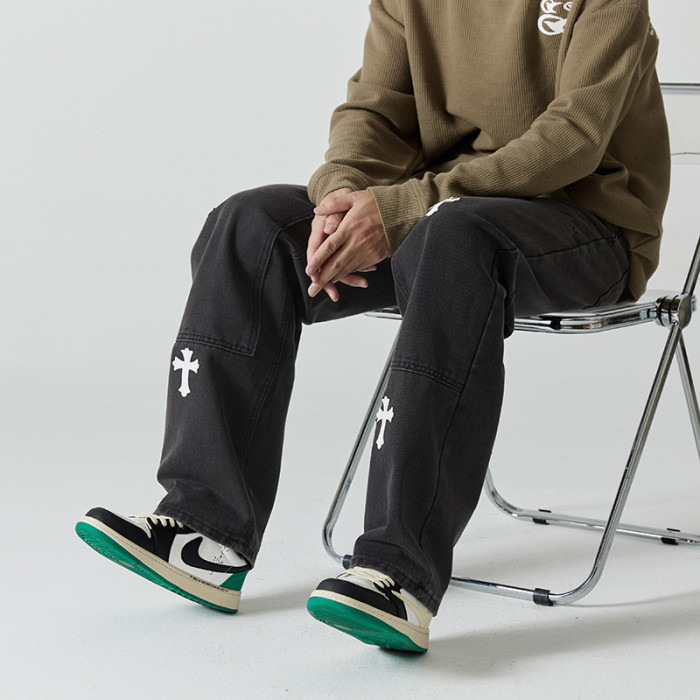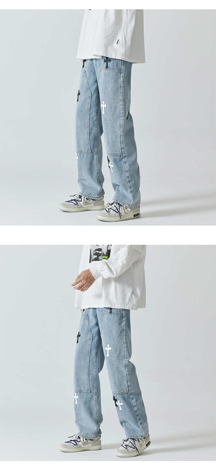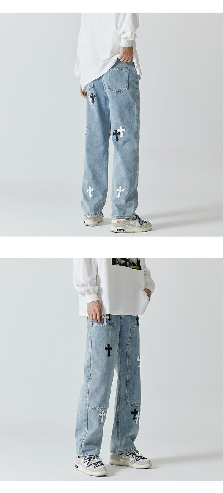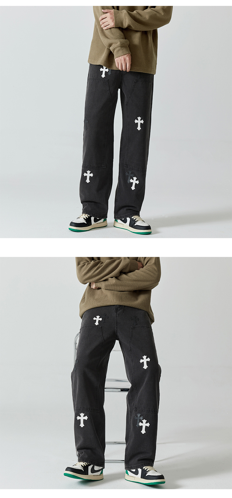 春秋季十字架牛仔褲男bf寬松直筒休閒高街潮牌設計感小衆長褲