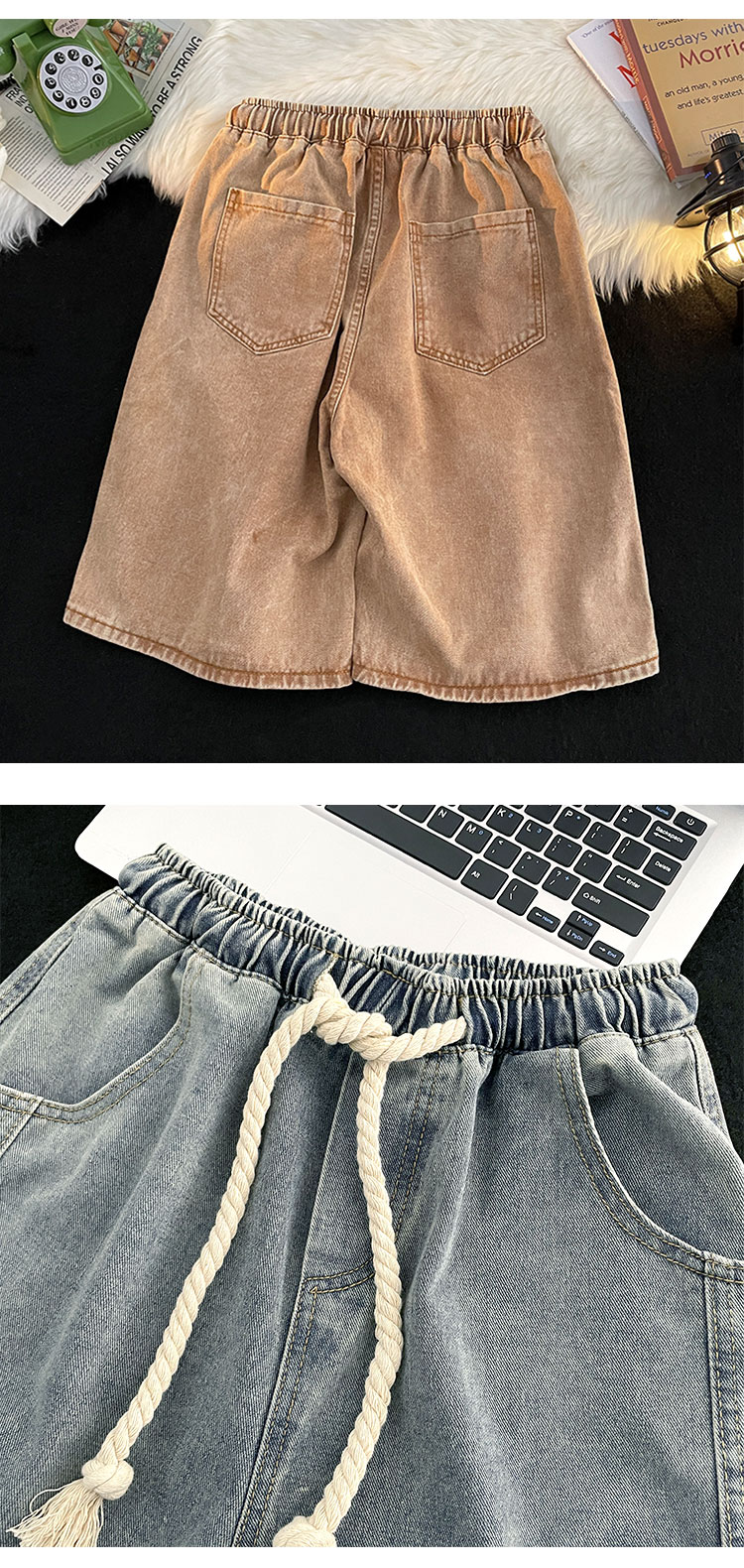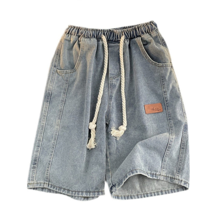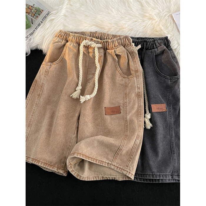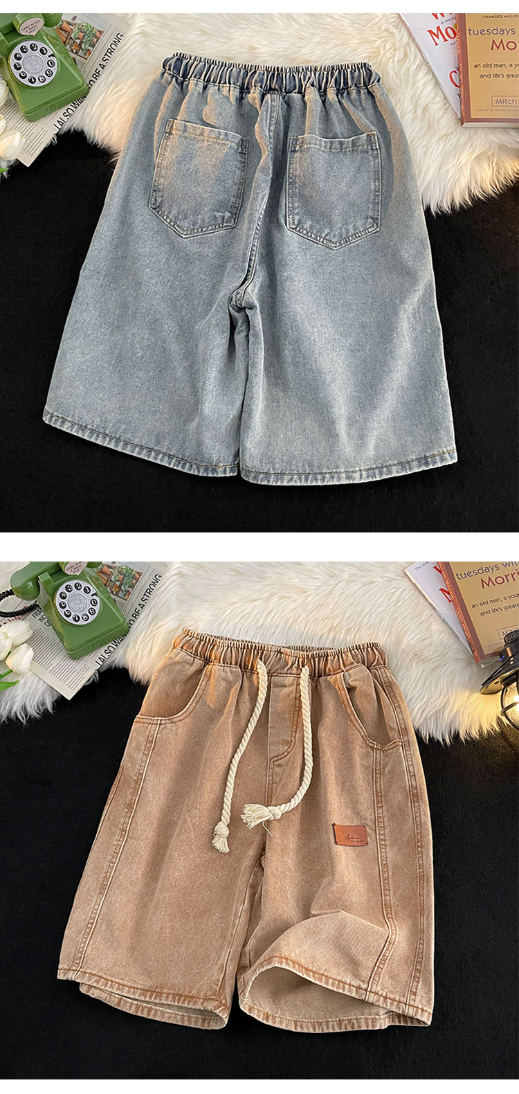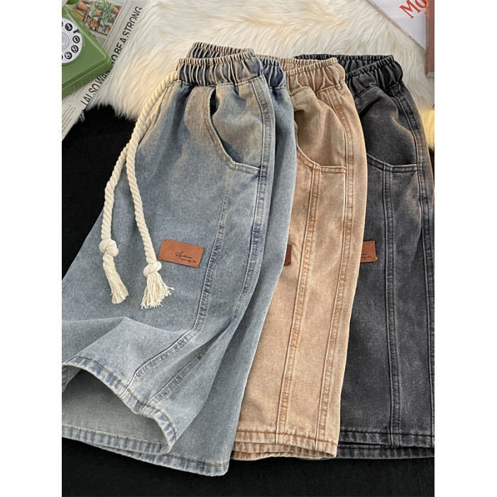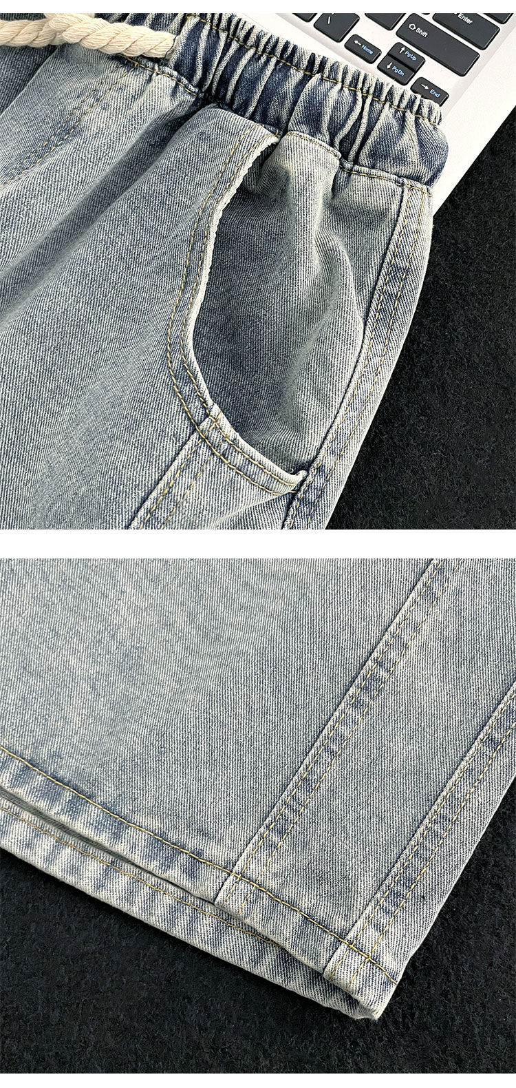 美式高街vintage牛仔短褲男款夏季潮牌痞帥寬松水洗松緊腰五分褲